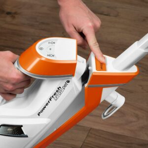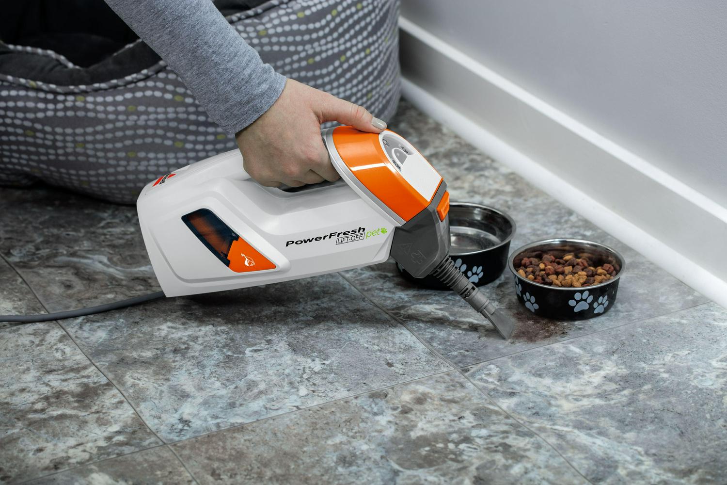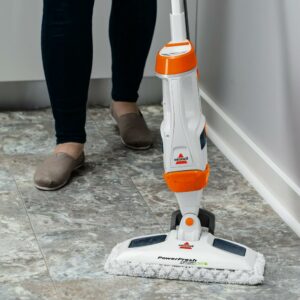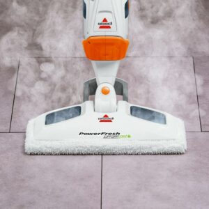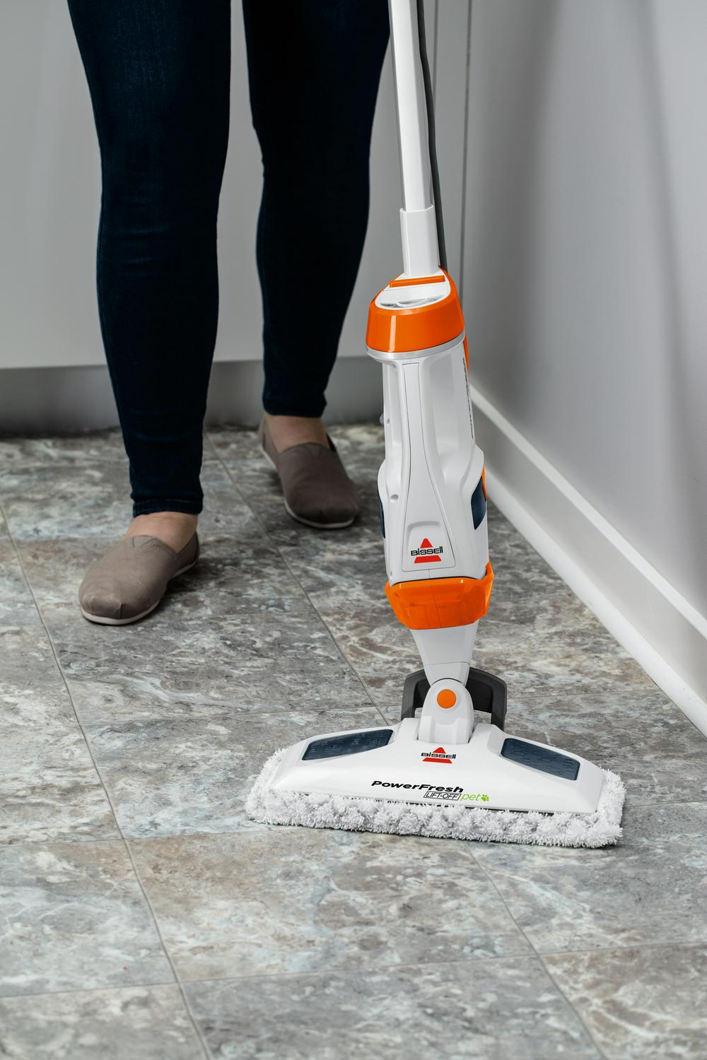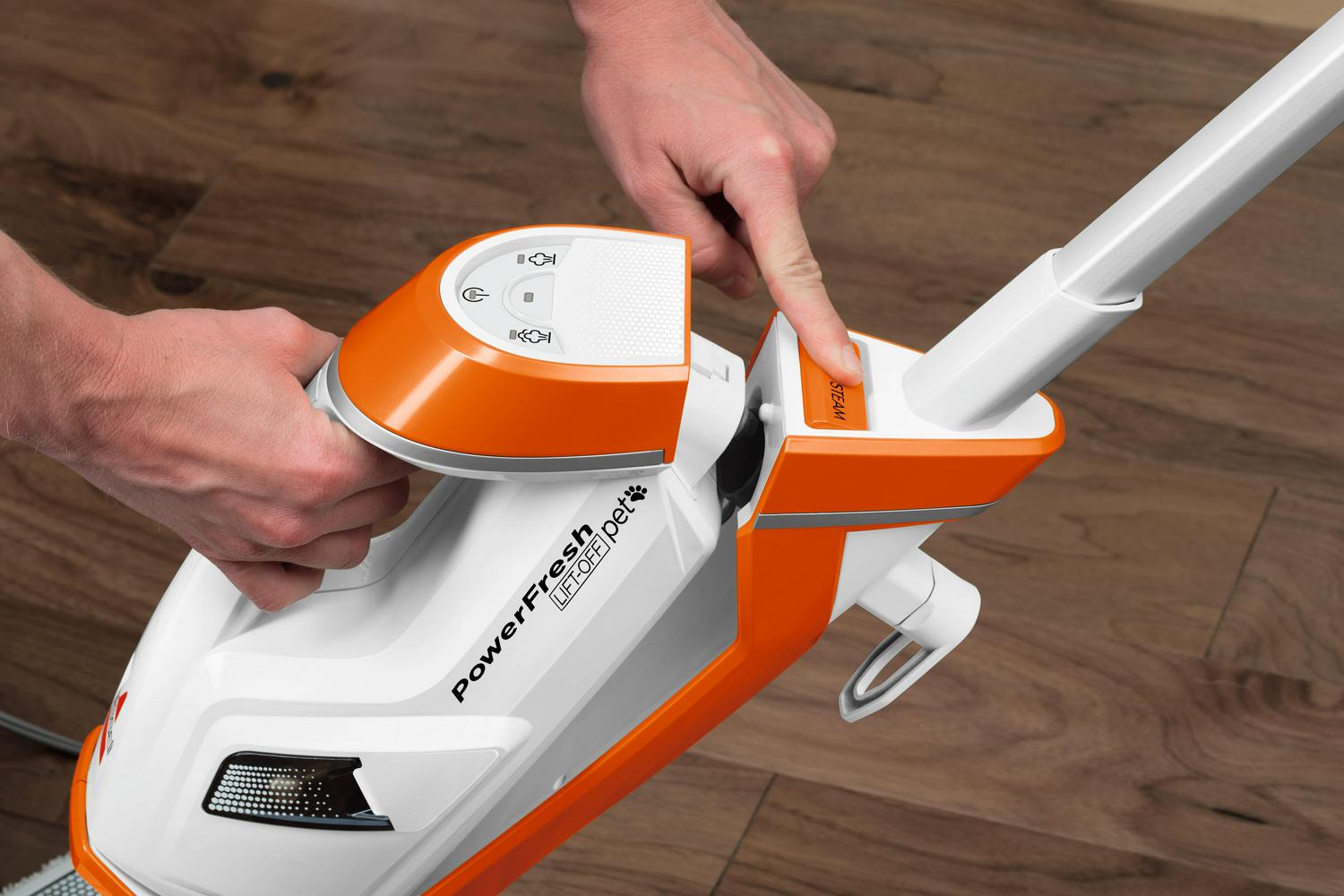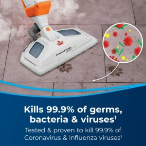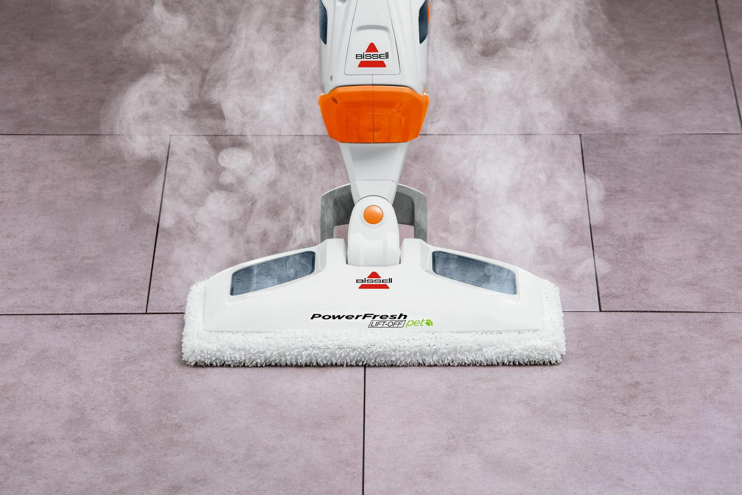 The BISSELL Power Fresh Lift OFF Pet 2-in-1 Steam Mop allows you to clean your floors and surfaces with the natural power of steam. This powerful cleaning tool is far more efficient than just using a mop and bucket to clean floors. It combines steam cleaning with multiple attachments and settings to properly sanitize the different areas of your home. The BISSELL steam mop comes equipped with tools to clean appliances, grout, counter tops, bathroom surfaces, kitchen surfaces and floors with the penetrating power of steam, effectively eliminating 99.9 percent of germs and bacteria on contact. The Power Fresh steam mop (1544a) makes easy work of some of the toughest messes, lifting stuck-on dirt and grime from hard surfaces both on the floor and above.