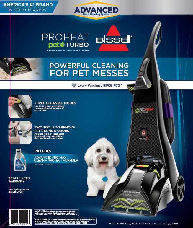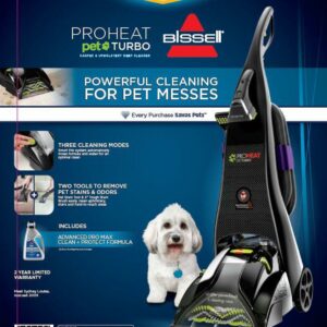 Remove deep down pet messes with BISSELL ProHeat Pet Turbo upright carpet cleaner. This machine features a six-row DirtLifter PowerBrush and powerful suction to remove embedded dirt. Spot cleaning stains is easy with the included ready-to-use PowerEase hose and tools. The 3″ Tough Stain Tool scrubs and suctions away tough stains on carpet, stairs and upholstery. The Deep Reach Pet Stain Tool uses Deep Reach Technology to send formula deep into carpet fibers. BISSELL ProHeat Pet Turbo also has a SmartMix Dial that adjusts the machine’s mix of formula and water depending on the cleaning mode you use. There are three modes to fit your cleaning needs – heavy traffic for your dirtiest carpet, normal for lightly soiled carpet and water rinse that doesn’t put any formula on your carpet. This machine also features Heatwave Technology to help maintain the water temperature throughout the cleaning process. Use with BISSELL Advanced PRO MAX Clean + Protect formula, our most powerful formula for tough, ground-in dirt and stains. And this carpet cleaner doesn’t just clean up after pets, it helps save them, too! BISSELL proudly supports BISSELL Pet Foundation and its mission to help save homeless pets. When you buy a BISSELL product, you help save pets too. We’re proud to design products that help make pet messes, odors, and pet homelessness disappear.