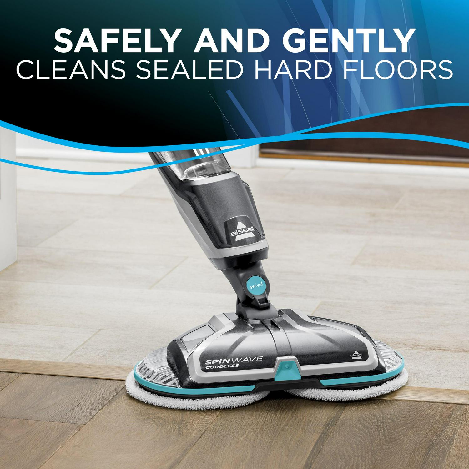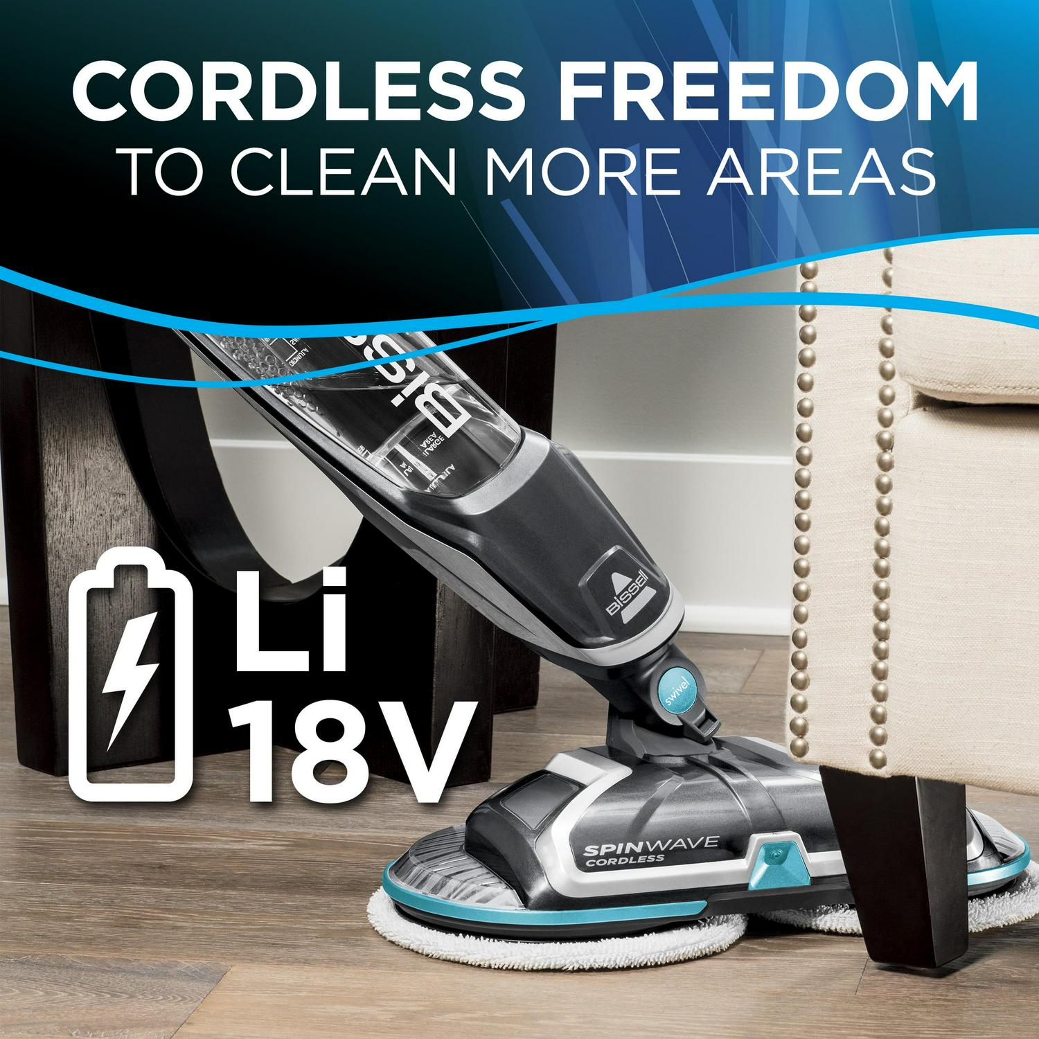 Tired of scrubbing your floors: Let the BISSELL Spin Wave Cordless Hard Floor Spin Mop, 2315A do it for you. This lightweight, spin mop glides across your floors making it easier to clean those tough, sticky messes. The rotating mop pads reduce cleaning effort by scrubbing your floors for you while being gentle and safe to use on sealed hard-surface floors such as tile, linoleum, vinyl flooring, and sealed hardwood floors. This machine comes with a set of soft-touch cleaning pads for everyday cleaning and scrubby pads for tough, sticky messes. It is also equipped with an on-demand spray that allows you to dispense just the right amount of Multi-Surface solution onto your floors. In addition, cordless convenience and swivel steering makes it easy to maneuver around and under furniture. There is an 18V lithium-ion battery that provides cordless cleaning for up to 20 minutes and an integrated carry handle makes it easier to carry this lightweight machine from room to room.