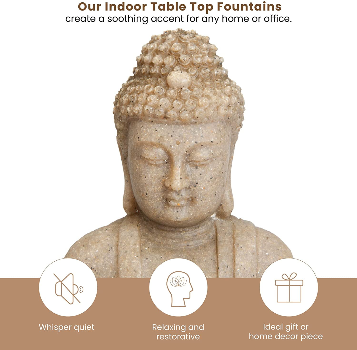 Add this restful, meditating Buddha tabletop fountain to an outdoor or indoor area of your home for a beautiful, serene accent. Experience the soothing sound of water while bringing harmony to your environment. Sculpted of polyresin to resemble old world carved stone. Measures 28cm high x 19cm wide x 14cm deep. Whisper quiet concealed pump, power cord, and instructions included. For indoor and covered outdoor use.