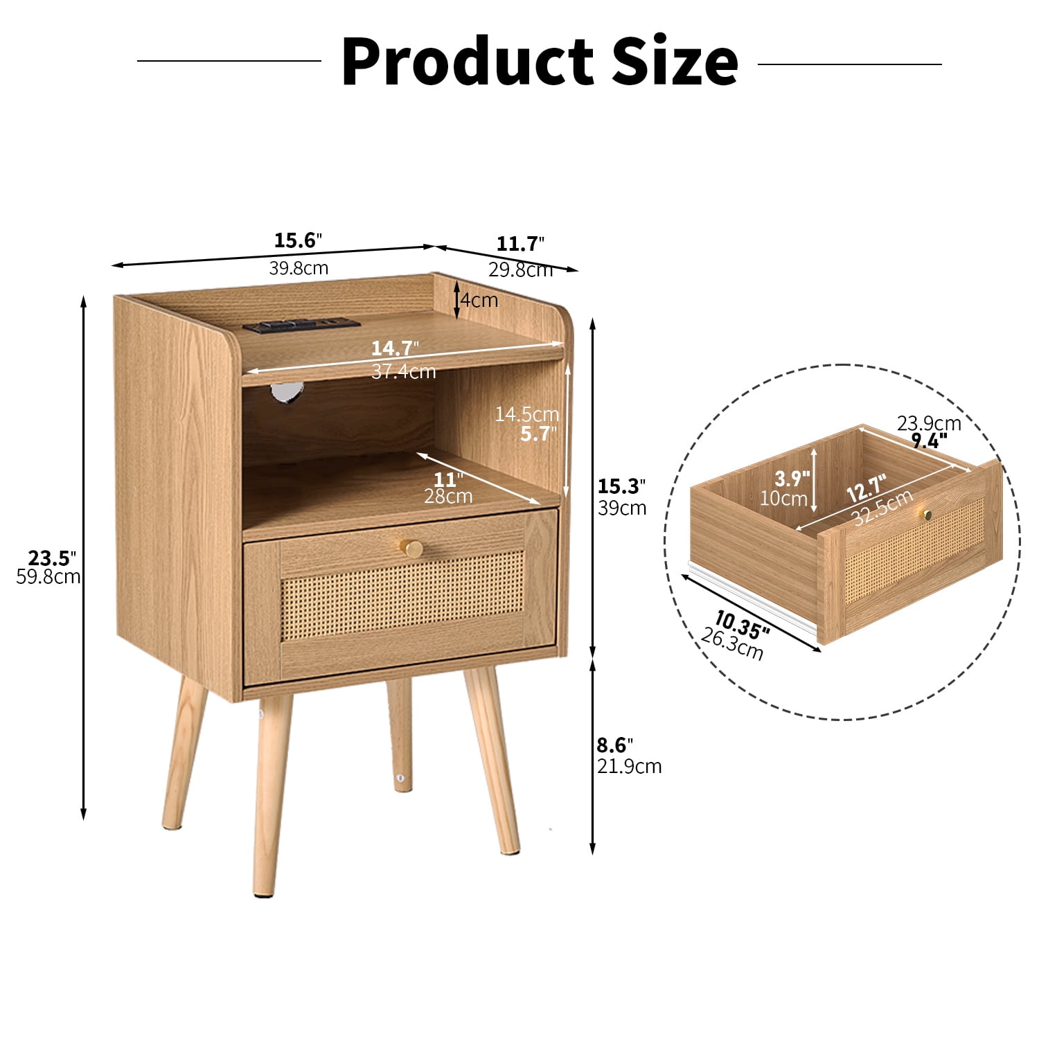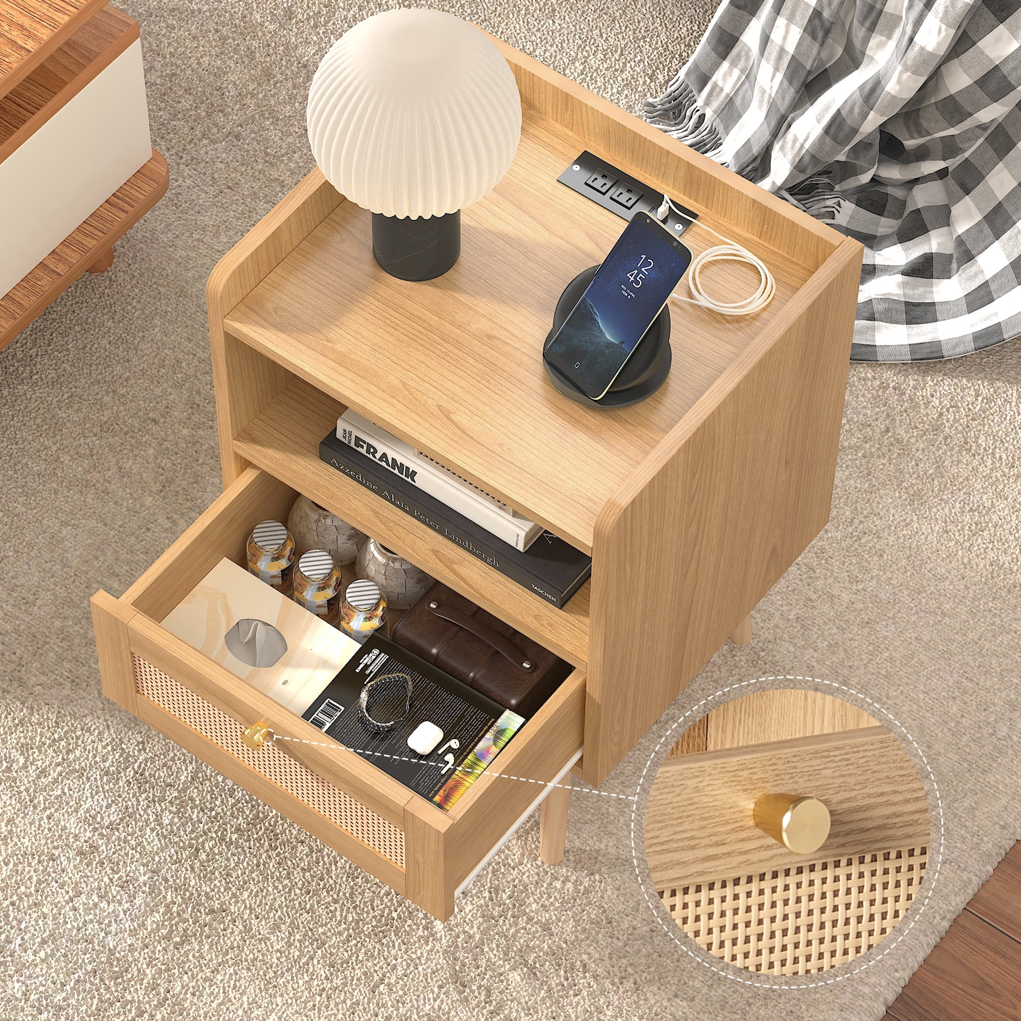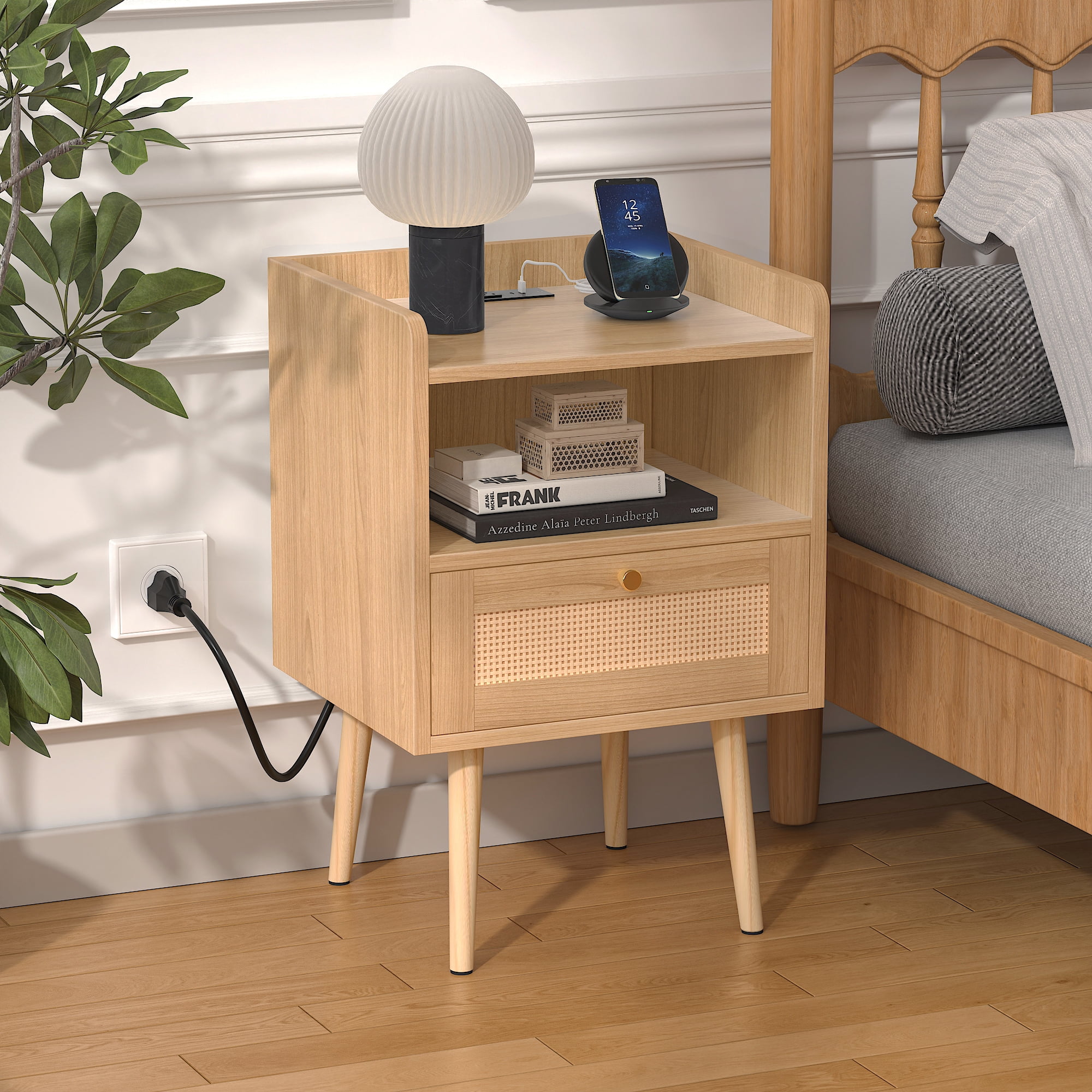 Natural rattan decoration: The drawer facade of the bedside table is ingeniously woven with natural rattan strips, cleverly blending the modern simplicity of the mid-20th century with the romantic charm of Bohemia. The two tone design gives the space a warm yet fashionable touch, making every touch full of natural charm. Space utilization: The design balances compactness and spaciousness, with open shelves at the top and middle paired with wicker drawer doors. Not only is it aesthetically pleasing, but it also provides a flexible and versatile storage solution. Whether it’s books, miscellaneous items, or small nighttime objects, they can be properly placed to showcase the aesthetics of life while maintaining a clean and orderly space. Exquisite craftsmanship: The main body of the bedside table is made of carefully selected engineered wood, complemented by delicate textured finishes, showcasing an extraordinary texture. Paired with tapered solid pine legs, it provides stable support while adding a touch of rustic and natural atmosphere. The rattan drawer panel is a reflection of handmade art, and every detail reveals the craftsman’s dedication and perseverance. Durable and Stable: Made of high-quality pine wood for the legs, combined with reinforced seam technology, ensuring that the bedside table remains stable and strong in load-bearing capacity even during long-term use, providing reliable protection for your home life. Intelligent Charging: Built in intelligent charging station, equipped with 2 standard three hole sockets and 2 USB charging ports, meeting various charging needs. The 6.5-foot long power cord design facilitates flexible placement according to spatial layout, making charging simple and fast, and enjoying the convenient life brought by technology. Multi functional application, flexible and versatile: This bedside table is not only an ideal companion for bedrooms, but can also be flexibly applied to living rooms, home offices and other spaces as a side table, coffee table or storage cabinet. Its elegant appearance combined with practical functions easily blends into various home styles, making it the perfect choice for organizing bedtime reading materials, decorative ornaments, plant fragrances, and other items, adding a touch of brightness to the living space. Golden handle: The exquisite golden drawer handle not only enhances the overall beauty, but also highlights extraordinary taste and style in the details. Every opening and closing is a pursuit and enjoyment of quality life.