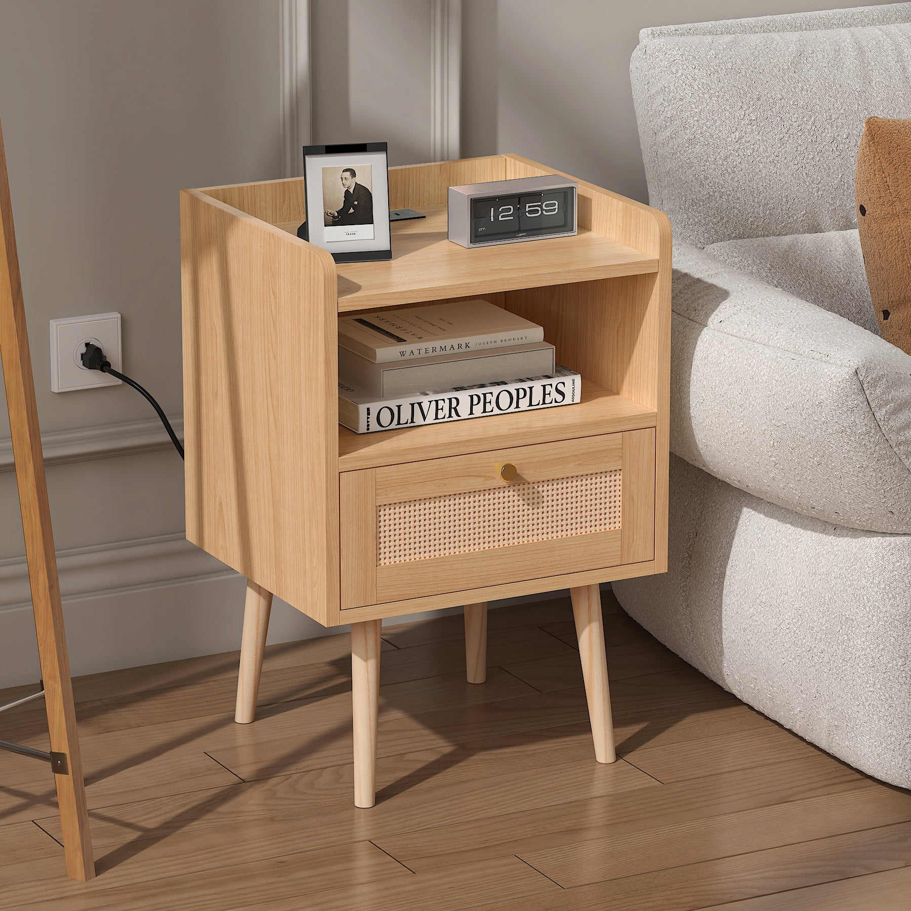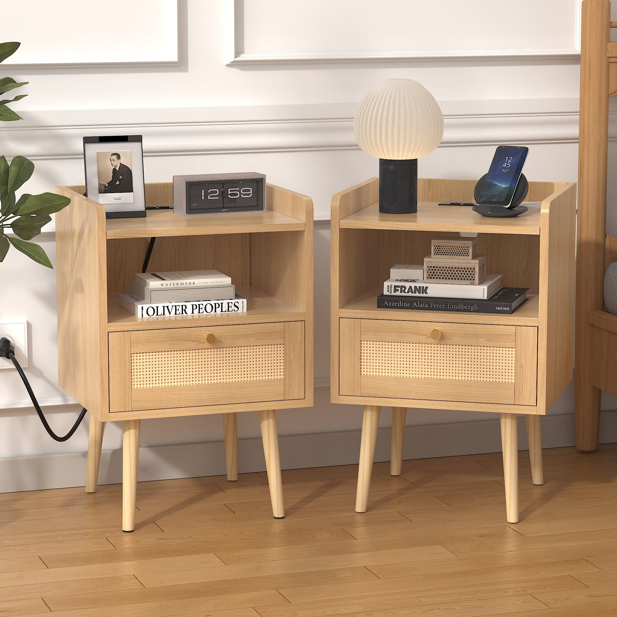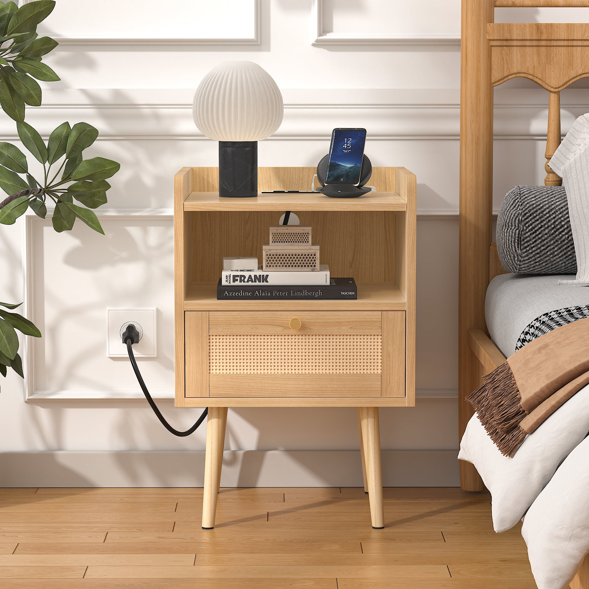 Biuhony Rattan Nightstand with Solid Wood Legs,Bedside Tables Rattan Drawers with Charging Station for Bedroom and Living Room