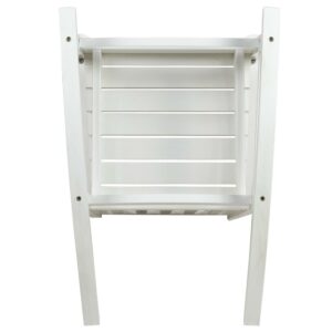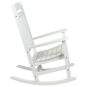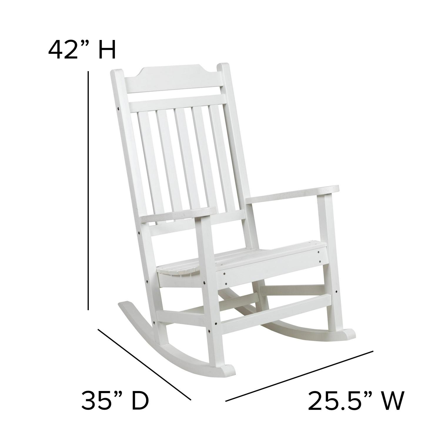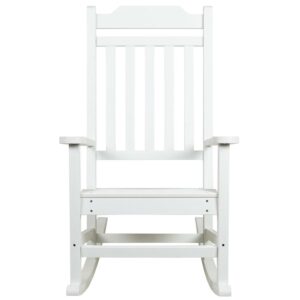 Take a break from your day and hang out on your front porch, patio or deck in this all-weather white poly resin rocking chair. No matter your decorating style, the traditional slat back and seat design give a classic but on-trend look to this colorful rocking chair. The full-back design will support you in all the right places while the sloping runners provide smooth rocking motion to keep you cozy and relaxed.