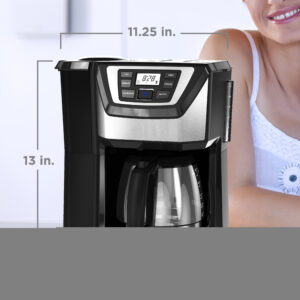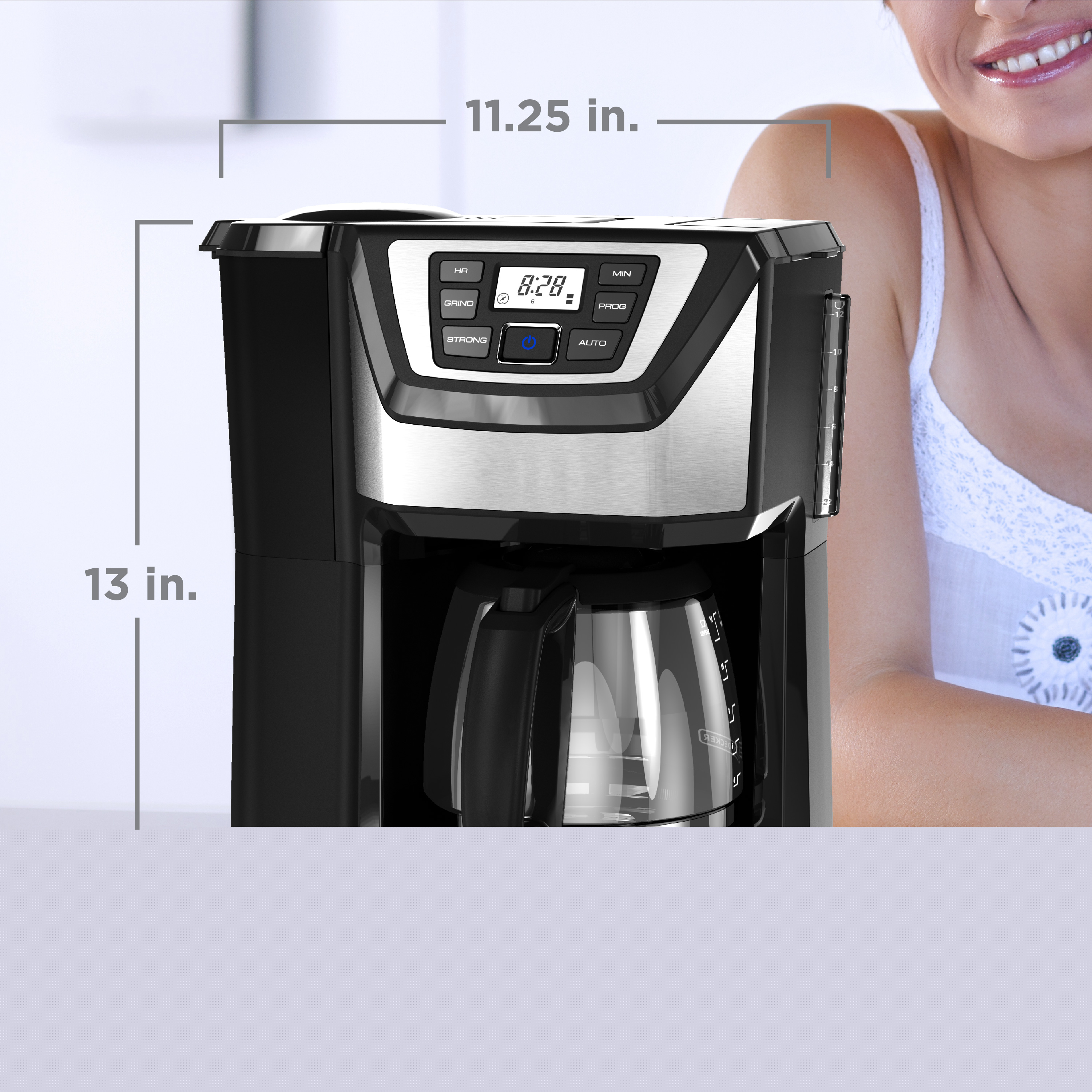 Integrated Grinder/Brew Filter – The innovative design combines the coffee grinder with the brew filter basket for fast, fresh brewing and simple cleanup Streamlined Grinding and Brewing – Fresh coffee, fast, the all-in-one design makes it easy to grind whole beans, giving you the full flavor and aroma of your favorite beans every time Whole Beans or Grounds – Brew your favorite cup, the grinder quickly prepares whole beans, and it can be turned off for normal brewing with pre-ground coffeeCustom Brewing – Use the brew strength selector for coffee that fits your taste, options for regular, bold, and strongQuickTouch Programming – Easily program the 24-hour auto brew feature so you can wake up to a fresh pot of coffee, plus, the backlit display highlights the time and the program you choose