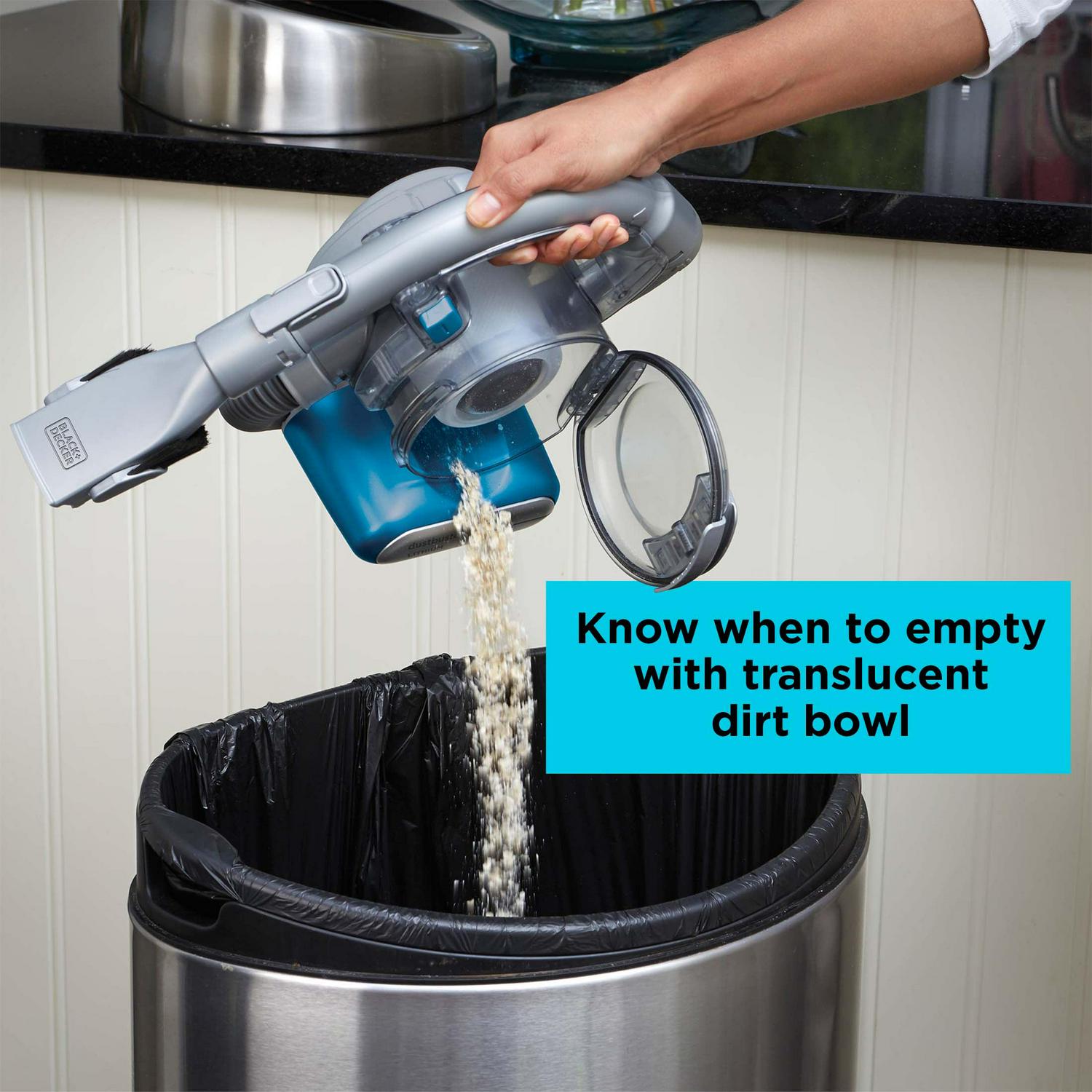The black+decker HHVI325JR22 Dust buster cordless lithium hand vacuum, ink Blue, is ideal for picking up dirt and debris in your everyday life. The lithium technology provides strong suction and extended run time. It has a washable bowl (20.6Oz) and filter which allows for thorough cleaning between Jobs. The translucent, bagless dirt bowl makes it easy to see dirt and easy to empty. This vac has a rotating nozzle for a comfortable hand position when accessing hard to reach areas, along with an extendable crevice tool that provides access to hard to reach areas and a flip-up brush which allows you to dust and vacuum upholstery. The cyclonic action helps to keep the filter clean and suction strong. 2.5 amp hours. This vac has a lightweight and portable design which makes for convenient cleaning. A wall mount provides a versatile storage solution. Includes: hand vac, Jack plug charger, wall mount, extendable crevice tool, flip-up brush.