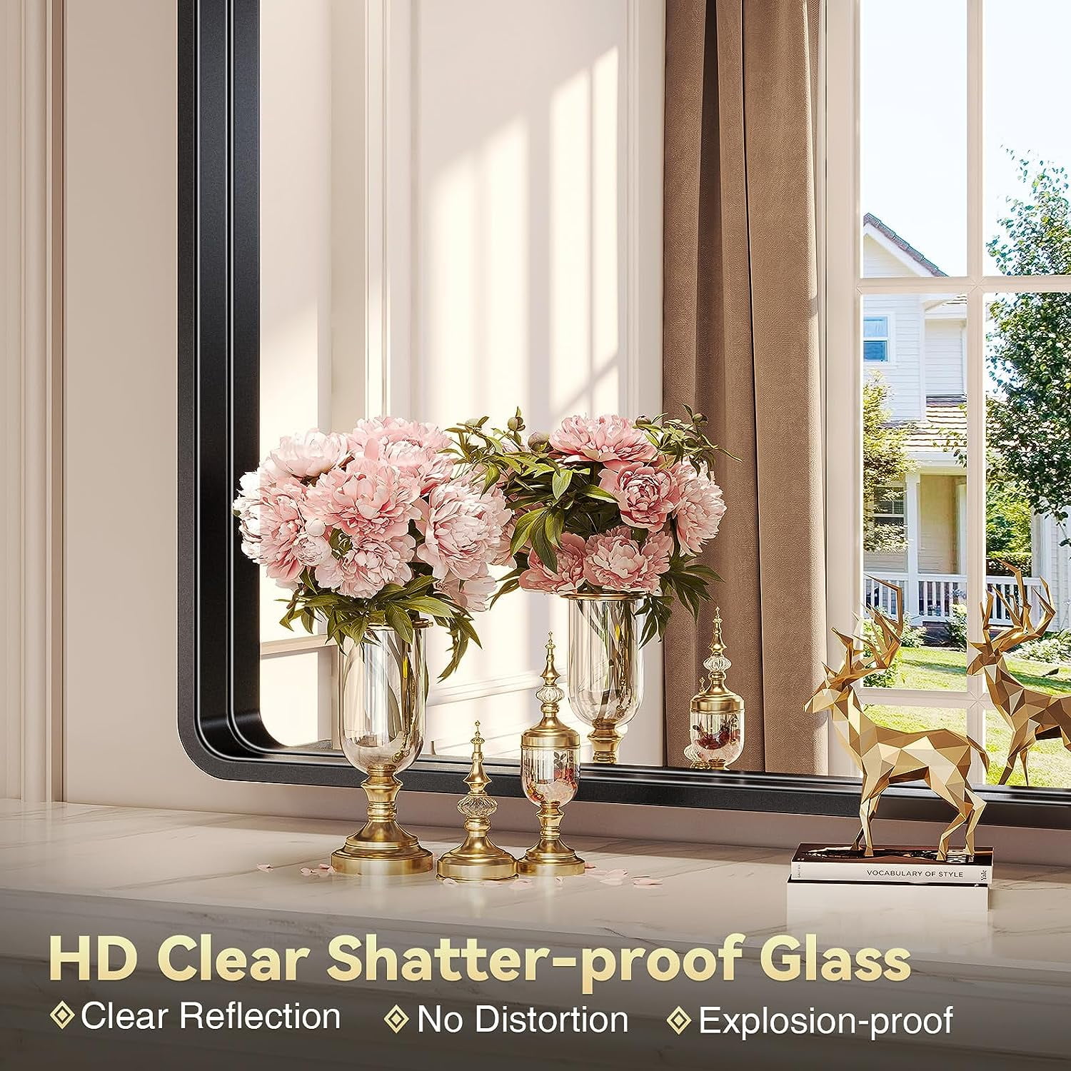 Black Bathroom Mirrors Wall Mirror 22×28 Inch, Modern Bathroom Vanity Wall Mirror with Rectangular Metal Frame & Round Corner for Living Room Bedroom Bathroom, Explosion-proof HD Glass Explosion-proof HD Glass: Scifil black bathroom wall mirror is made of high-end silver mirrors, making the wall mirror 35% brighter than the traditional mirror, and reflectivity increased to more than 90% without any visual distortion. The bathroom vanity wall mirror provides a crystal-clear, distortion-free reflection, ensuring the image does not seem distorted at all angles and distances. Sturdy Metal Frame: Our black framed rectangle mirror is made of high-grade metal material. The rectangle bathroom wall mirror is surrounded by a “seamless design” excellent steel frame, which protects the mirror from rusting while making the mirror anti-water, shockproof, stable, and hard-wearing. Rounded Corner Design: Our bathroom mirrors wall mirror has a rounded corner design for safe use in your home. Its rounded corners also lend a softness to the design. This black frame wall mirror is ideal as a gift or for home decoration. Its sleek and modern design fits any home, hotel, or office. Durable Bathroom Wall Mirror: Scifil bathroom wall mirrors is made of explosion-proof membrane glass, making it safer for you and your family. The excellent materials can adapt to different temperatures and humidity for long-lasting use. Easy Mounting Wall Mirror: Our bathroom mirrors wall mirror includes 4 metal hooks for easy installation. The bathroom wall mirror is equipped with hanging hardware on the back, increasing the stability and safety of the wall mirror. You can hang the rectangle wall mirror vertically or horizontally to maximize available wall space. Safe & Professional Delivery: Scifil black bathroom wall mirror has a safe package including a PE bag, an all-around protective 4mm styrofoam box, and master box packing to ensure safe delivery. The bathroom wall mirrors have passed the dropping test, impact test, and heavy pressure test before delivery. No worry about the breakage. Specifications: Color: Matt Black Style: Modern Wall Mirror Size: 22X28 Inches Shape: Rectangle Material: HD Glass + Metal Frame + 4mm Mdf Backboard Mounting Ways: Hanging on the wall vertically or horizontally Installation Manual: Preparing the tools: Tapeline, pencil, spirit level, hammer drill, screwdriver, hammer. Use a tapeline to measure the distance between two metal hooks accurately; Use a pencil to draw the mark of the distance between two points; Drill holes at the mark of intersection with a hammer drill; Use a hammer to drive the expansion tube into the hole; Screw the hook into the expansion tube with a screwdriver; Hand up and install the mirror. Package Includes: 1* Black Bathroom Wall Mirror 22×28 Inch