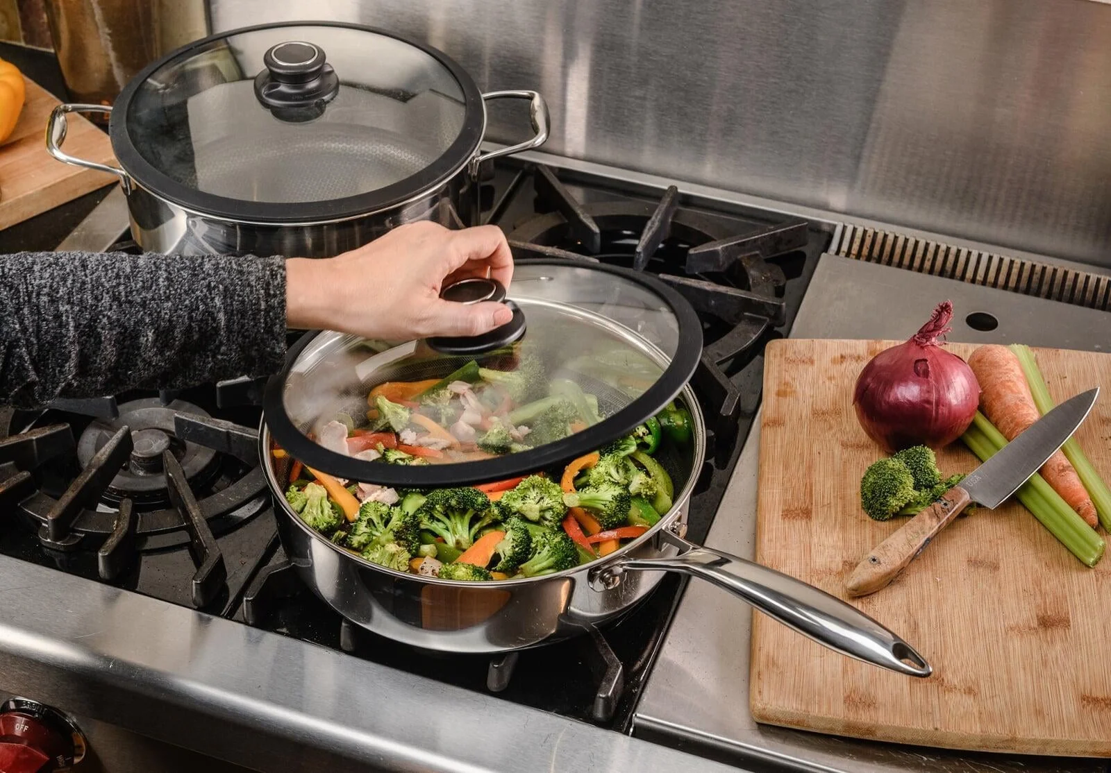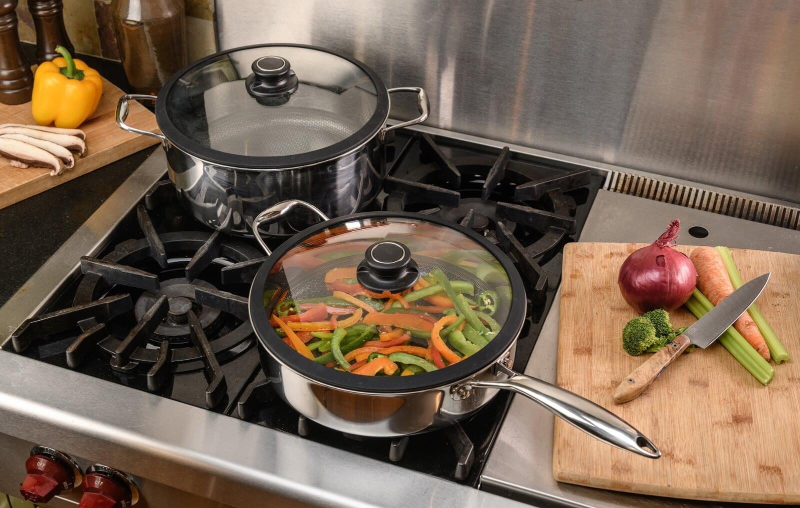 Raised stainless steel pixels with recessed PFOA-free nonstick interior Tri-ply: aluminum core between stainless steel Browns like stainless steel and cleans like nonstick Scratch resistant and metal utensil safe Riveted, ergonomic handle Oven safe up to 500 F For use on gas, induction, electric, ceramic, and halogen cooktops Includes a lid Dishwasher safe