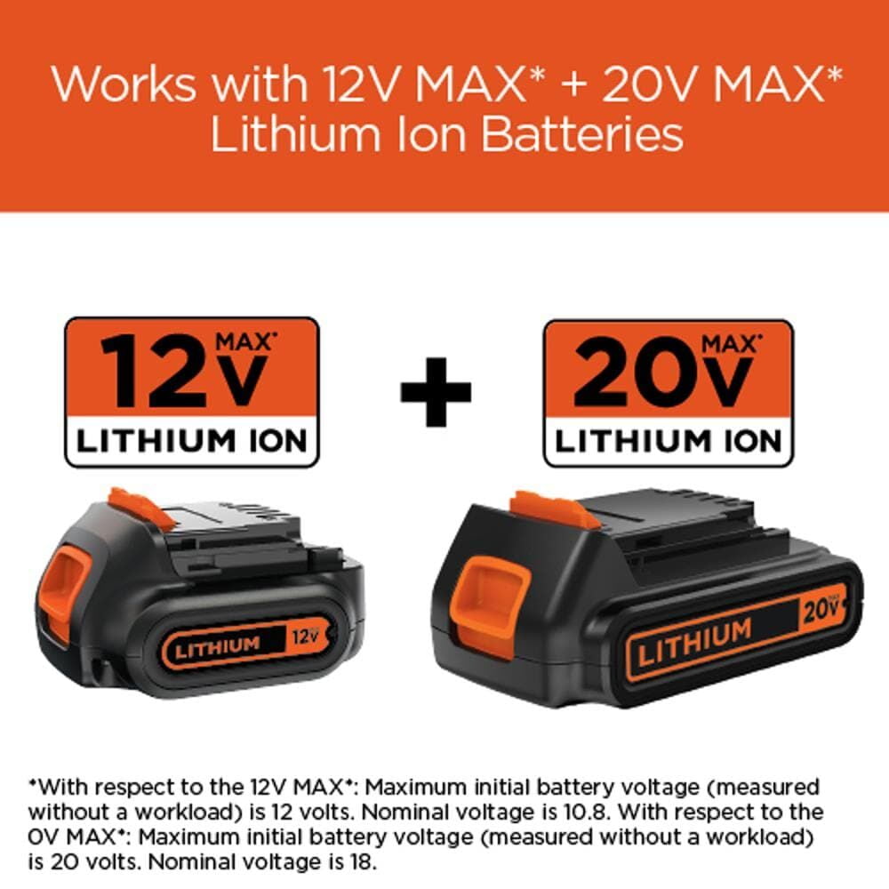 Black+Decker BDCAC202B. . Features: Let’s you charge lithium-ion batteries ranging from 12V – 20V MAX . Recharges slide pack 1.5 Ah batteries in 40 min. or less. Multi-functional charging light indicates battery status throughout the charge.