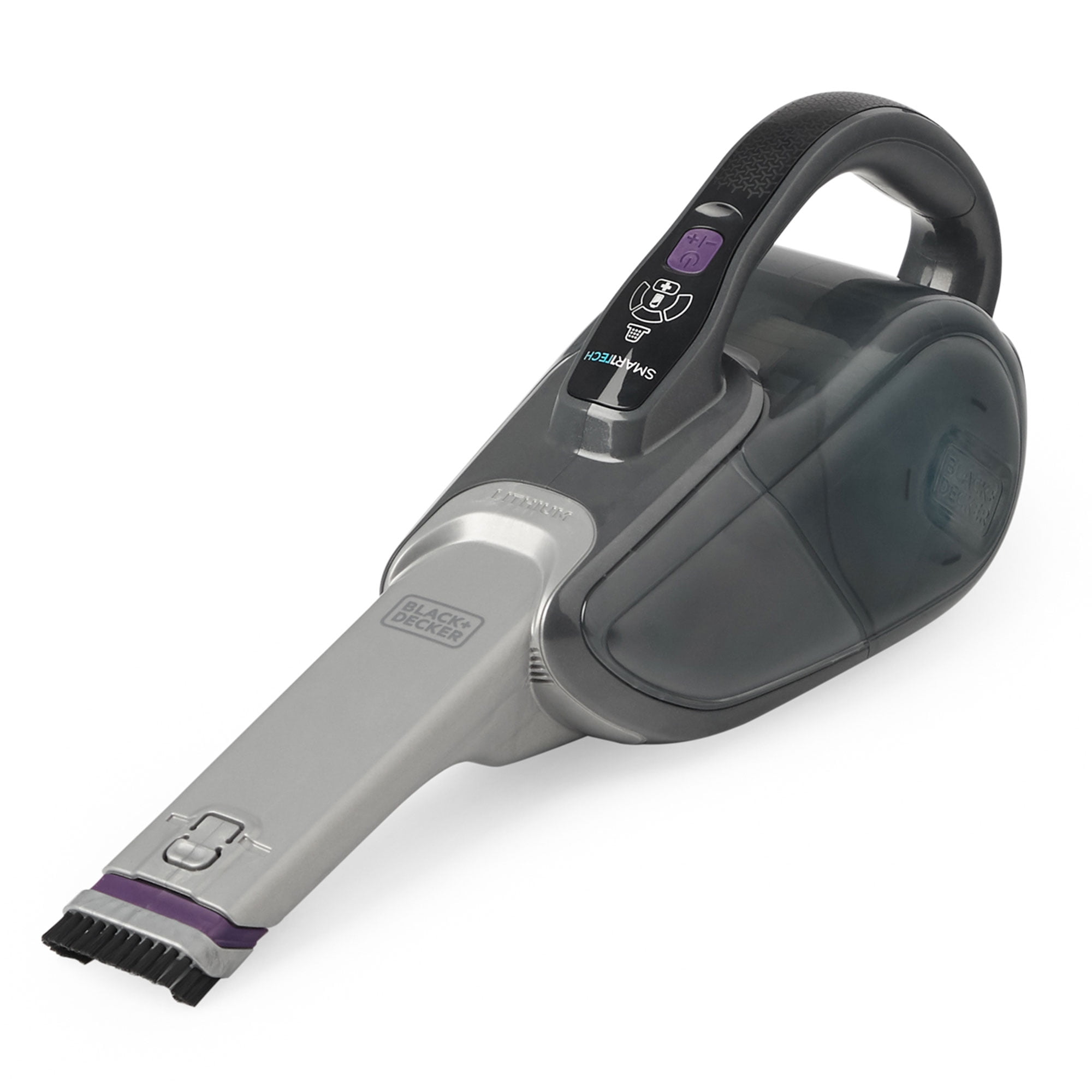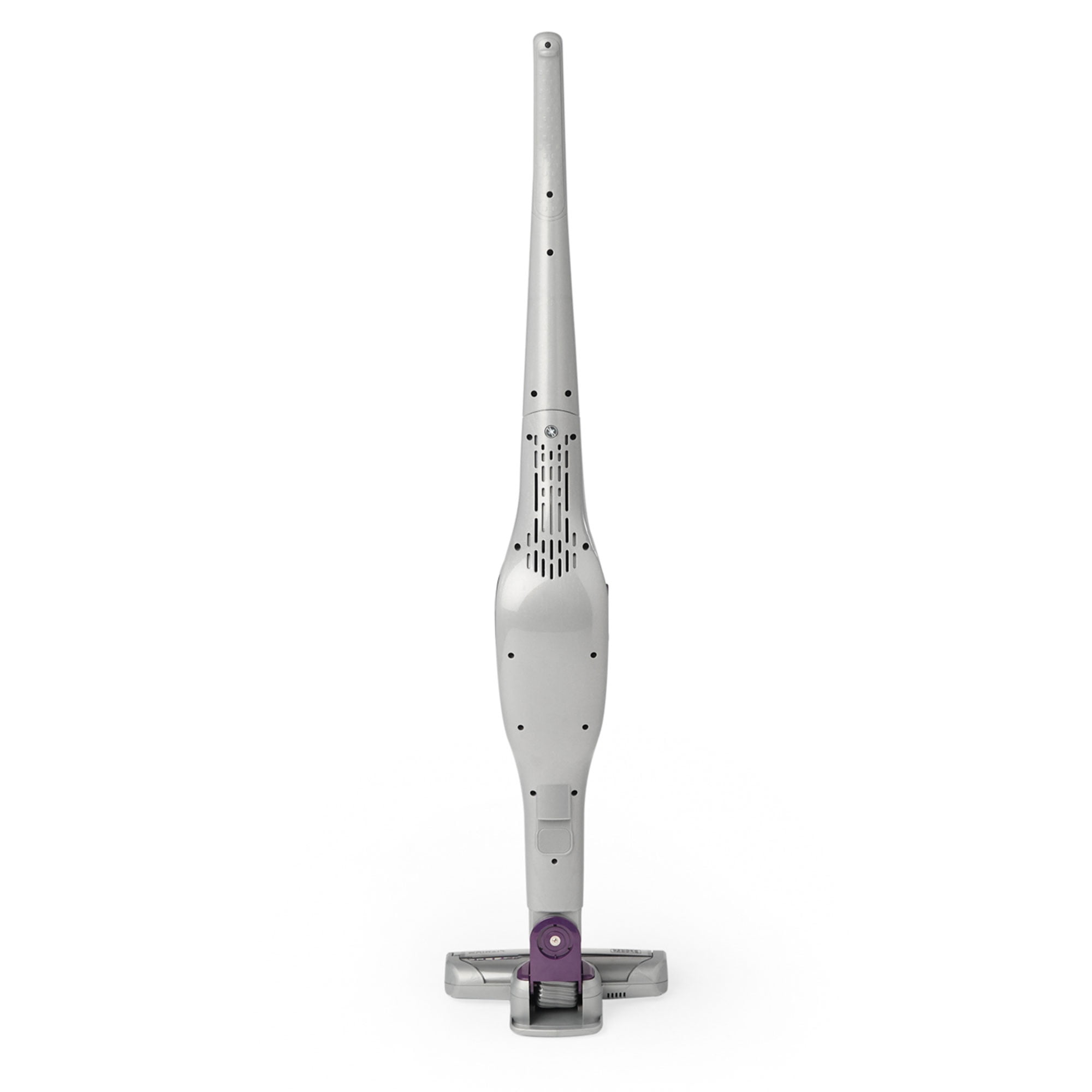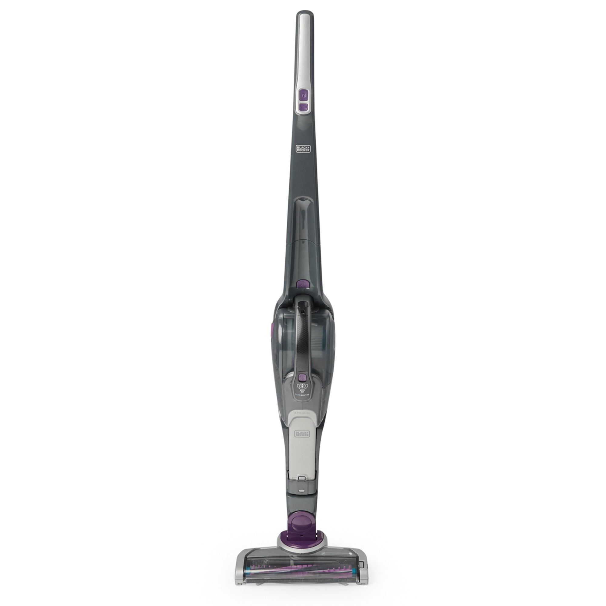 2-In-1 vacuum can be used as a stick vacuum or a detachable hand vacuum Smart-tech technology notifies you when vacuum needs a clean or has a low battery Auto-sense feature detects transition between hard floor and carpet Lithium Ion technology for strong suction and long battery life Anti-tangle rubber bristles quickly lift out hair trapped in deep in carpets and hard floors Scented pre-filter provides a clean, fresh aroma while vacuuming 180-degree pivot steering for excellent maneuverability Easily empty the dustbin without touching the dirt Washable bowl and filter for thorough cleaning Clear bagless dirt bowl is easy to see when it needs to be emptied Pull-out crevice tool for hard to reach areas Push-in brush for dusting and cleaning upholstery Specifications: Battery type: Lithium ion rechargeable battery Power source: Cordless Suction power: 30 AW Run time: Up to 15 minutes Dust bowl capacity: 500 ML Replacement filters: VPF10, VPF20 Includes: Vacuum, jack plug charger, powered pet brush attachment, extendable crevice tool, push-in brush, washable pleated filter, and washable scented pre-filter Color: Grey and purple Dimensions (L x W x H): 10.75 x 7.5 x 44 inches Manufacturer warranty: 2-year warranty