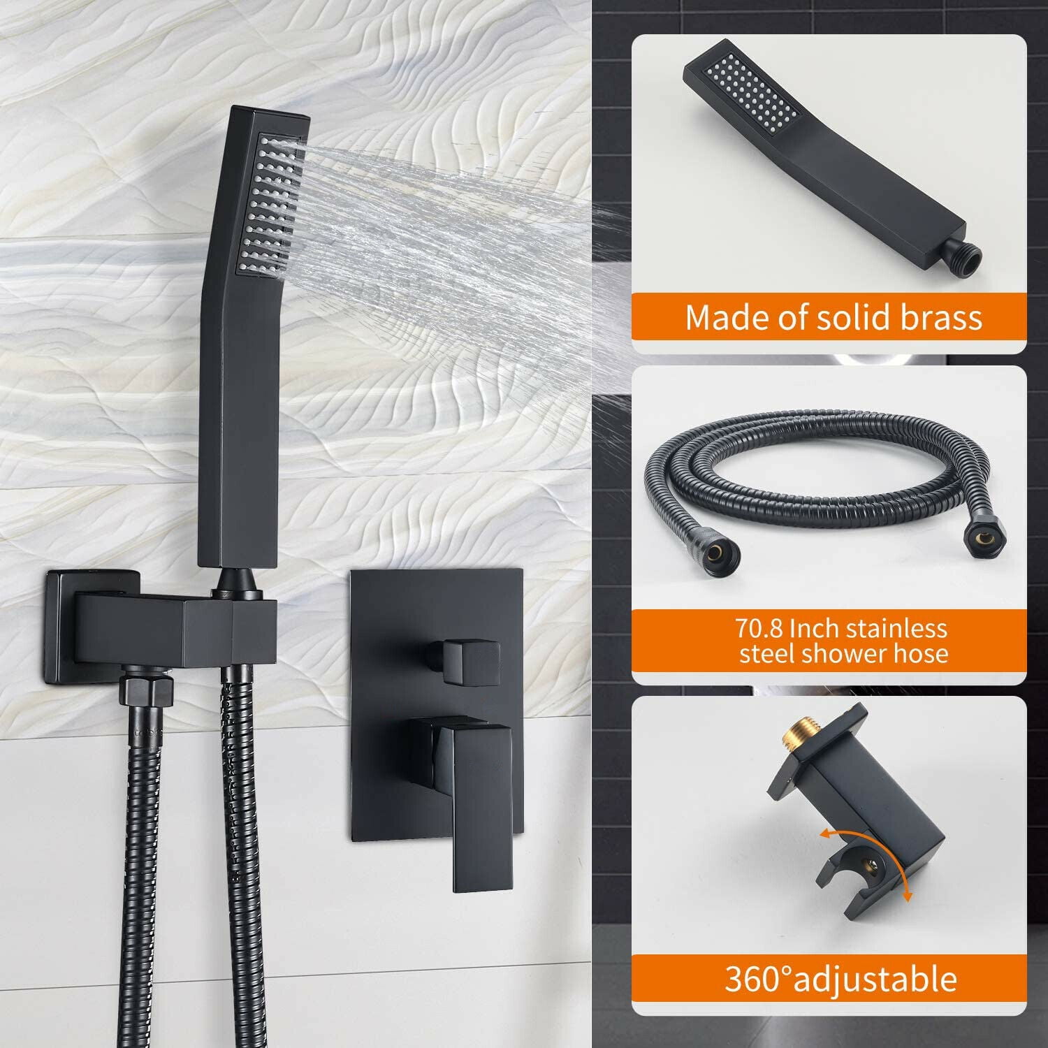 Matte Black Appearance – With the Matte Black appearance of European and American style,ensuring corrosion resistance and durable;it can easily face the surface corrosion by humid environment in the shower room. High Quality – Faucet body is made from sturdy brass, ensuring high quality and longevity,Includes: 8 inch Square rain shower head 304 stainless steel, handheld shower head Brass,shower arm Brass,shower hose,PVC shower holder Brass, water control valve Brass.2-function in 1 switch,easy to operation. Pressure balance valve – it’s cartridge monitor water pressure balance, maintaining consistent water temperature,helping to protect you from being scalded by sudden changes in hot or cold water pressure Air pressure technology: Inject the air into rain Shower head to mix water with air, and the water pressure up to 2.5GPM instantly, simulates the natural raining to provide you with natural contact of water experience,giving you a pleasant Shower,easy to clean and maintain
