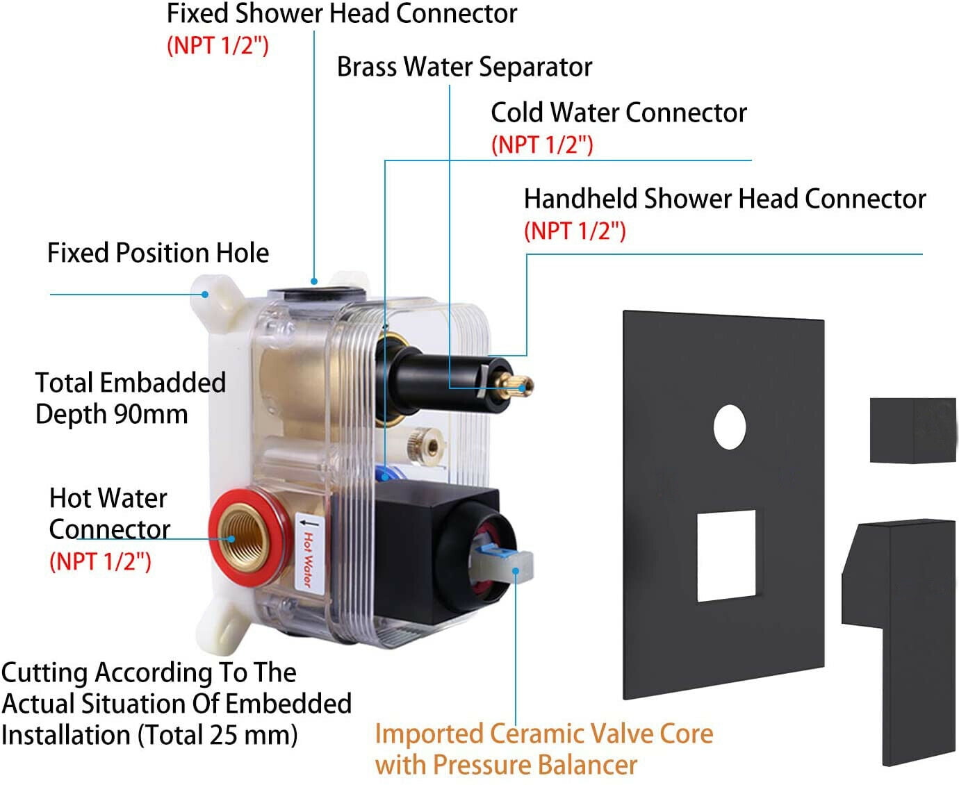 Black Shower Faucet Set Rainfall Shower Head Black Shower Faucet System Set 2-Function Style: Modern/Contempoary Shower head diameter:8″ 10″ 12″ 16″ Shower arm length:14.5″ Shower Head: Rainfall Body Material: Brass Showerhead Material: Stainless Steel Hand Shower Material: Abs plastic Tub Spout Material: Brass Number of Handles: Single Handle Finish:Matte Black Valve Type: Ceramic Valve Faucet Body Material: Brass Water Flow:1.8 GPM The valve with the rough part inside the wall Thread sizeï¼1/2 NPT 2-ways Function,Contain:Rainfall,Hand shower Only one function can be used at a time