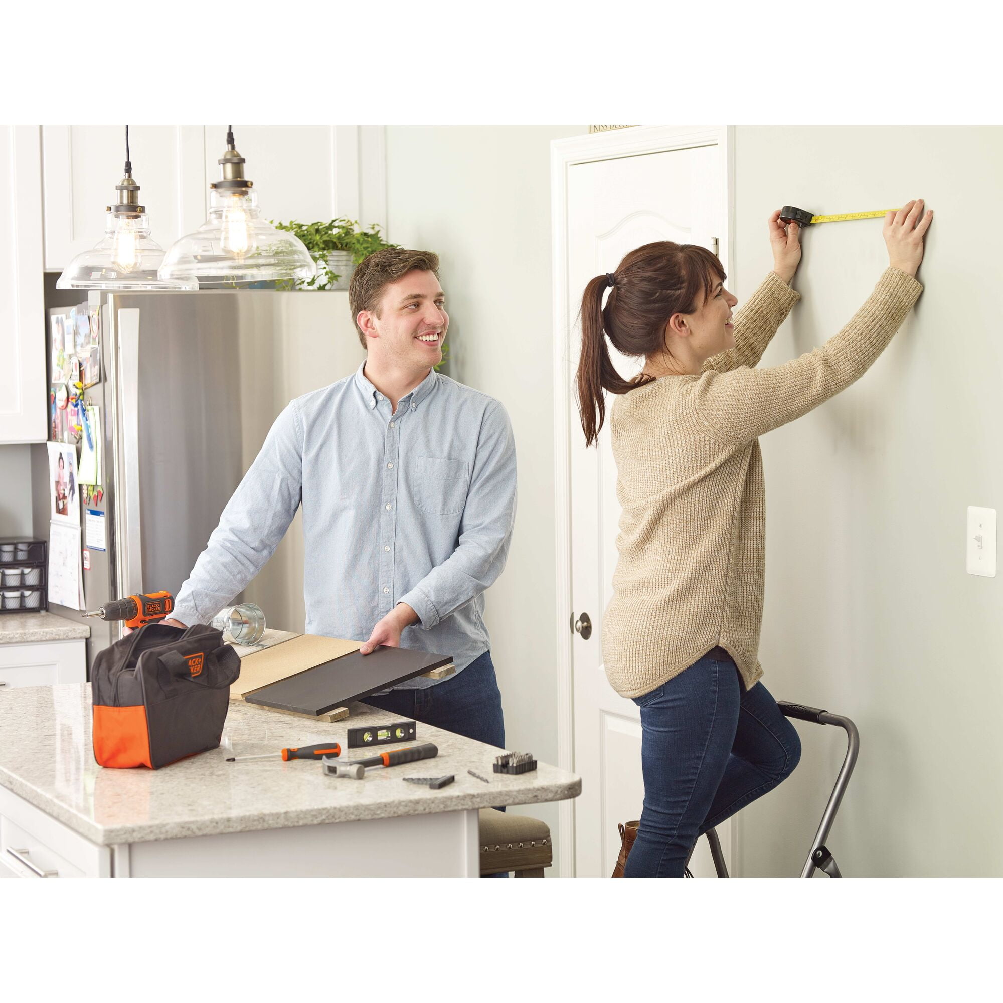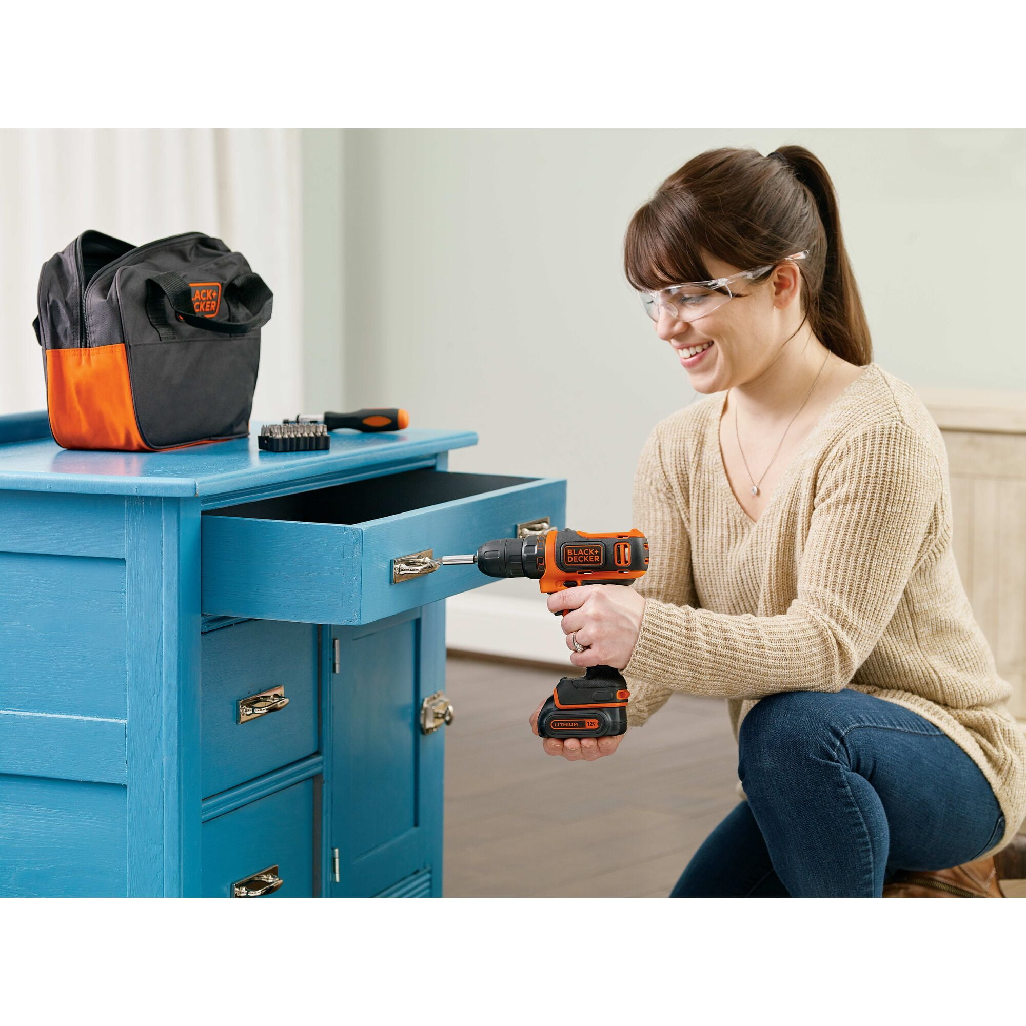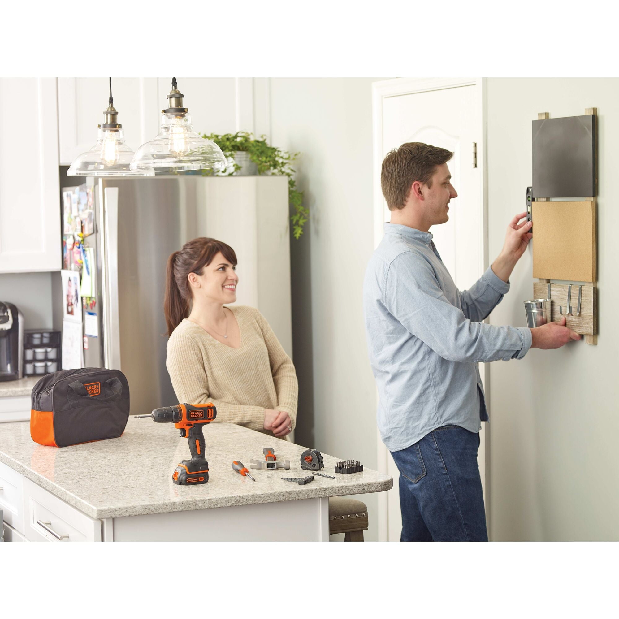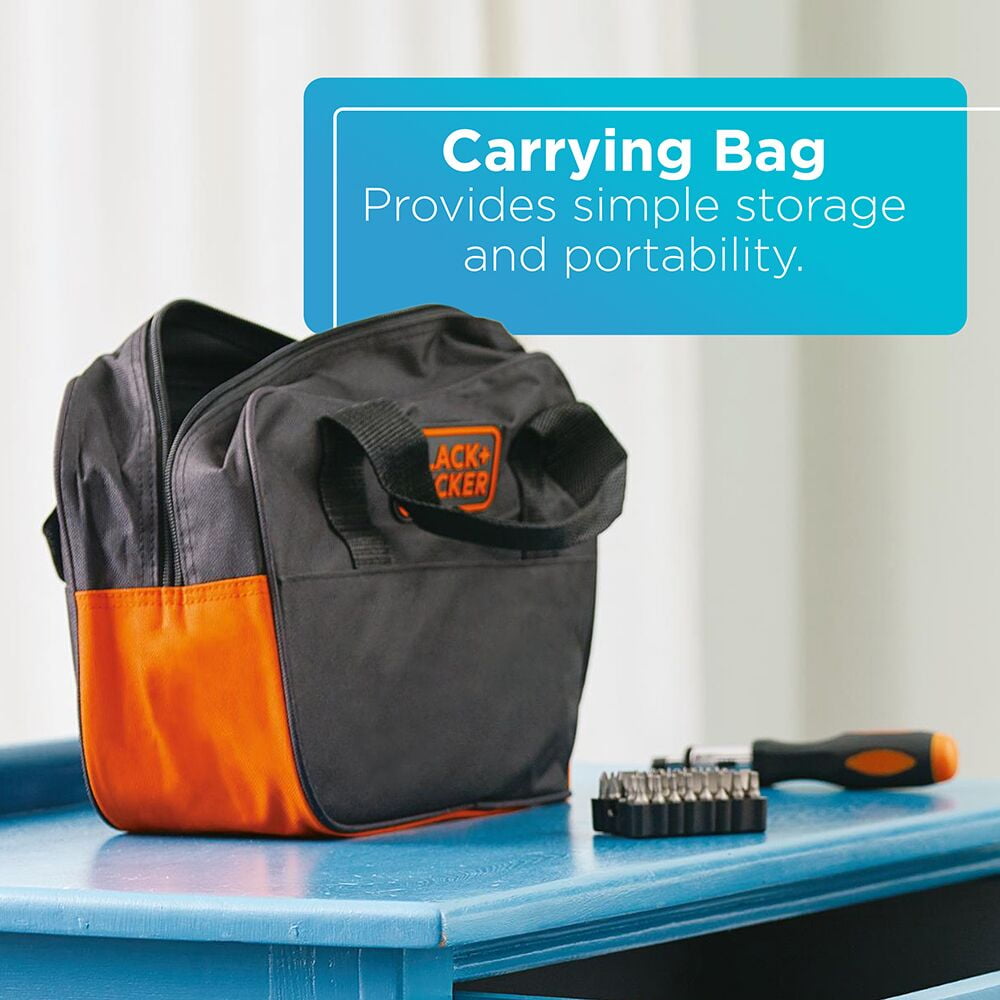 The BLACK+DECKER BDCDD12PK 12V MAX Drill Project Kit features a powerful compact lithium drill/driver and 56 hand tools and accessoriest most commonly used for DIY projects and household tasks; this home tool kit can help you tackle projects big and small. The Lithium drill is 35% more compact than previous GCO1200C NiCad drill/driver. The drill/driver features a mid handle design for comfort and control, along with an LED light to illuminate work surfaces. The lithium ion battery is always ready, and holds a charge up to 18 months. This kit also includes a convenient bag or portability and storage. What’s included: Drill/Driver, Tool Bag, Hammer, Tape Measure, Adjustable Wrench, Slip Joint Pliers, Ratcheting Screwdriver, Phillips Screwdriver, Slot Screwdriver, Utility Knife, Assorted Nut Drivers, Assorted Screwdriving Bits, Assorted Drill Bits, Level.