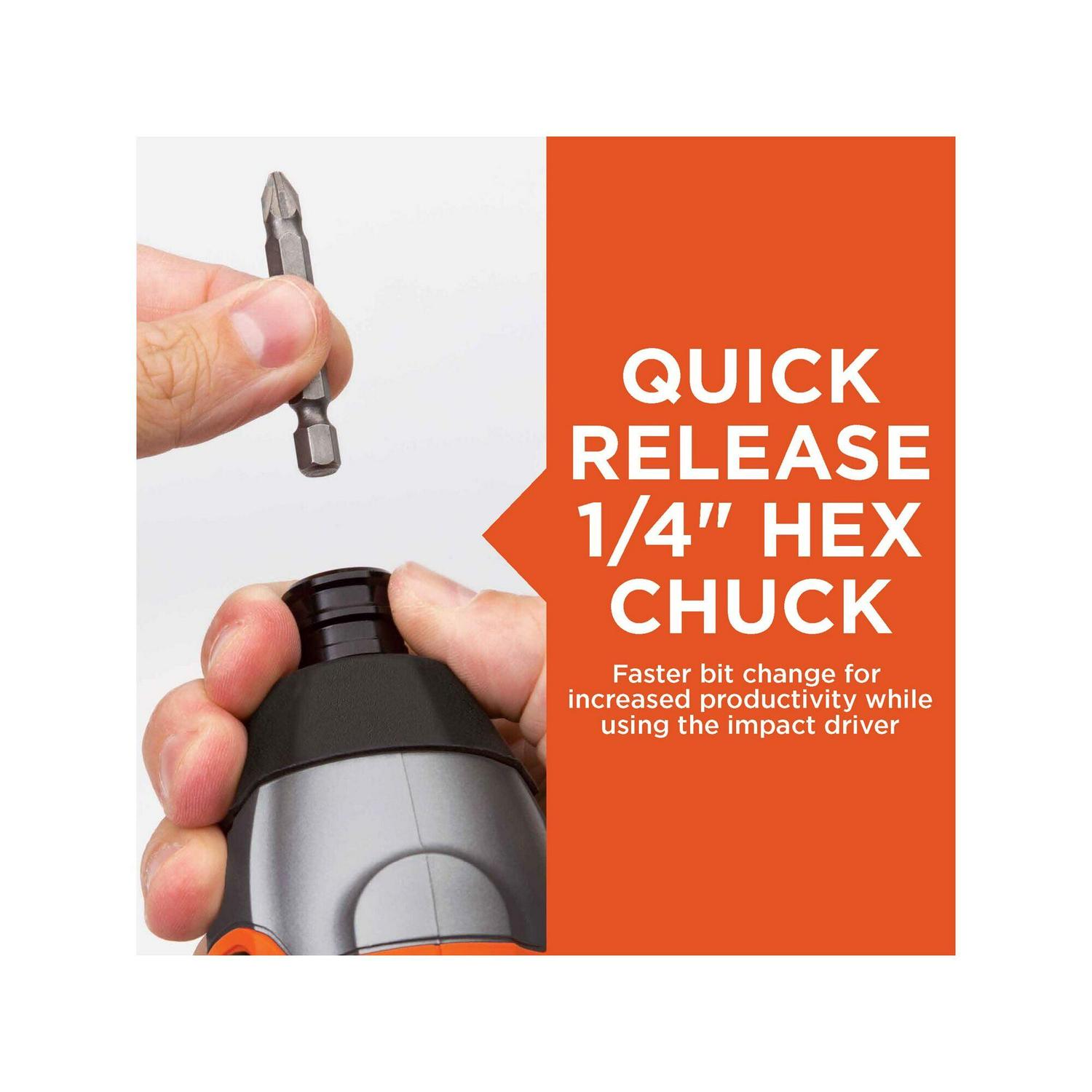 – Tool-free, quick release attachment hex chuck makes it easy to change bits on the fly