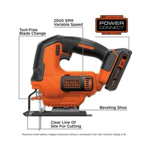 A must-have for every tool collection, the BLACK+DECKER 20V MAX* POWERCONNECT cordless jig saw makes straight, curved, angled, and plunged cuts in wood and metal. Use the variable-speed trigger for custom control and an output of up to 2,500 rpm. You can swap out blades between jobs without needing extra tools. This cordless jig saw also features a bevel shoe with an angle capacity of up to 45 degrees in both directions. Plus, it s designed with a wire guard, so you’ll have a clear line of sight when making precision cuts. The built-in dust blower helps keep your work surface clear of sawdust for enhanced visibility. And this cordless jig saw is powered by a 20V MAX* POWERCONNECT battery, which is rechargeable and can be used with other compatible tools in the POWERCONNECT system. *Maximum initial battery voltage (measured without a workload) is 20 volts. Nominal voltage is 18 volts.
