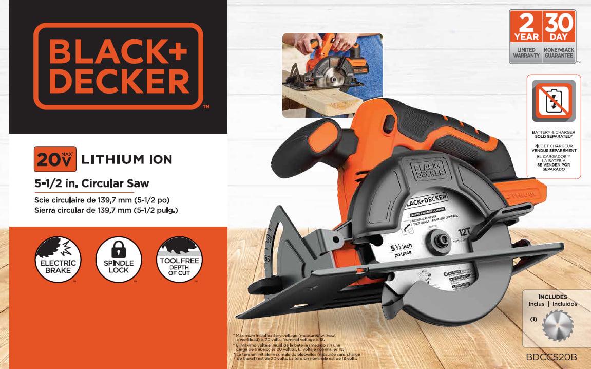 The BLACK+DECKER BDCCS20B 20-Volt Max Lithium-Ion Cordless 5-1/2 in. Circular Saw, Bare Tool (No Battery Included) is an irreplaceable tool for a huge range of cutting tasks that often involve angles or curves, or where a table saw is impractical to setup. The 5-1/2 Black+Decker Bare Circular Saw for 20V MAX Lithium battery is a cordless circular saw designed to let you make the cuts you need to, even when well out of range of an electrical cable. This saw operates at 3700 RPM, and when set to 90 degrees, the 5-1/2 blade penetrates 1-5/8 past its protective guard. Blade penetration is shorter for angled cuts. Perfect for wood deck surfaces and interior trim, it features an easy-flip lever to adjust the depth of cut, a convenient saw wrench for blade changes, and comes with a Black+ Decker circular saw blade ready for use. Additional blades and battery sold separately. Black+Decker offers a 30 Day Money Back Guarantee and Limited Two Year Warranty.