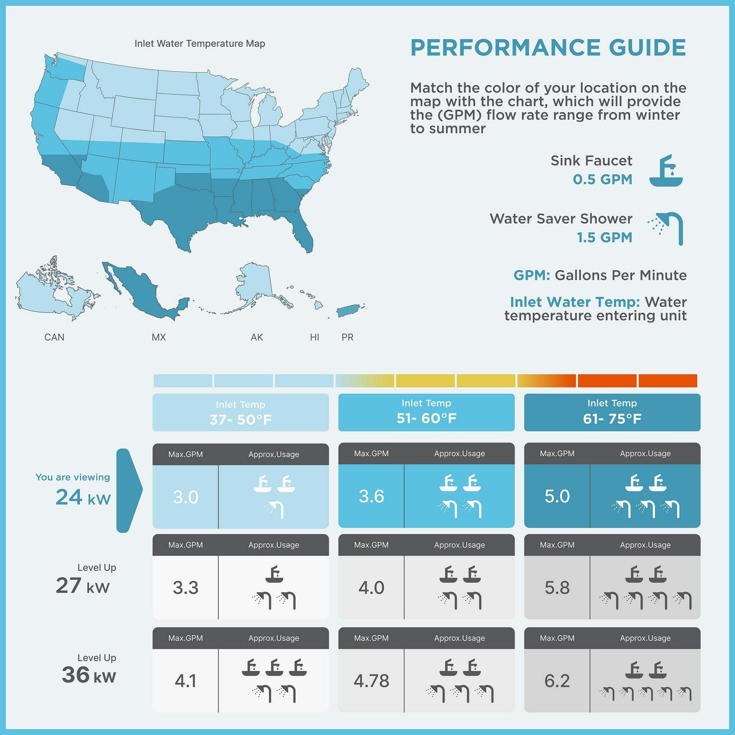 – Reference the performance guide to confirm this unit will provide sufficient hot water to meet your need
