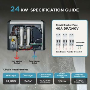 - Requires 3 x 40A double-pole breakers, 3 x 8/2 AWG wires, 240V