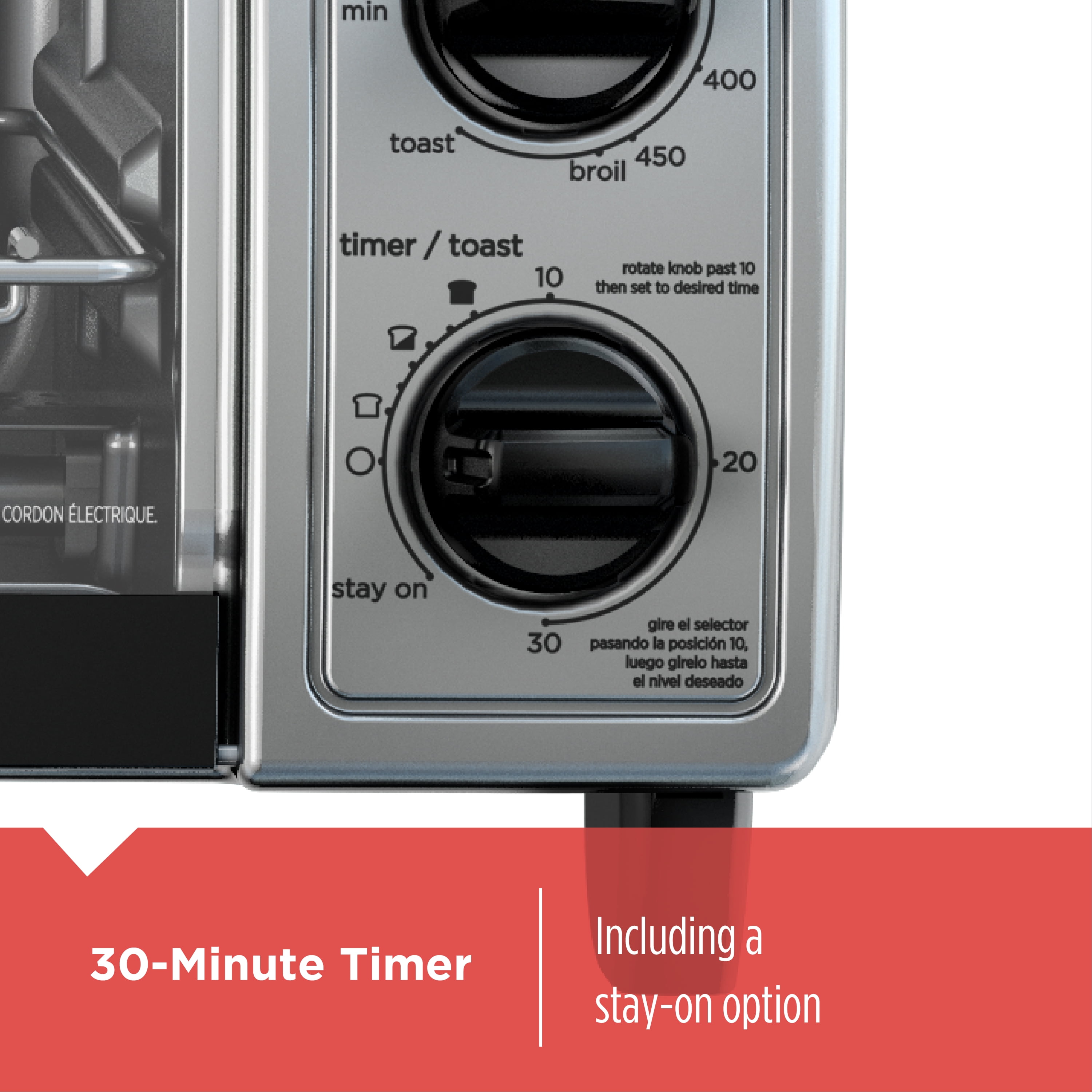 Four Cooking Functions: Choose from convection bake, broil, toast, and keep warm. Compact Size: Easily fit a 9” pizza, four slices of bread, or a variety of other snacks and meals. 30-Minute Timer: The precise cooking timer features a stay-on function for longer baking tasks. Included Rack and Pan: The included rack and bake pan fit perfectly in the toaster oven. EvenToast Technology™: Up to 30% more even toasting than previous BLACK+DECKER toaster ovens. Black/Stainless Steel: Find a fit for your kitchen with the black exterior and stainless steel accents. Extra-Wide Viewing Window: Keep a close watch on food while it bakes without opening the oven door. Removable Crumb Tray: Easily remove food crumbs before they burn in the bottom of the oven.