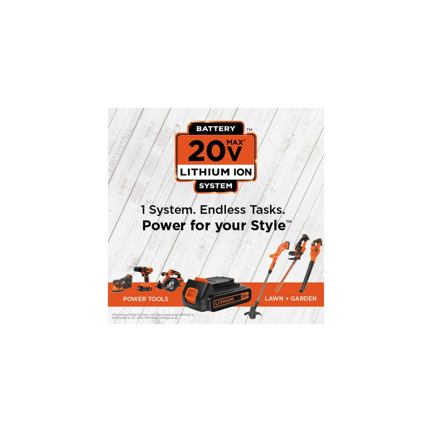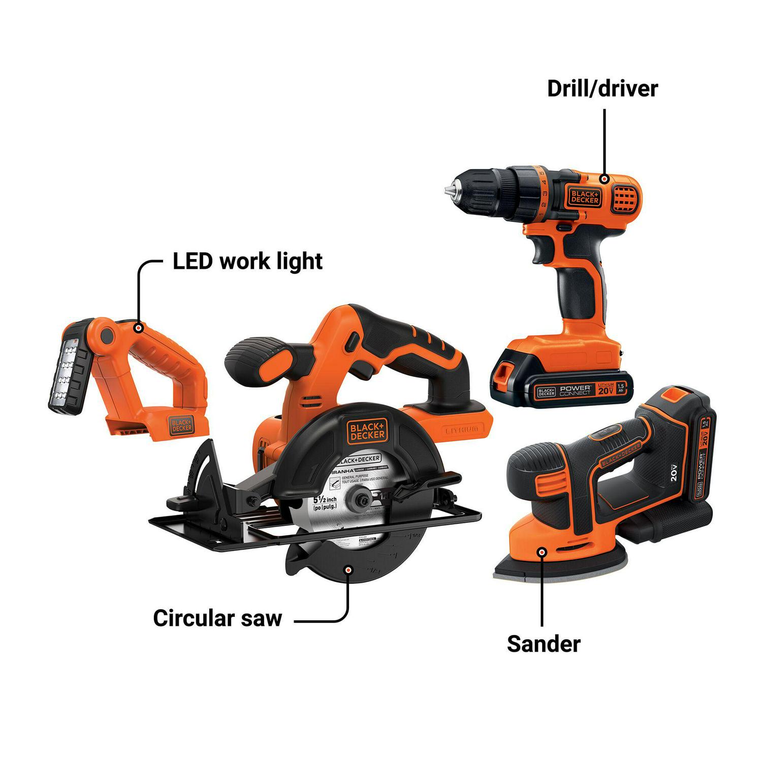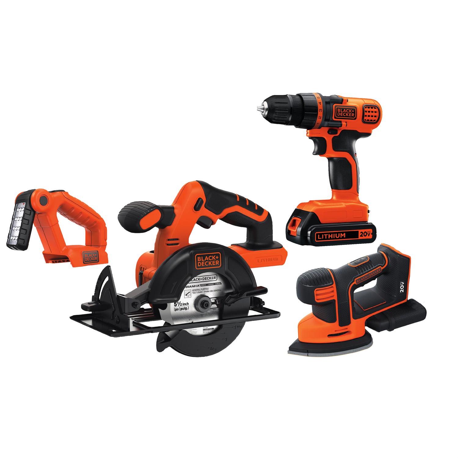 BLACK+DECKER BD4KITCDCMSL 20V MAX* Lithium Ion 4-Tool Combo Kit: features a Drill/Driver, Circular Saw, MOUSE Detail Sander, Light. This 4-tool kit provides value to weekend warriors, experienced craftsman and DIYers alike. Experience the convenience of cordless with the 20V MAX* Lithium Ion power. The LDX120 drill/driver is compact and lightweight, with LED light to illuminate your project surface – an 11 position chuck to prevent stripping of screws, with a keyless chuck for easy bit changes. The BDCCS20 Circular Saw features a 5.5″ fast cutting blade, bevel adjustment with detents at 45 and 90 degrees for angle cuts, and tool-free depth of cut for easy adjustment. The BDCMS20 MOUSE Sander operates at 12000 OPM for quick material removal. A detail finger attachment allows access to tough to reach spots, with multiple grip positions for added comfort – and a dust collection bag. The BDCF20 LED Work Light features a pivoting head to illuminate tough to reach spaces . *Part of the 20V MAX* Lithium Ion battery system. Kit contains: 1) LDX120 Drill/Driver, 1) BDCCS20 Circular Saw, 1) BDCMS20 MOUSE Detail Sander, 1) BDCF20 LED Work Light, 2) LBRX20 20V MAX* Battery, 1) Battery Charger, 1) Double ended driver bit, 1) 5.5″ Circular saw blade, 1) Circular Saw wrench, 3) sheets sand paper.
