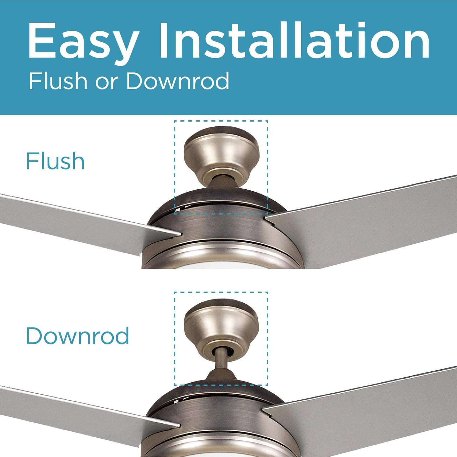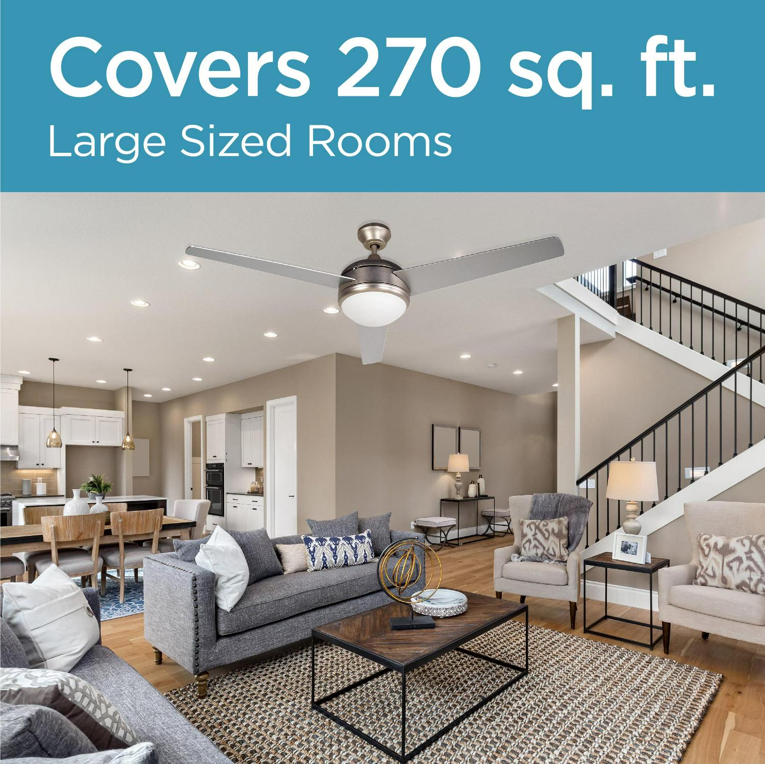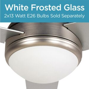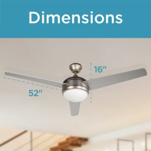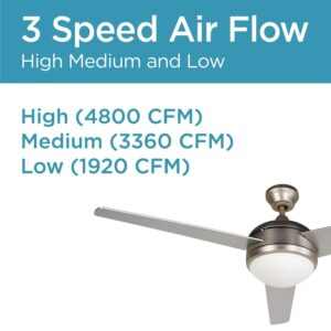 This BLACK+DECKER 52 inch ceiling fan with light will circulate air like never before. Our attic fan (52″ x 52″ x 16″) delivers powerful cooling thanks to impressive 3 plywood blades in Silver Finish. Choose your fan setting: HIGH (4800 CFM), MED (3360 CFM), and LOW (1920 CFM). Control your house fan with a convenient fan remote. Our ceiling fan with lights remote control (16.1 lbs.) comes in a modern nickel finish, sure to delight many aesthetics. This brush nickel ceiling fan cools rooms up to 270 square feet quickly and efficiently. This brushed nickel ceiling fan with 3 Silver Finish plywood blades is easy to operate. Enjoy a frosty white ceiling light that can set the ambiance of a room with 2 13W E26 bulbs sold separately. Stay comfortable and breezy any time of year with BLACK+DECKER’s brushed nickel ceiling fan with light and ceiling fan remote!