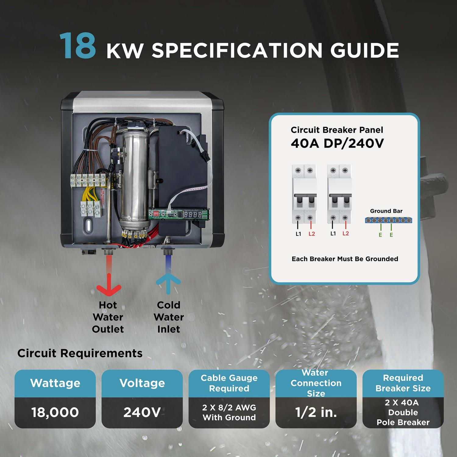Requires 2 x 40 Amp single-phase double-pole breakers, 2 x 8 AWG wires, 240-Volt