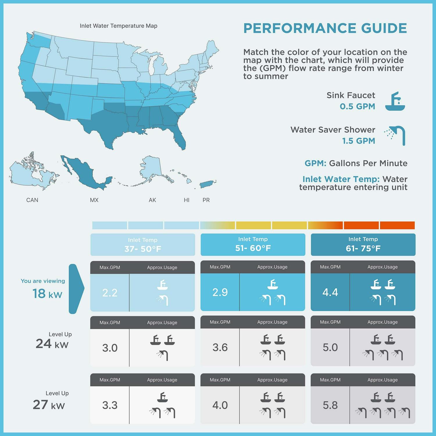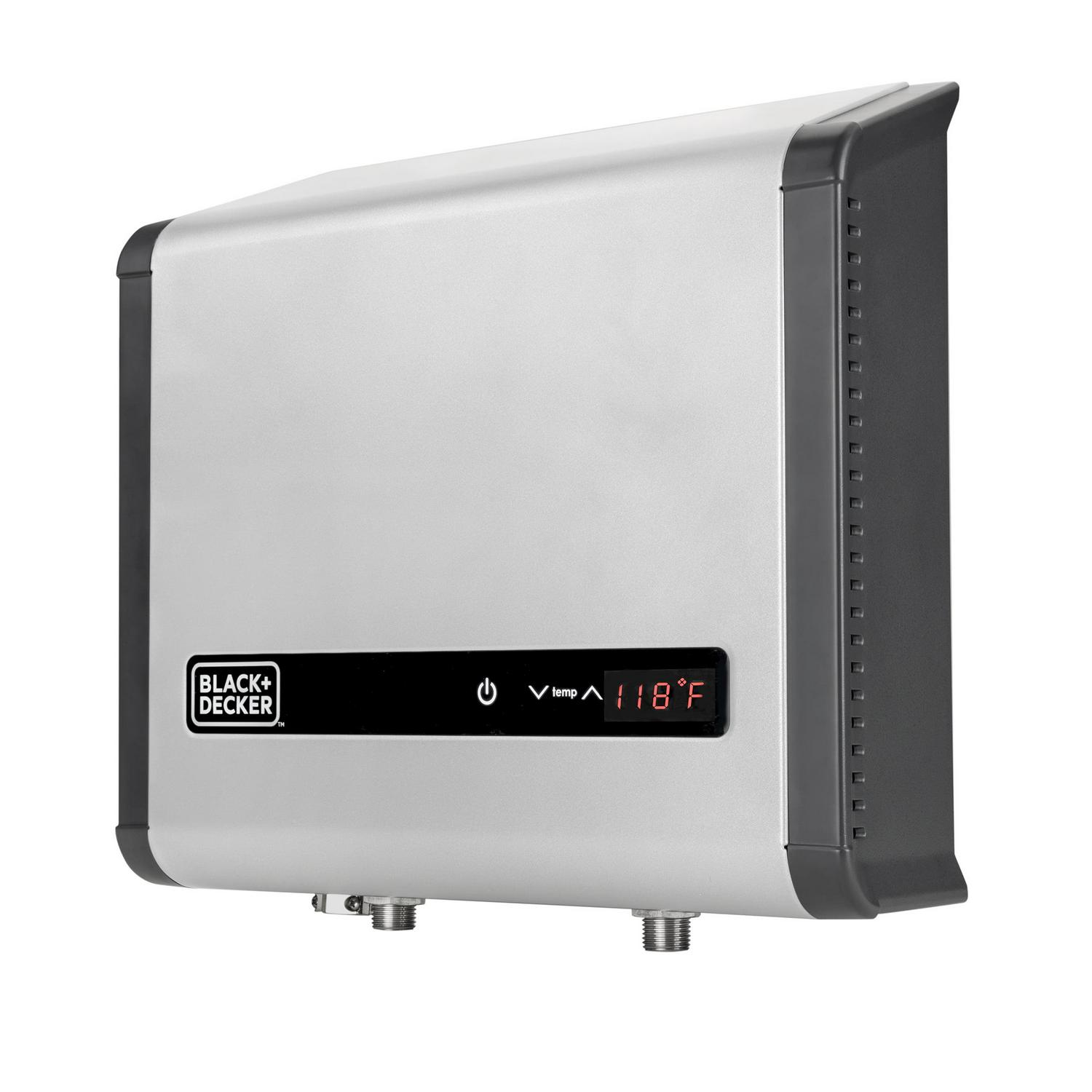 Black+Decker Electric Tankless Hot Water Heaters provides you with endless hot water only when you need it, without the wait or worry of ever running out. Unlike conventional tank water heaters, which constantly consume energy to keep your water hot 24/7, this state-of-the-art, digital technology will instantly reduce your energy consumption and save you money on energy costs simply by heating water on demand. The unit does NOT require any gas lines or venting, and the compact design allows you flexibility to install virtually anywhere – in a cabinet, closet, garage, basement, etc. You can be sure to earn some precious space by installing this unit! Black+Decker Electric Tankless Water Heaters also offers a great value with the assurance the category s strongest warranty – 7 years leakage free, 5 years on the heat exchanger, and 2 years parts only. (IMPORTANT: inlet temps vary by location and seasonality. Selecting the right water heater depends on your incoming water temperature, flow rate, and desired output temperature. See Performance Guide or Manual before purchasing.)