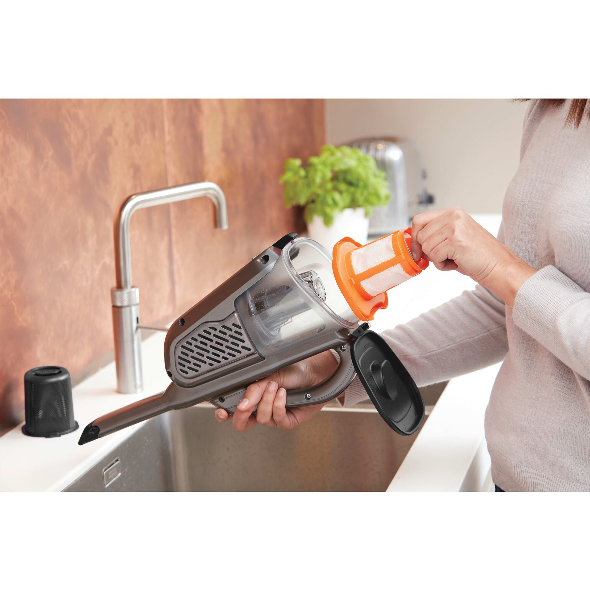 This handheld vacuum features an anti-tangle rubber bristles motorized to lift stubborn pet hair Extra long crevice tool allows you to clean hard to reach areas with less effort This is one of Black+Decker’s most powerful handheld vacuum cleaners with 4X more suction power vs our leading hand vacuum (HNVC115J model) Up to 90% more runtime vs. our leading hand vacuum (HNVC115J model) ONE-TOUCH easy empty keeps your hands clean when emptying out the dustbin The HHVK320JZ01 hand vacuum is equipped with 2 speeds, the Black+Decker POWERBOOST mode for more power at touch of a button