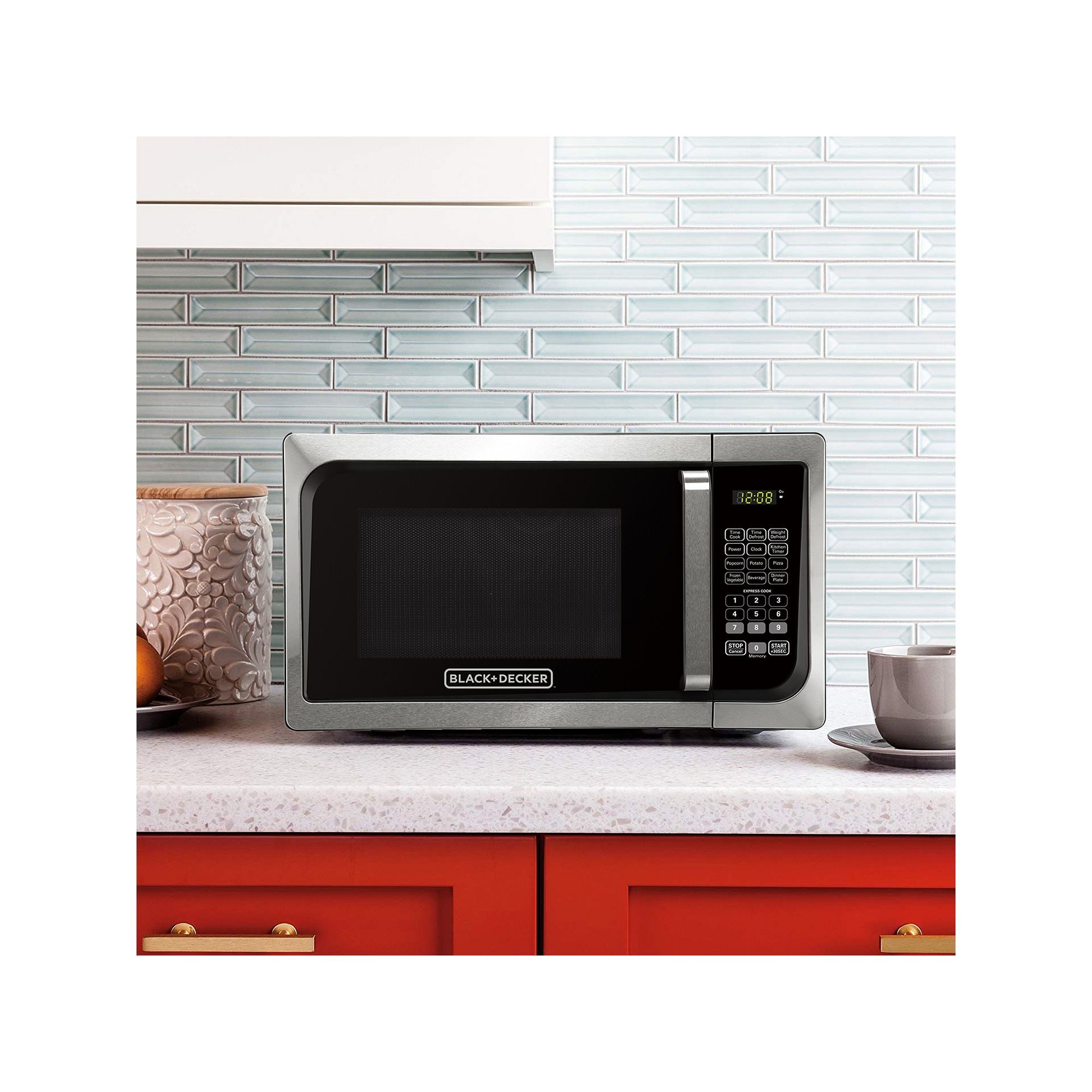 Get your favorite foods cooked easily and conveniently in this BLACK+DECKER 0.9 cu. ft. microwave oven. This efficient appliance has 900 watts of cooking power. Featuring a sleek stainless steel finish, this microwave oven has 10 different power levels to fulfill all of your cooking desires. When you want to have something ready to eat fast, the 30-second express cooking mode ensures to cook your meal in a snap. The LED display is bright and easy to read, and the handy kitchen timer and clock make it simple to plan your meal. Easily open or close the microwave with the large, easy-to-grip door handle. This countertop microwave oven is a smart and elegant choice for the style and feel of your kitchen.