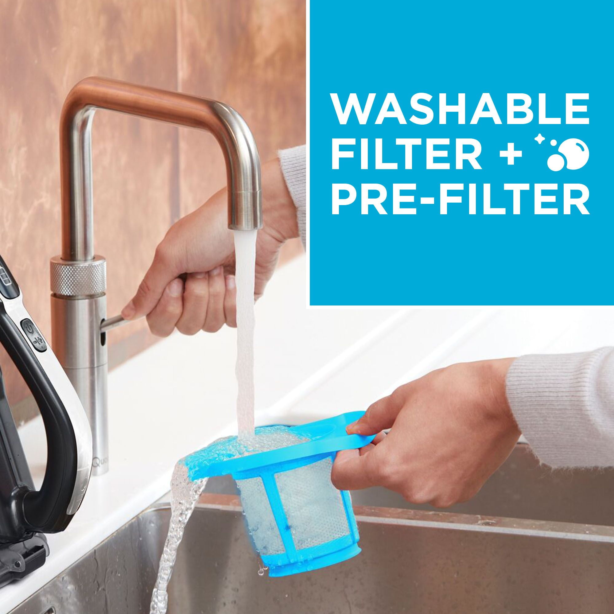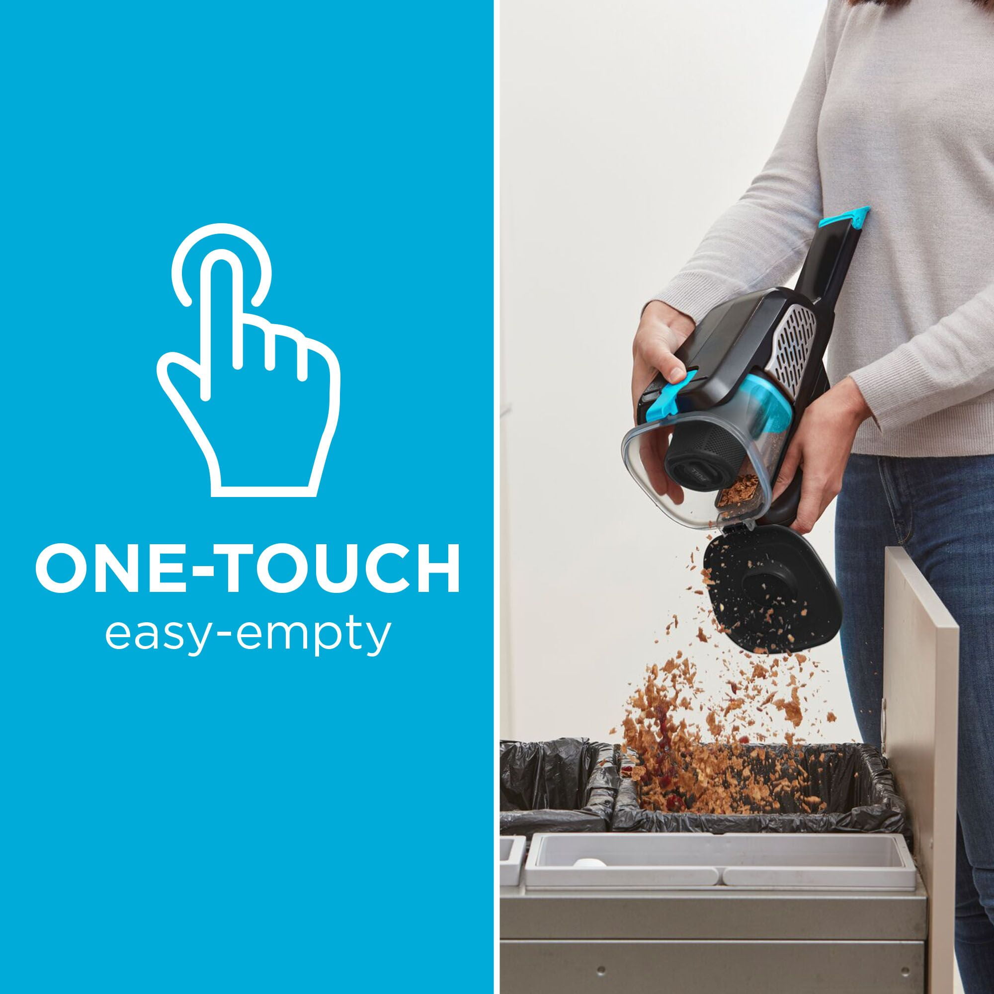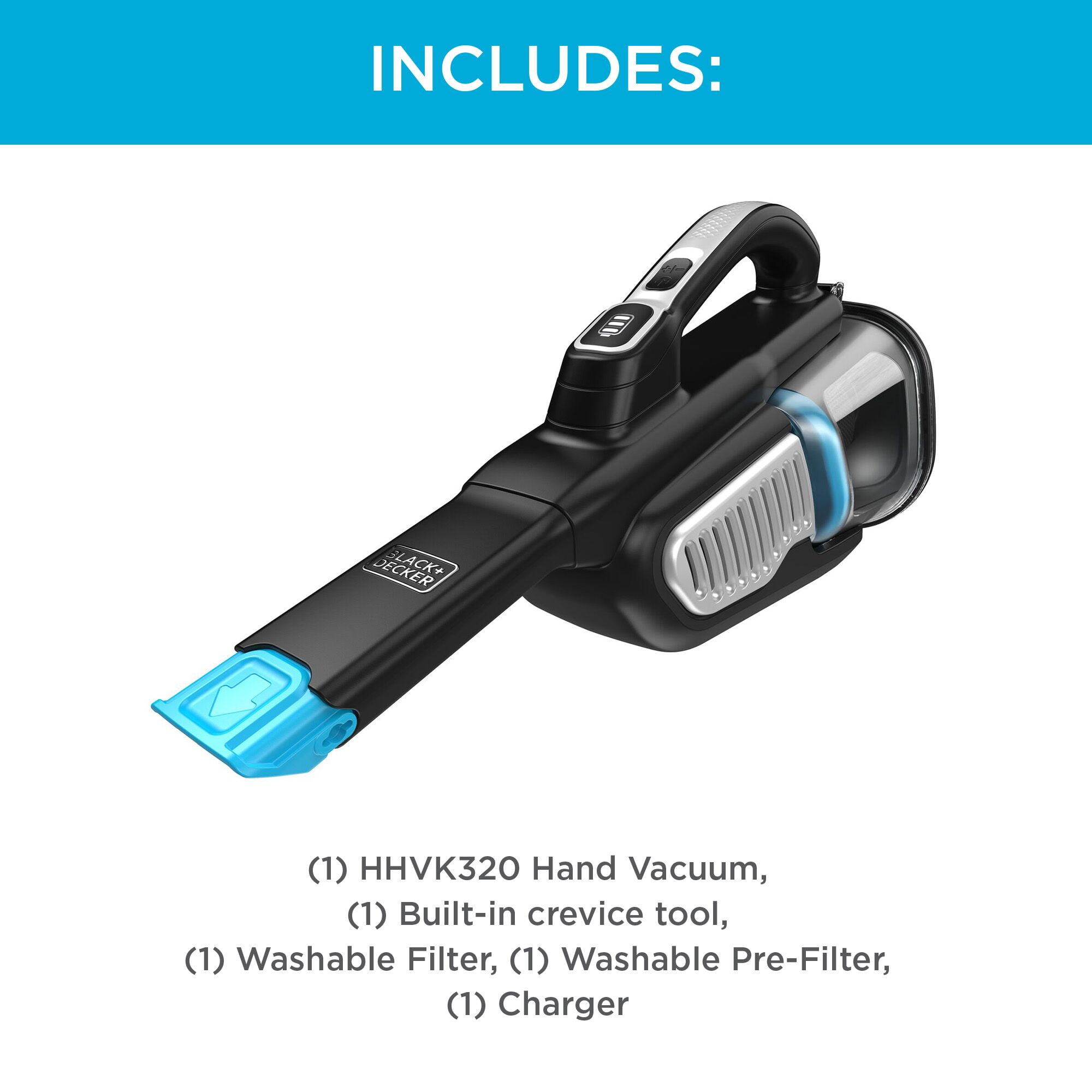 Extra long crevice tool – clean hard to reach areas with less effort; Up to 4X more suction power than our leading hand vacuum, the HNVC115 model; Up to 90% more runtime vs. our leading hand vacuum, the HNVC115 model ONE-TOUCH easy empty- Empty without touching the dirt; 2 Speeds – POWERBOOST mode for more power at touch of a button; XL Dustbin – Pick up more, empty less Battery indicator – Know how much battery is left to complete the task; Washable filter and pre-filter for easy cleaning and maintenance