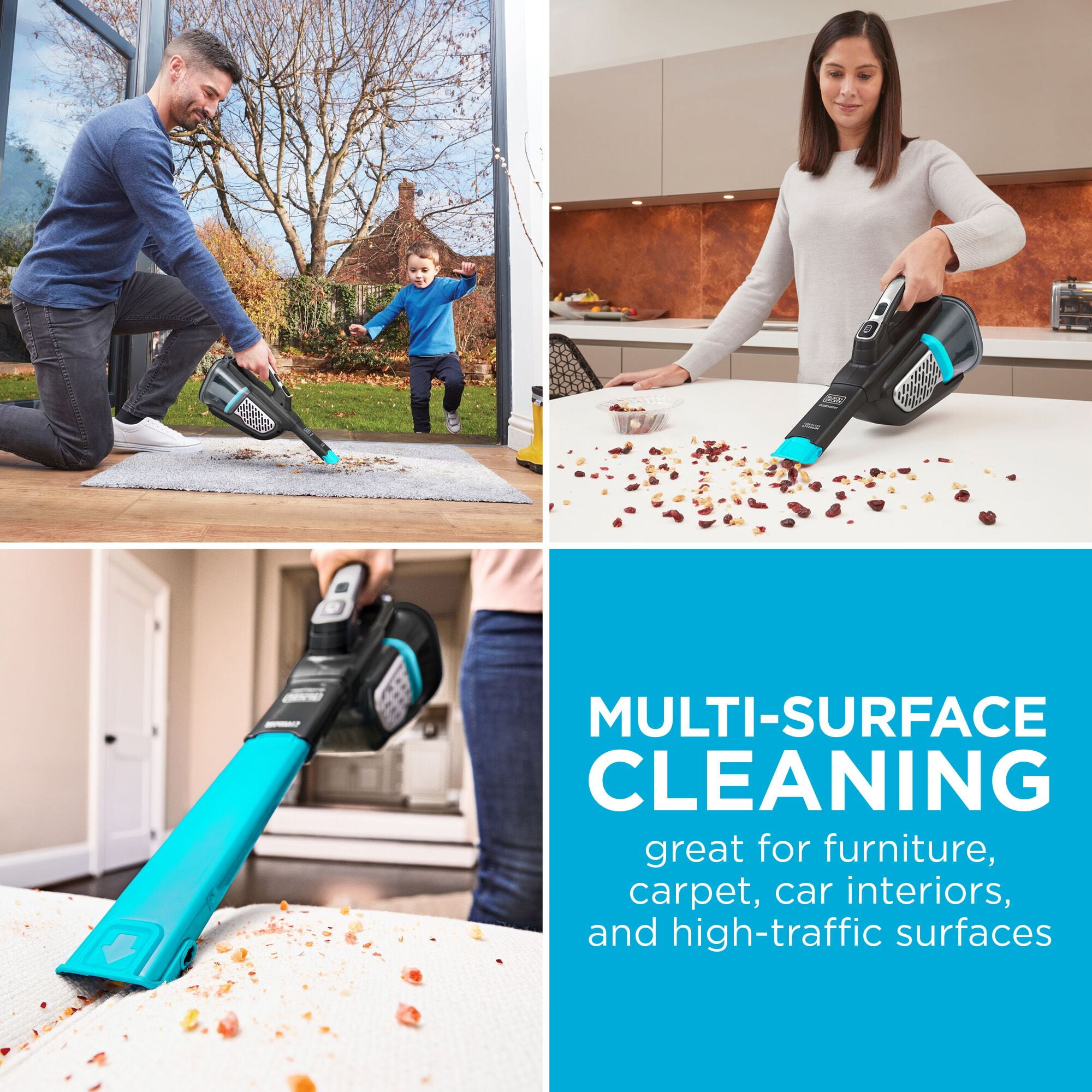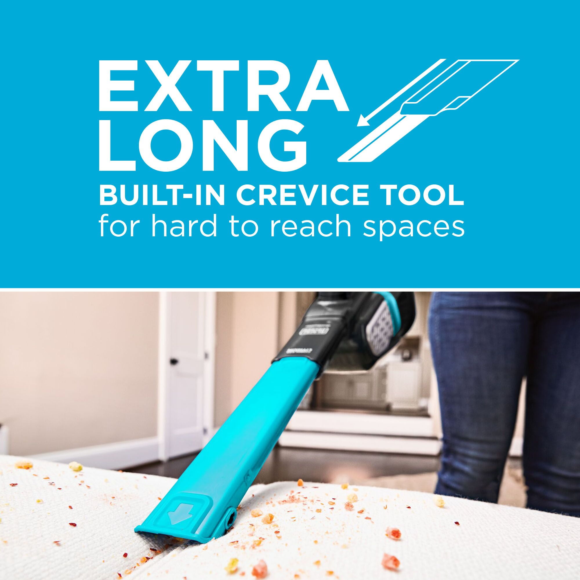 With the BLACK+DECKER Extra dustbuster handheld vacuum, you can eliminate dirt that’s out of reach, but not out of sight. Extend your reach with our longest built-in crevice tool. The versatile 12V cordless hand vacuum cleans hard to reach areas with less effort. 4X more powerful suction and Powerboost with the touch of a button to tackle any mess. The XL 750 mL dustbin, up to 90% more runtime, and a battery indicator keep you moving. Keep your hands clean with the ONE-TOUCH easy empty dust bin. Go The Extra Length with the dustbuster Extra Cordless Hand Vacuum.
