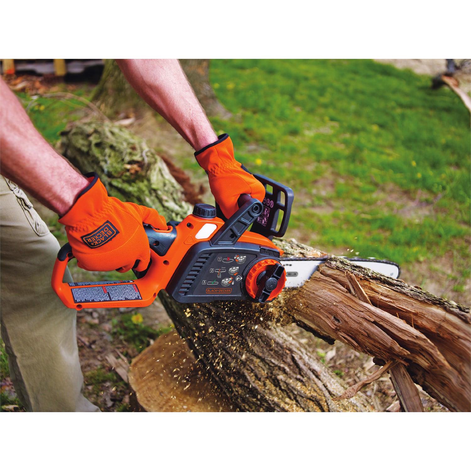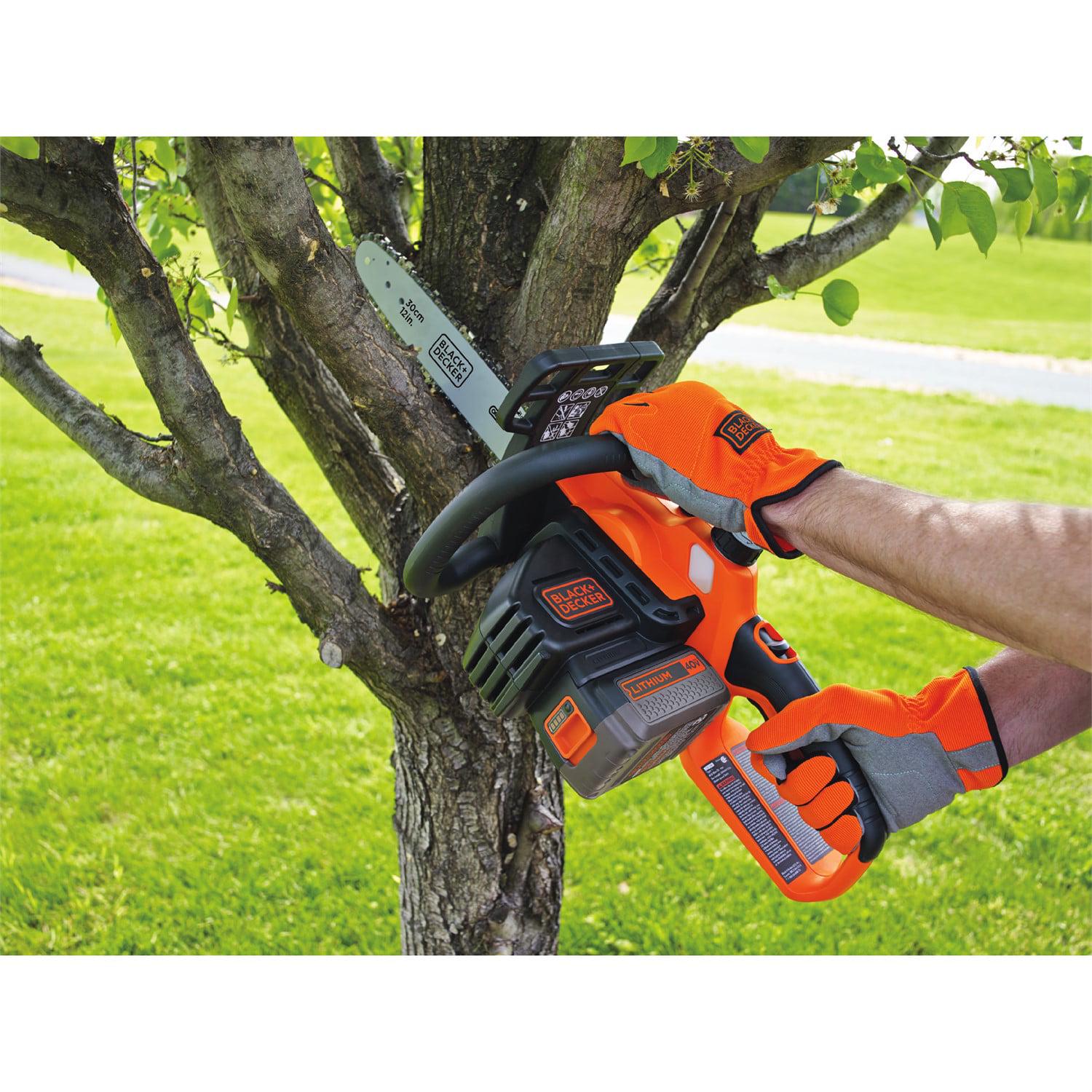 The Black + Decker LCS1020B 20V MAX* Lithium Ion Chainsaw offers the convenience of cordless maneuverability with the needed power and performance for cutting through dry wood and live logs. This unit is powered by a 20V MAX 2.0aH Lithium battery (sold separately) for long run-time, long life, and stays charged up to 5x as long*. This chainsaw features a 10 inch Low-Kickback Oregon Bar and chain that is designed to be heavy duty and easy to use. As an added benefit, this saw offers tool-free chain tensioning and provides serious cutting power and fast, efficient cuts. In addition, there s no need for manual oiling with this chainsaw as this unit has an improved auto oiling system with a primer button for oiling with a window to gauge the oil level.