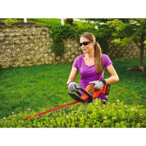 The BLACK+DECKER LHT2240CFF 40V MAX 22-inch Cordless Hedge Trimmer features a 22-inch dual-action blade reduces vibration for comfortable trimming (Compared to BLACK&DECKER single-action blade models). This trimmer can quickly cut branches up to 3/4″-in thick for a variety of trimming tasks. It has a offers a full length trigger and soft grip for convenient operation, along with a wraparound auxiliary handle makes it easy to maneuver vertically and horizontally. This unit also features a ‘state of charge’ indicator which shows the battery charge level at a glance. Maximum initial battery voltage is 40V (measured without a workload) – nominal voltage is 36V. Backed by BLACK+DECKER’S 3 year limited warranty. Includes: 1) LHT2240 Cordless Hedge Trimmer, 1) LBX1540 battery, 1) 40V MAX Charger.