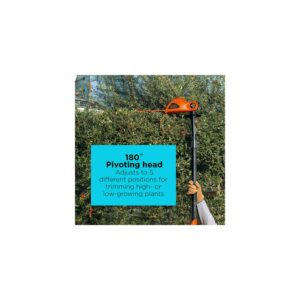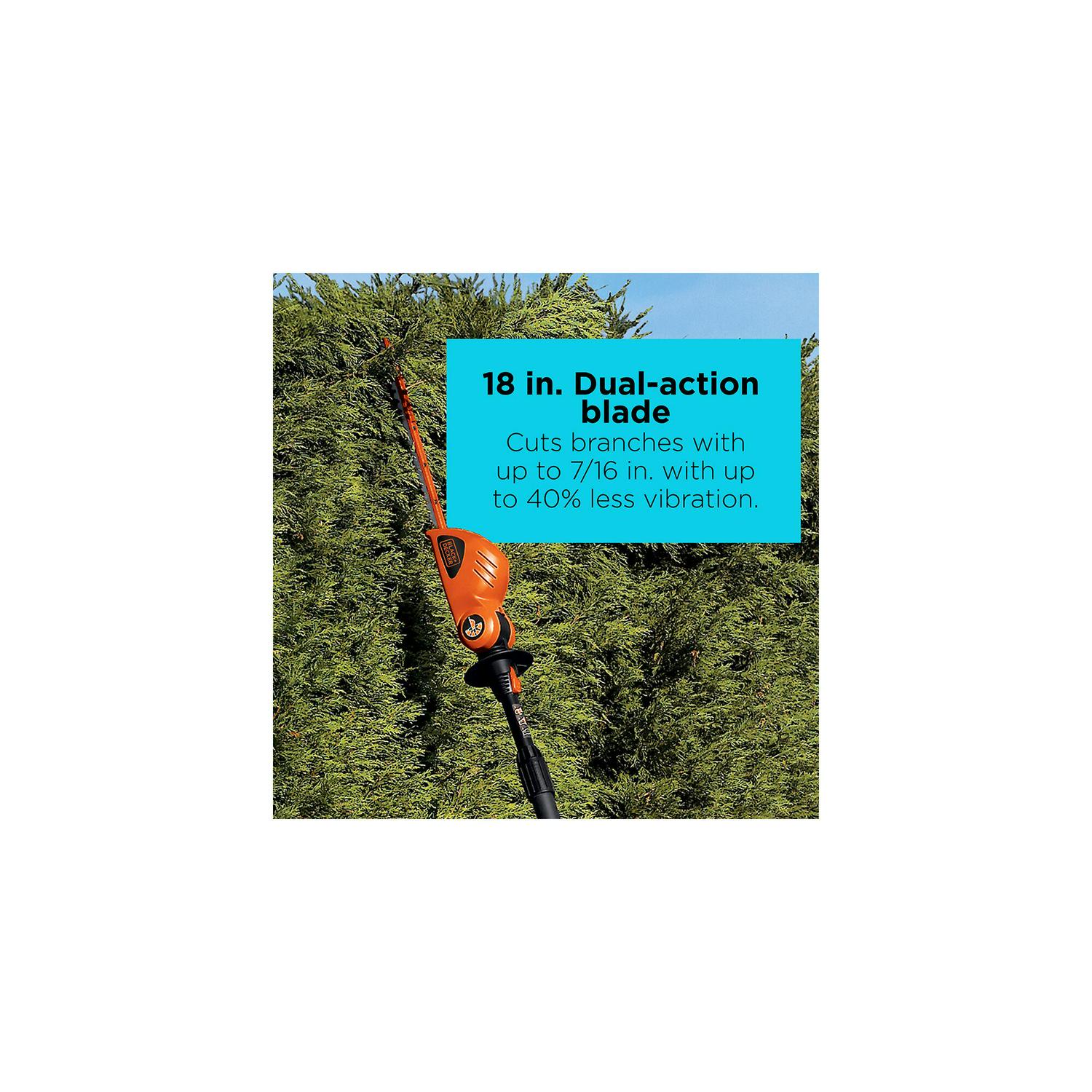 18″ Dual-Action Blade cuts up to 7/16″ thick branches with up to 40% less vibration while trimming. The 180-degree pivoting head adjusts to five different positions making it easy to cut high- and low-growing plants. At just 7.7 lbs., the lightweight design makes it ideal for clipping tall, awkwardly-sited, or hard-to-reach hedges and shrubs. Extendable length allows trimming up to 11 feet. Innovative rust-proof fiberglass sections inter-lock to provide a strong, secure connection. Soft grip handle provides added comfort during use. Hassel free trigger starts instantly everytime. Part of the 20V MAX* System – A System that Demands Attention. *Maximum initial battery voltage (measured without a workload) is 20 volts. Nominal voltage is 18.