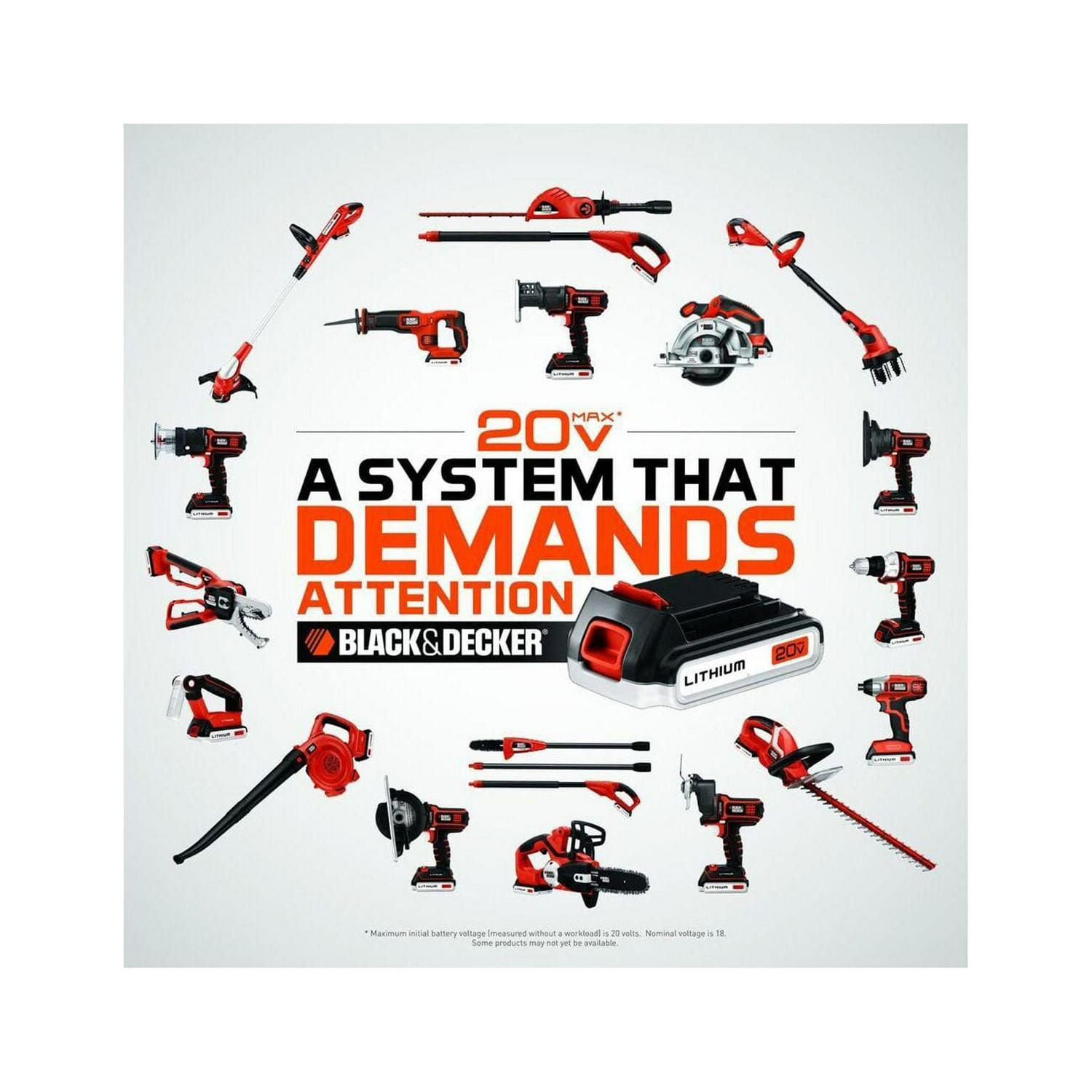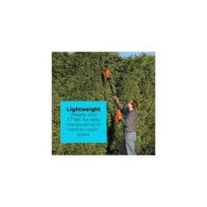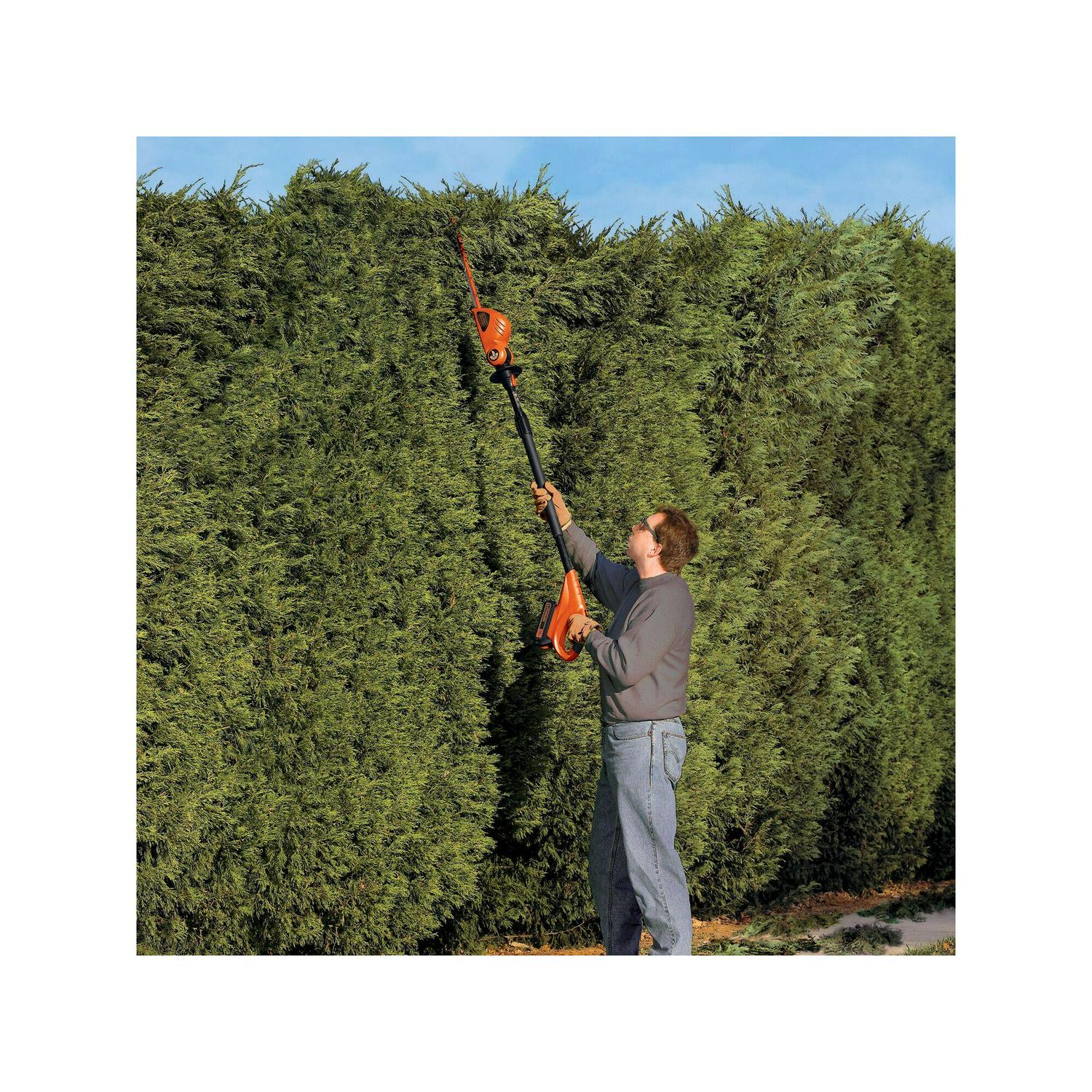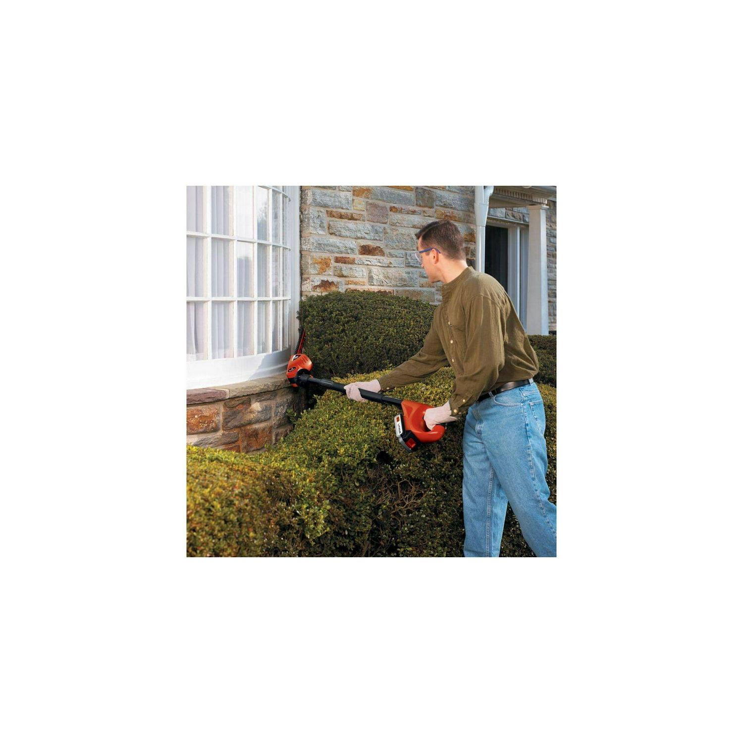 The BLACK+DECKER LPHT120 for trimming tall hedges and shrubs or pruning over and around obstacles, you want stability, control and comfort to get the job done safely and quickly. This cordless pole hedge trimmer offers all that plus more. Weighing in at just 7.7 pounds, its lightweight design makes it ideal for clipping tall hedges and hard-to-reach areas with surprising precision. It features a 180-degree, five-position pivoting head that allows you to trim the top, bottom or even behind a hedge cleanly and with precise, level results. Because trimming hard-to-reach spots can be strenuous work, we designed the LPHT120 cordless pole trimmer to be comfortable and easy to operate. Its 18-inch dual-action blade cuts quickly and easily through branches up to 7/16-inch and with 40 percent less vibration than conventional pole hedge trimmers reducing operator fatigue.