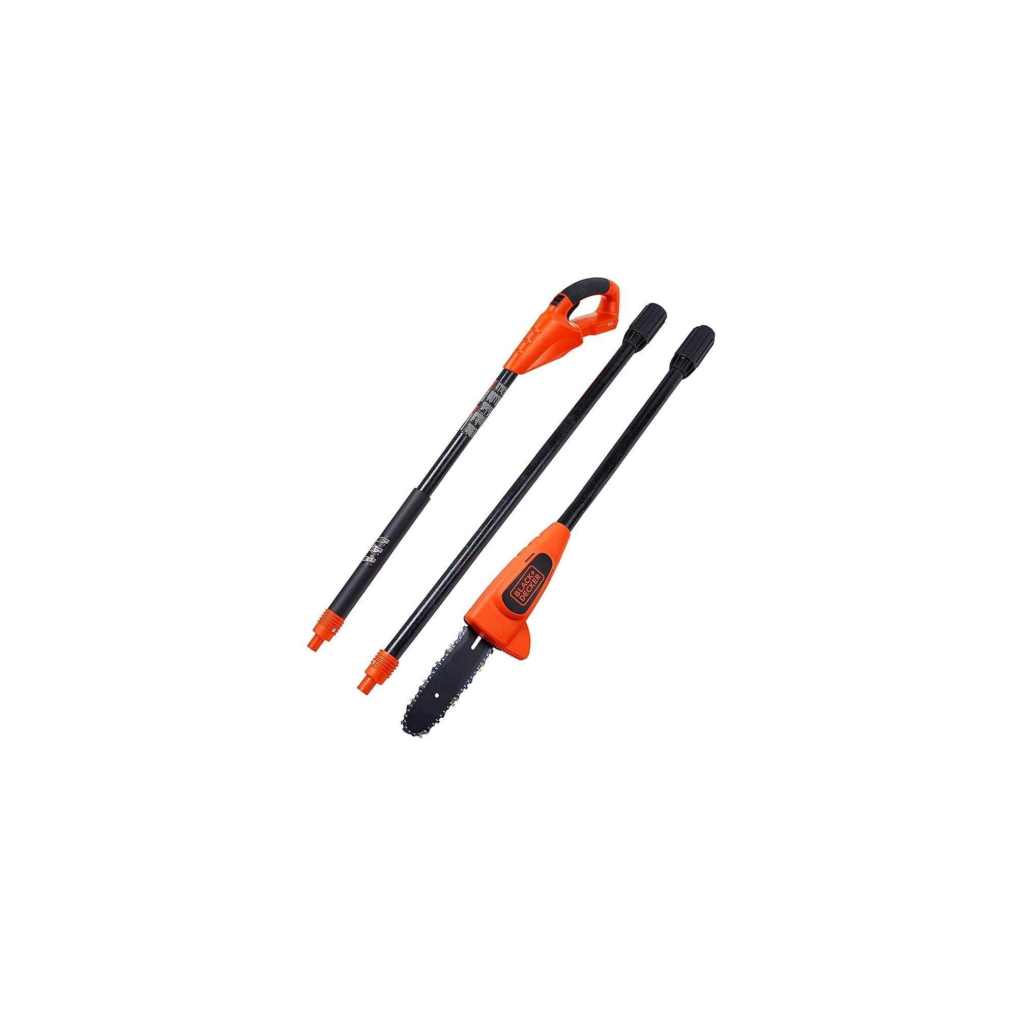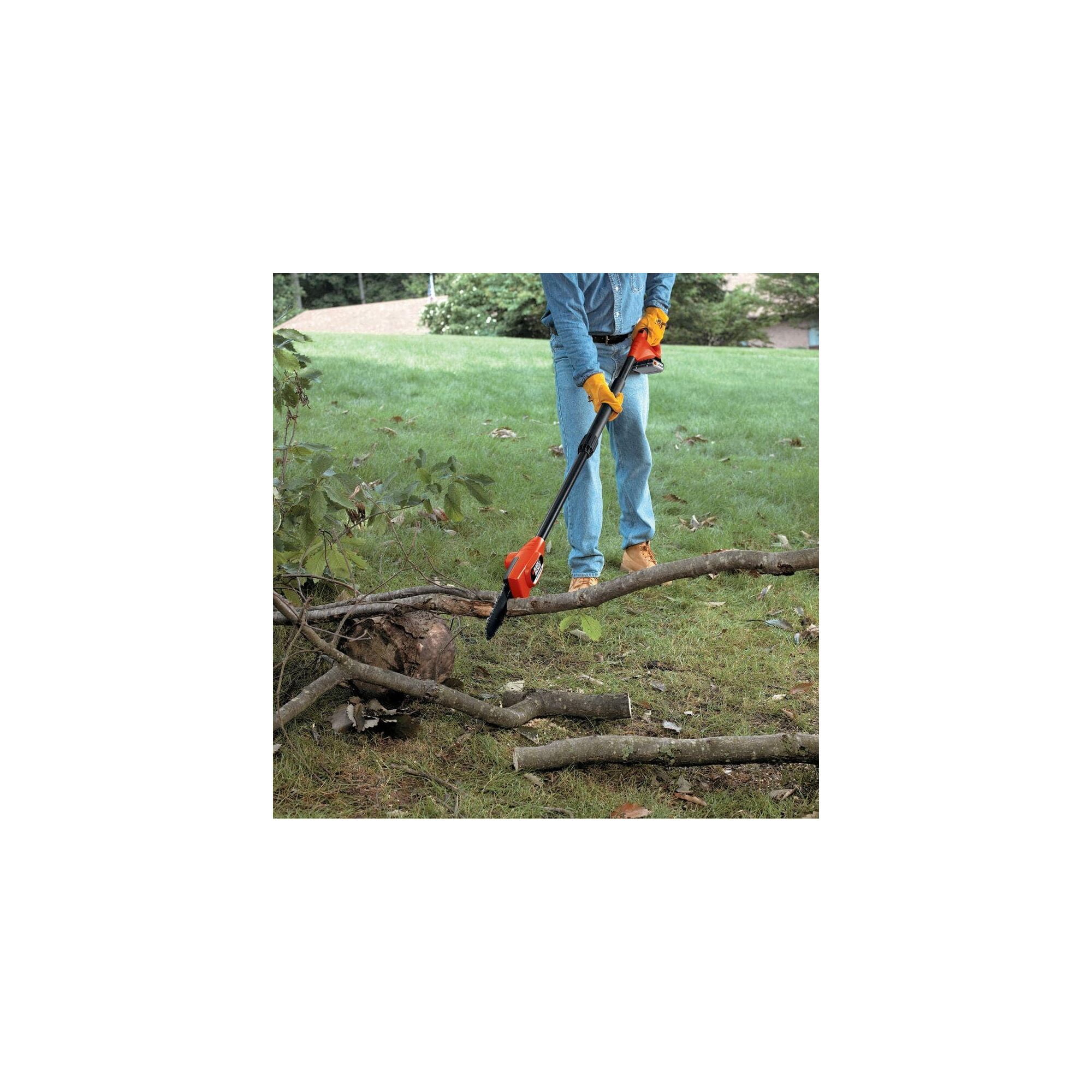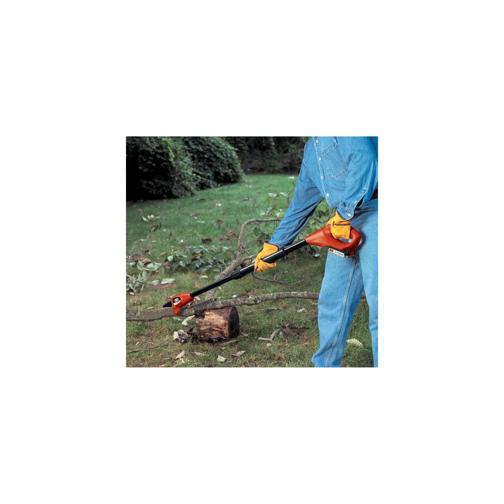 BLACK+DECKER electric lawn and garden equipment releases zero emissions in your yard, helping to reduce your carbon footprint. 20V MAX* Lithium Ion Battery (Not Included) Provides Up to 100 Cuts of 1 1/2″ Pine Branches Per Charge. 8″ Cutting Bar and Chain Allows for a Maximum Cutting Diameter of 6″. Center Extension Allows For a Usable Length of 6.5′ or 10′, Provides Overhead Reach of Up to 14′. In-Line Power-Head Allows Easy Maneuverability and Visibility Between Branches. Lightweight Design makes it Easy to Use. Replacement chain RC800.