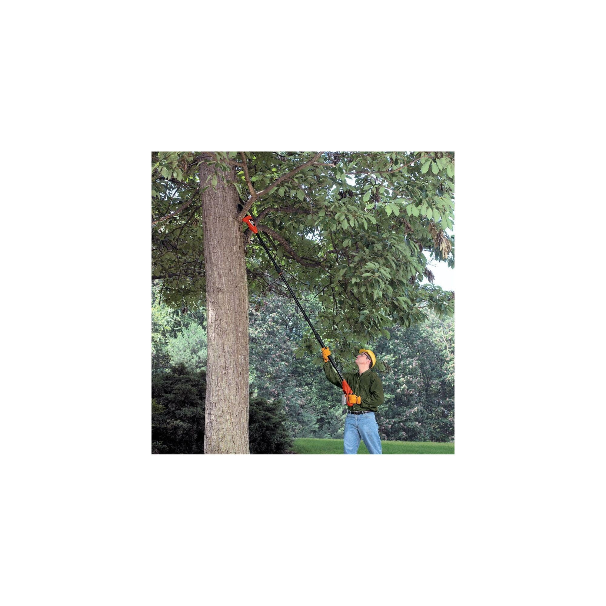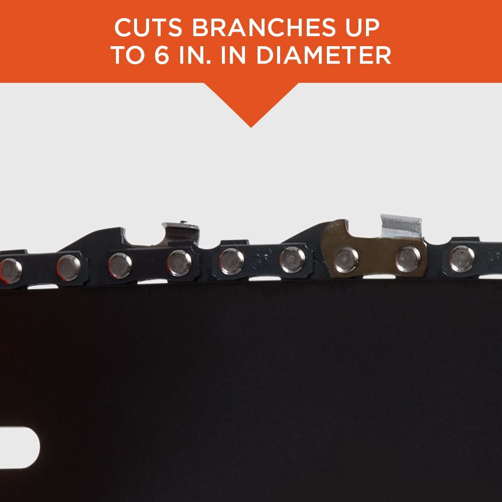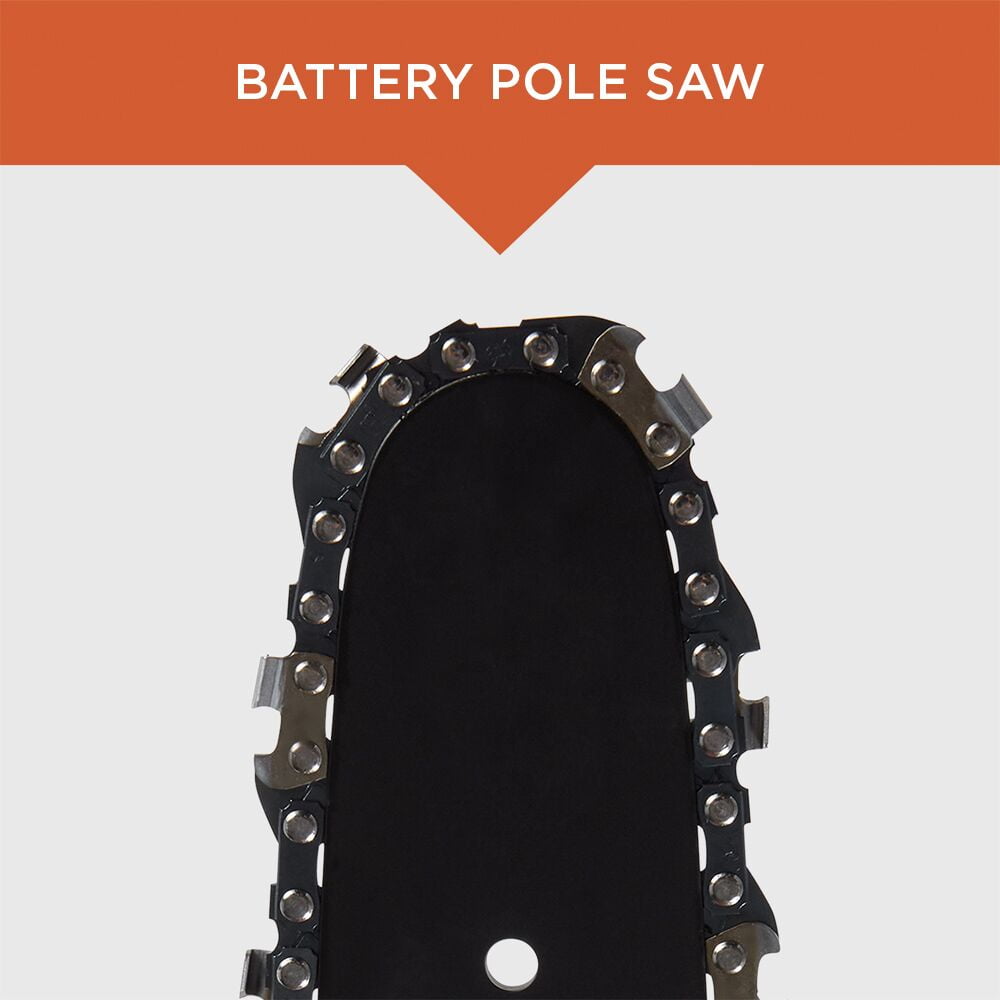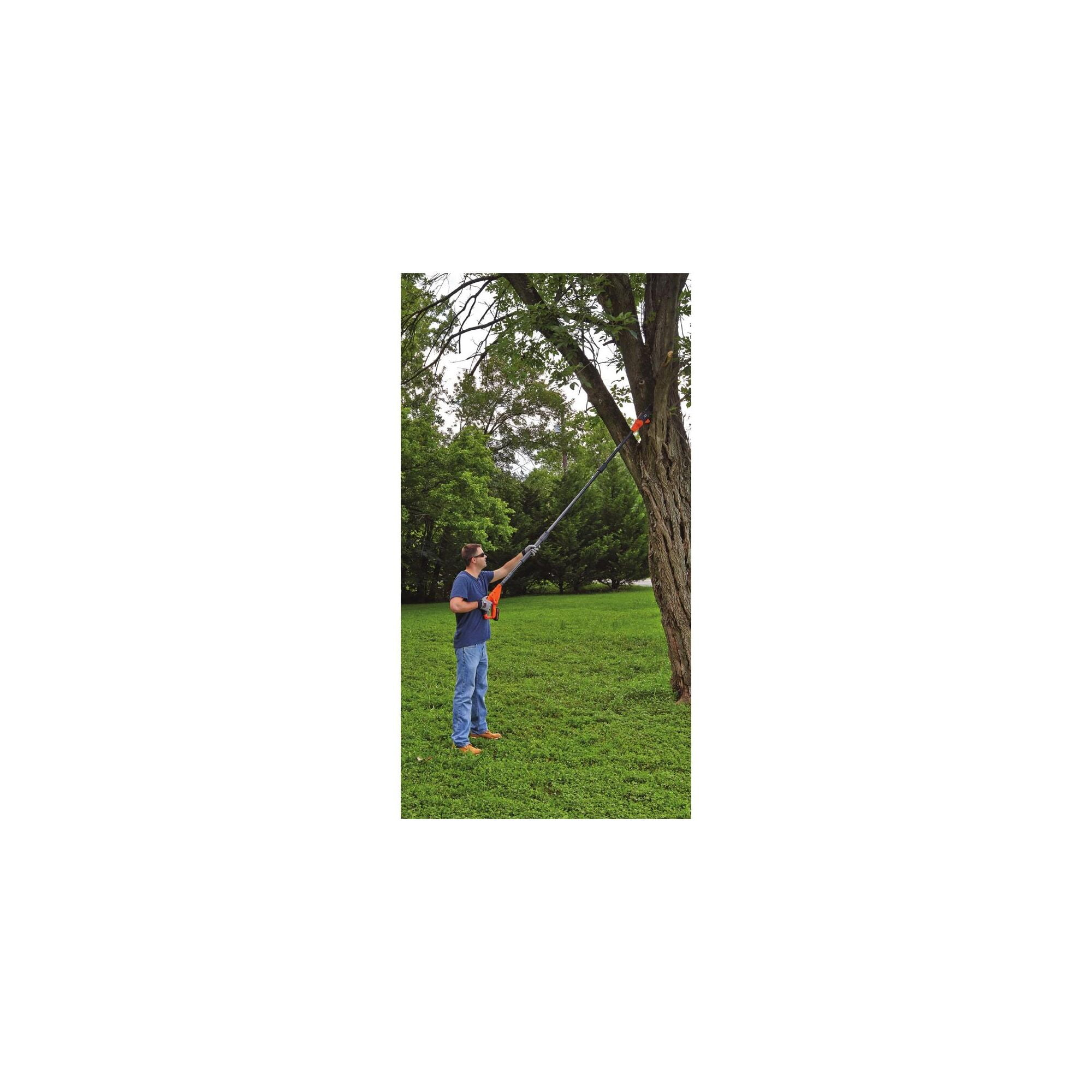 BLACK+DECKER electric lawn and garden equipment releases zero emissions in your yard, helping to reduce your carbon footprint. 20V MAX* Lithium Ion Battery (Not Included) Provides Up to 100 Cuts of 1 1/2″ Pine Branches Per Charge. 8″ Cutting Bar and Chain Allows for a Maximum Cutting Diameter of 6″. Center Extension Allows For a Usable Length of 6.5′ or 10′, Provides Overhead Reach of Up to 14′. In-Line Power-Head Allows Easy Maneuverability and Visibility Between Branches. Lightweight Design makes it Easy to Use. Replacement chain RC800.