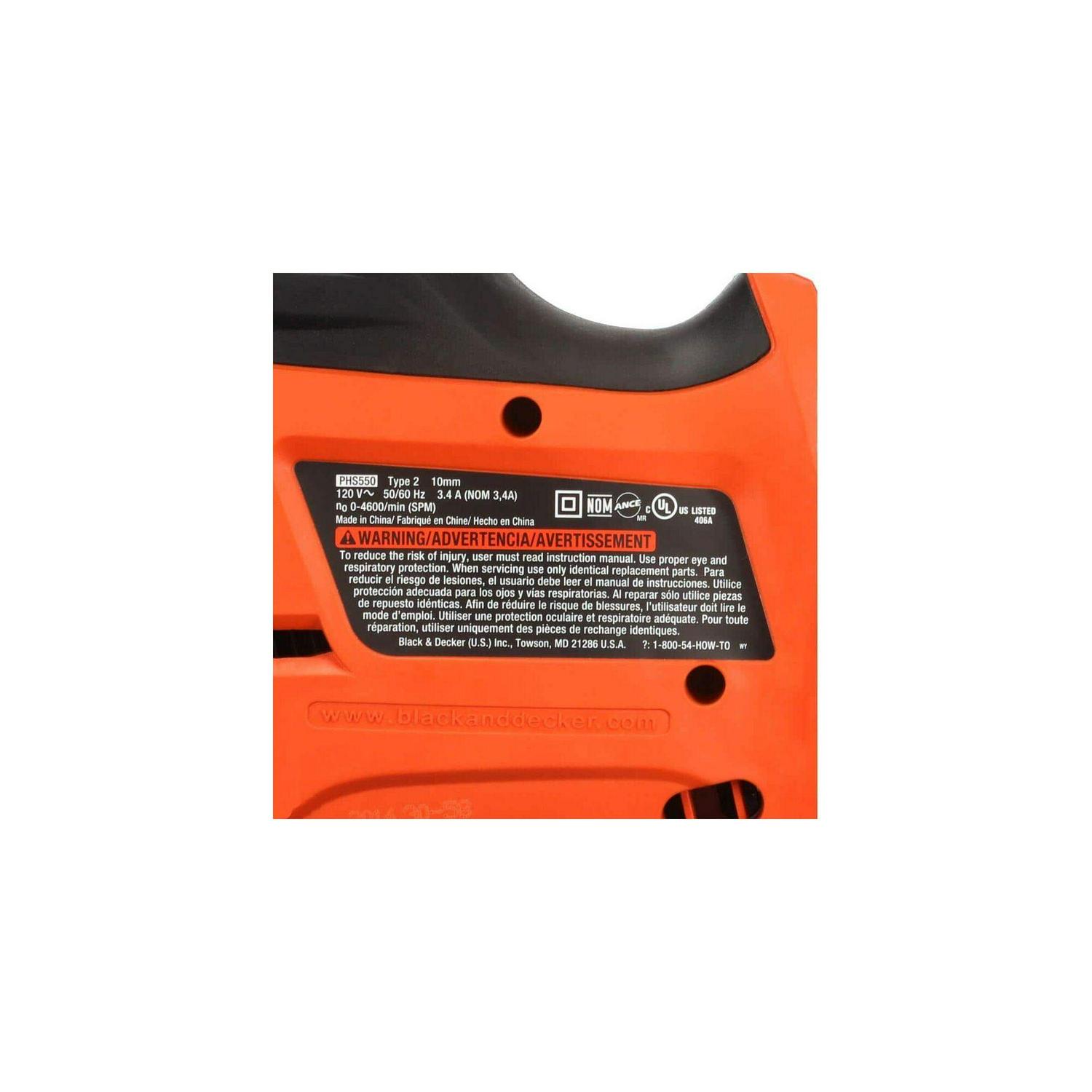 BLACK+DECKER PHS550B. Features: High performance 3.4 amp motor with 4,600 SPM for controlled cuts in wood, plastic and metal. Compact and lightweight design makes it easy to control. Quick and easy tool-free blade changes. Versatile for both indoor and outdoor applications. Ideal for straight cutting applications.