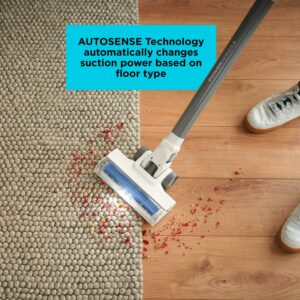 – Autosense technology automatically changes suction power based on floor type, optimizing runtime