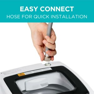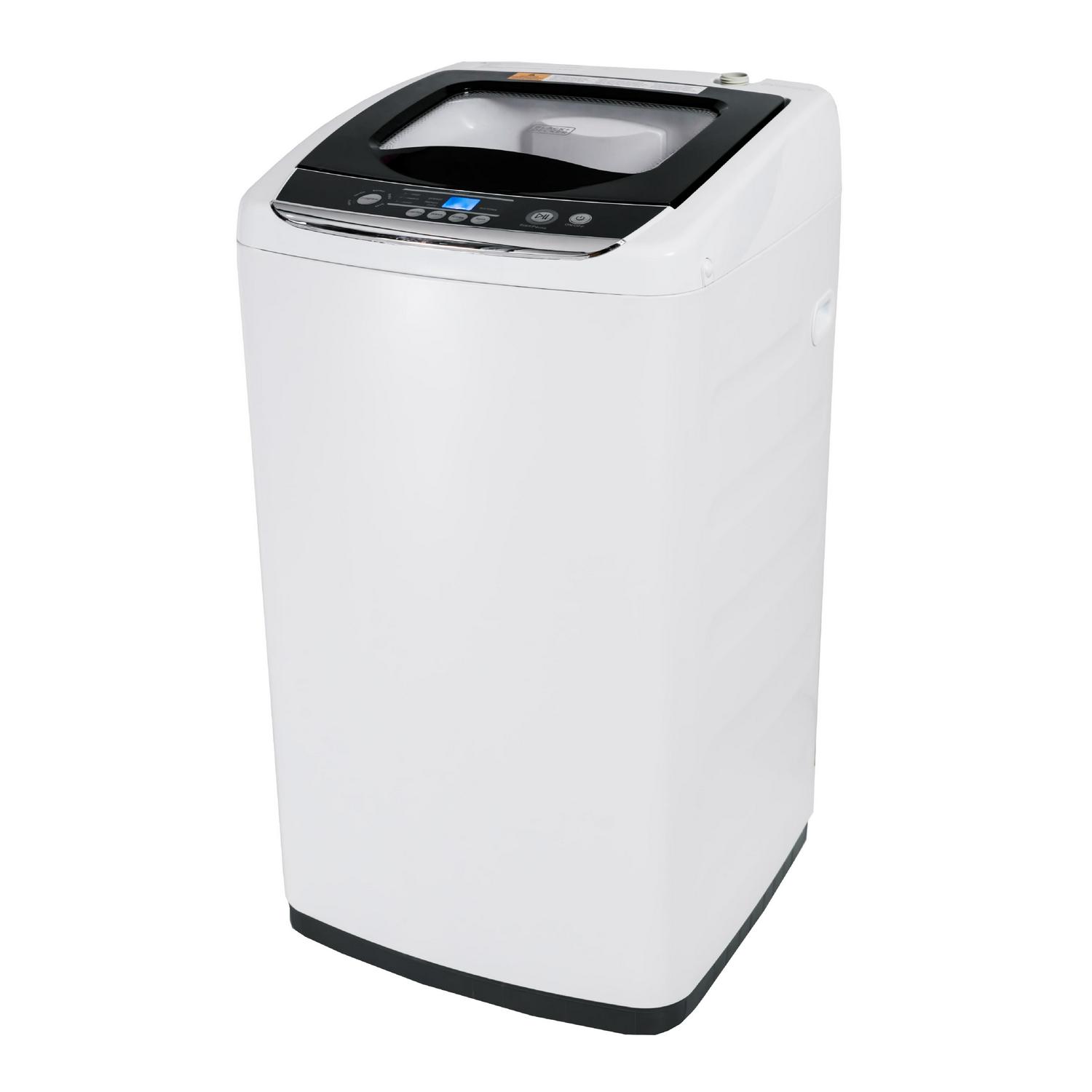 When it comes to washing machines, this outstanding BLACK+DECKER 0.9 cu. ft. portable washer (17-11/16 x 18-1/16 x 31-1/2 ) is your ultimate solution to immaculately clean clothing for household use. There are 5 cycles to choose from: Heavy, Gentle, Normal, Rapid, and Soak. Cold water temperature settings available with three water level choices for small, medium, and large loads. Inside this small washer (44.1 lbs.), you ll find an incredible stainless steel tub with a quiet close top loading transparent lid. Place anywhere in your home or area with 2 rollers, 2 side handles, and 1 adjustable front leveling leg. This unit comes with a drain hose and quick connect sink adaptor. Also included are auto shutoff safety features, Delayed Start up to 24 hours, and Child Lock protection.
