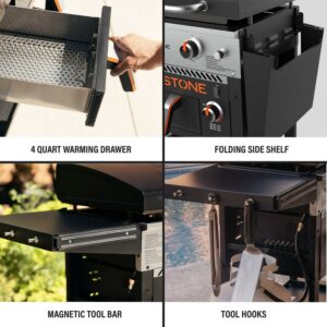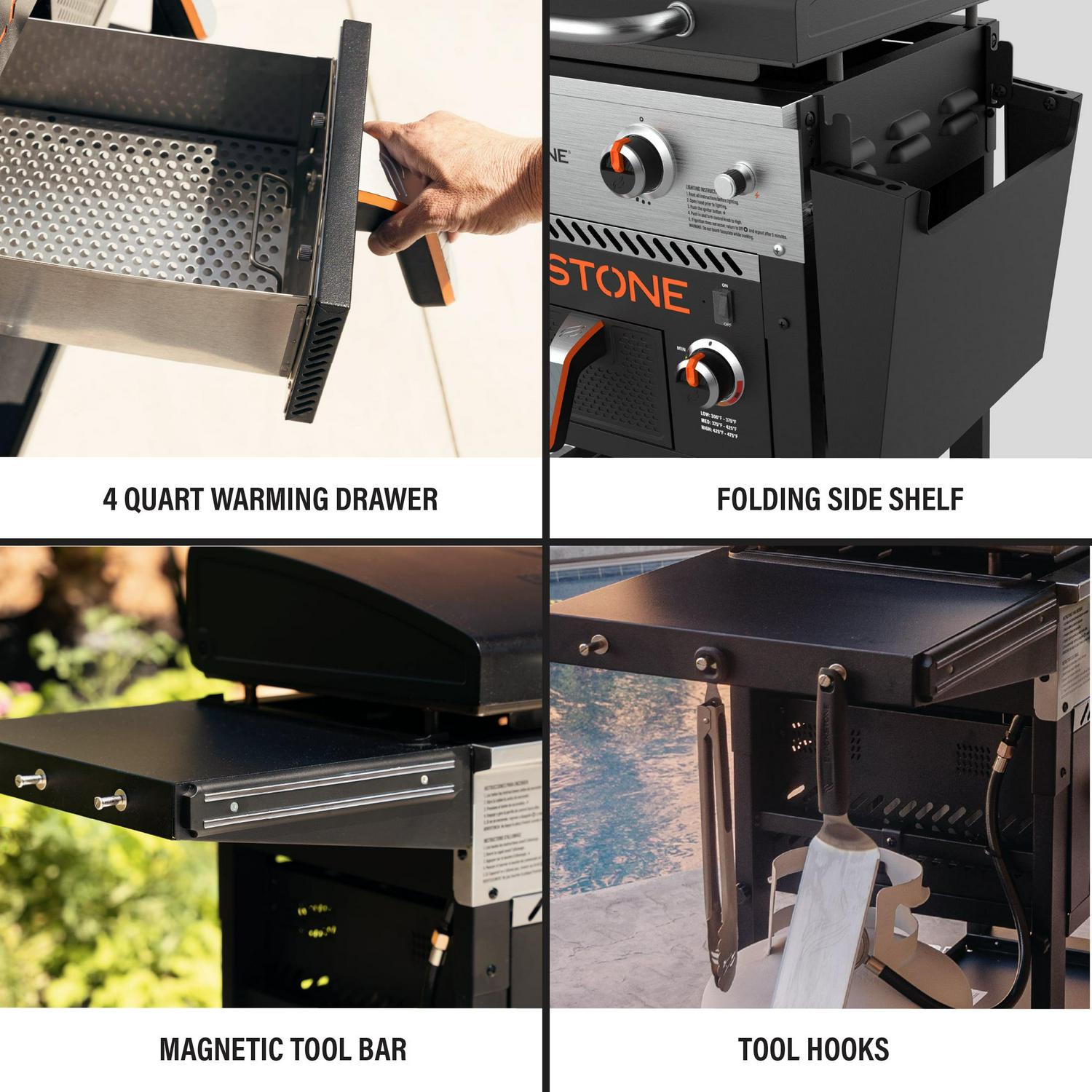 With the Blackstone 28-inch Propane Griddle With Air Fryer, you can do it all: bake, sear, roast, saute, and air fry. This one-of-a-kind griddle makes cooking the simplest of meals that much more satisfying. The 524-square-inch cooking surface with two independent cooking zones with a combined 34000 BTUs provides you with all the room you need to cook meals for large groups of people. It also features one 2-quart air fryer drawer and a warming drawer, so you can cook up some fries while griddling a tasty smash burger on your griddle surface. We have included all of your favorite features including a hood to keep your griddle top safe, accessory storage hooks, accessory storage magnets, and dual side shelves. With everything you can do with this griddle, you’ll be drooling before you can even take it out of the box.