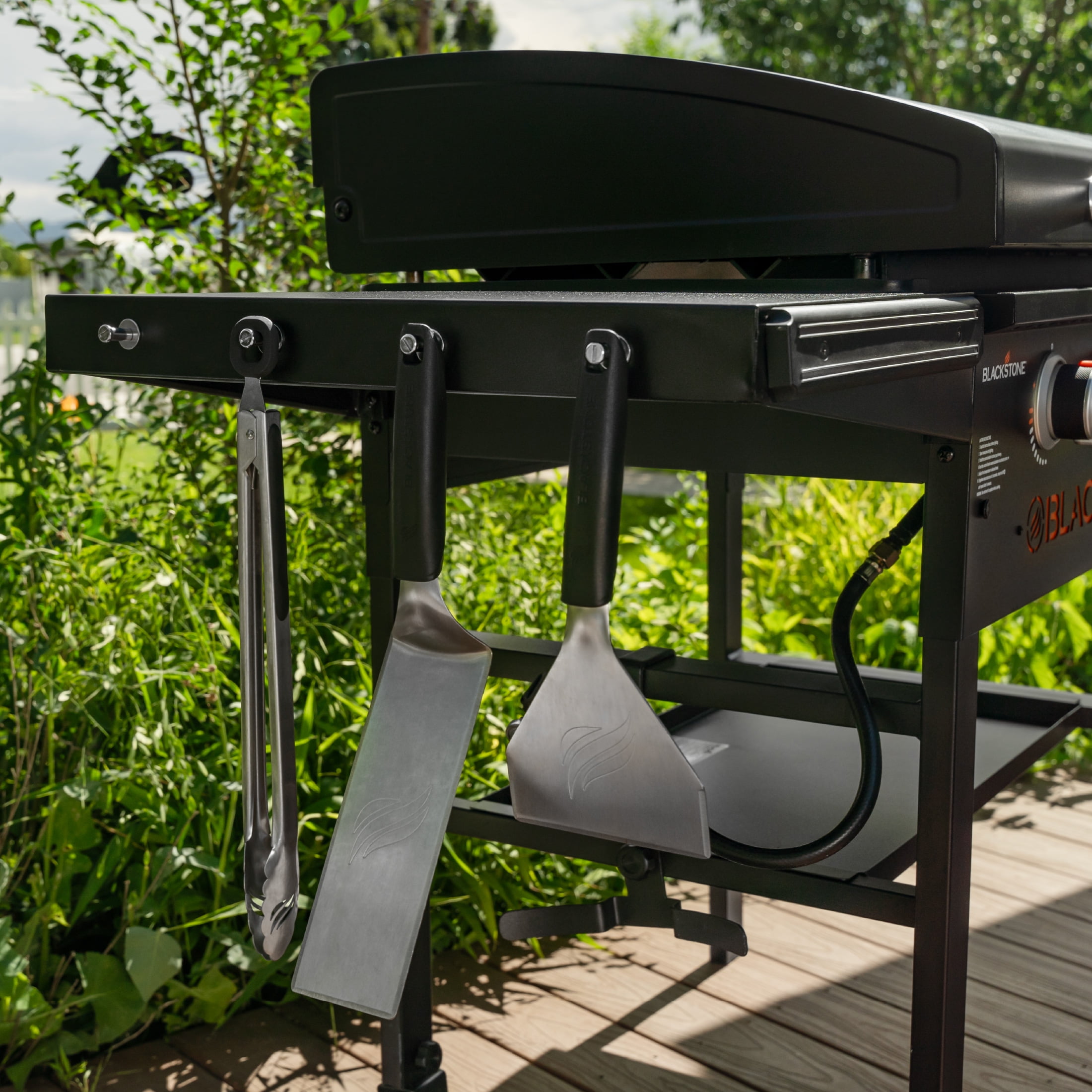This is not your typical 28-inch griddle. With three independent burners instead of the typical 2, you have more control over your heat zones on the Blackstone 3-Burner 28″ XL Griddle with Hood. Instead of your normal 34,000 BTUs, this griddle boasts a scorching 48,000 over 613 sq. in.! The flat top griddle features Blackstone’s patented rear grease trap, so you can push all debris and grease out the back with ease. The hood can be used for protecting your griddle from dust and dirt, or for trapping in heat when cooking. This propane-powered flat top grill features two shelves with tool-holding hooks and a magnetic strip so you have all of your tools easily at your disposal.