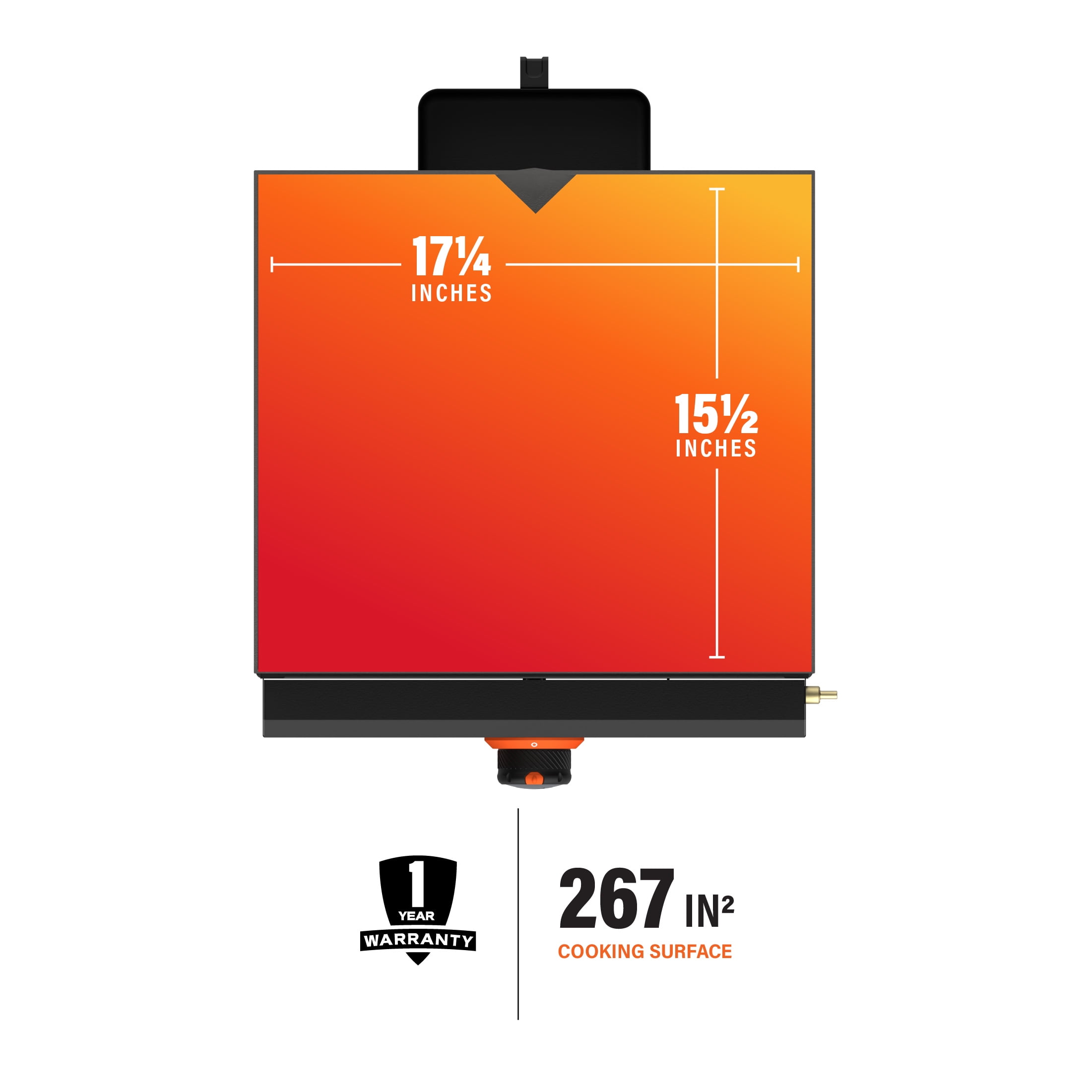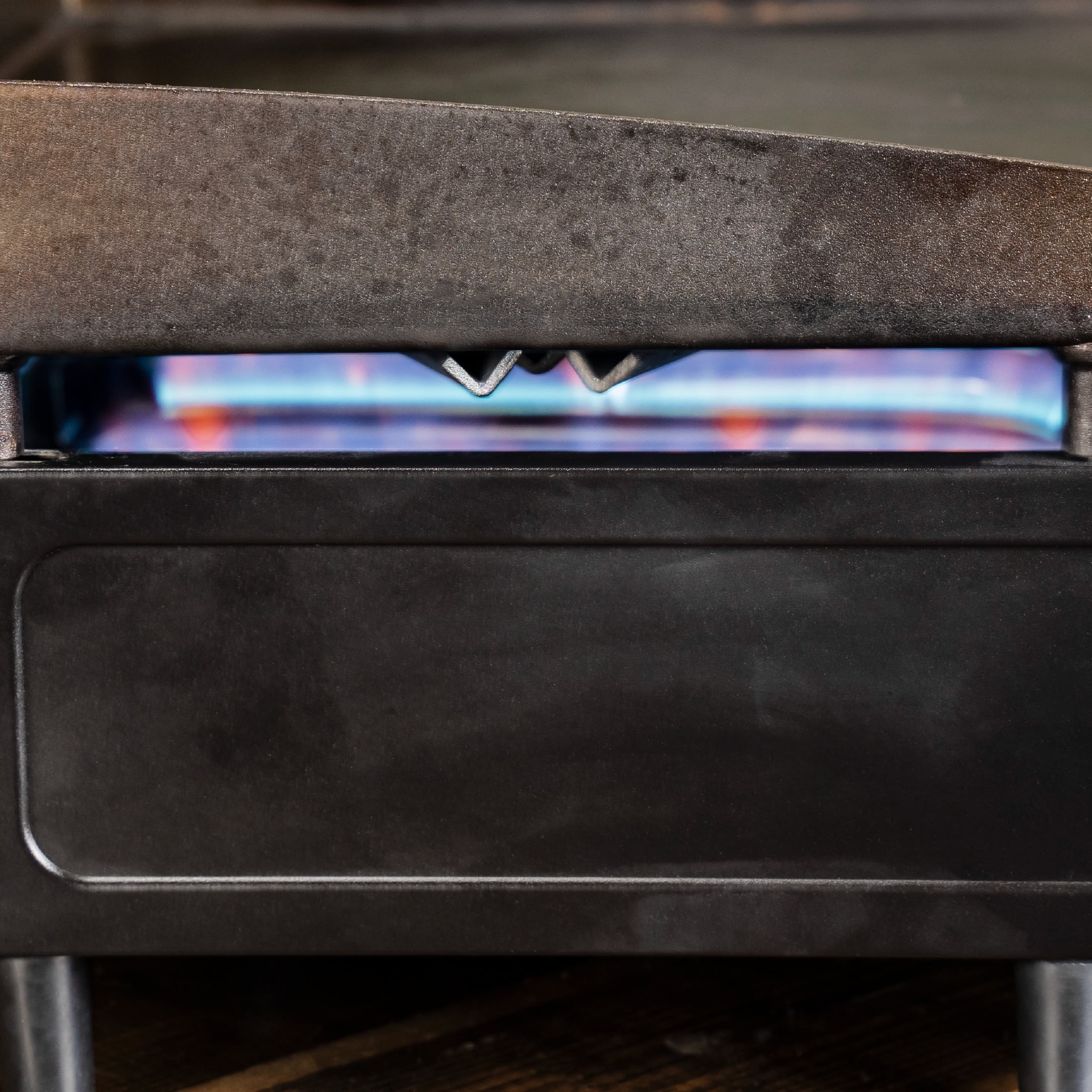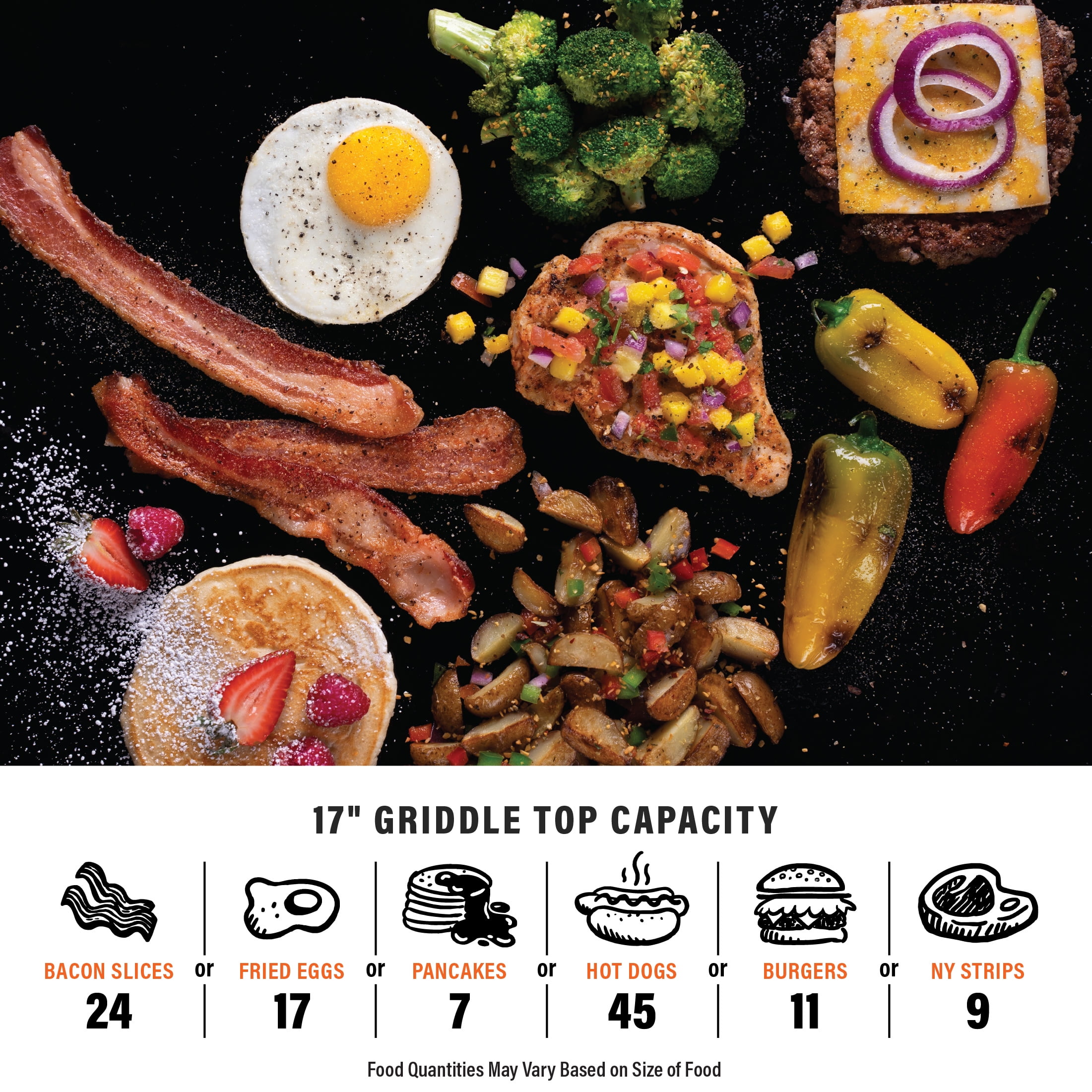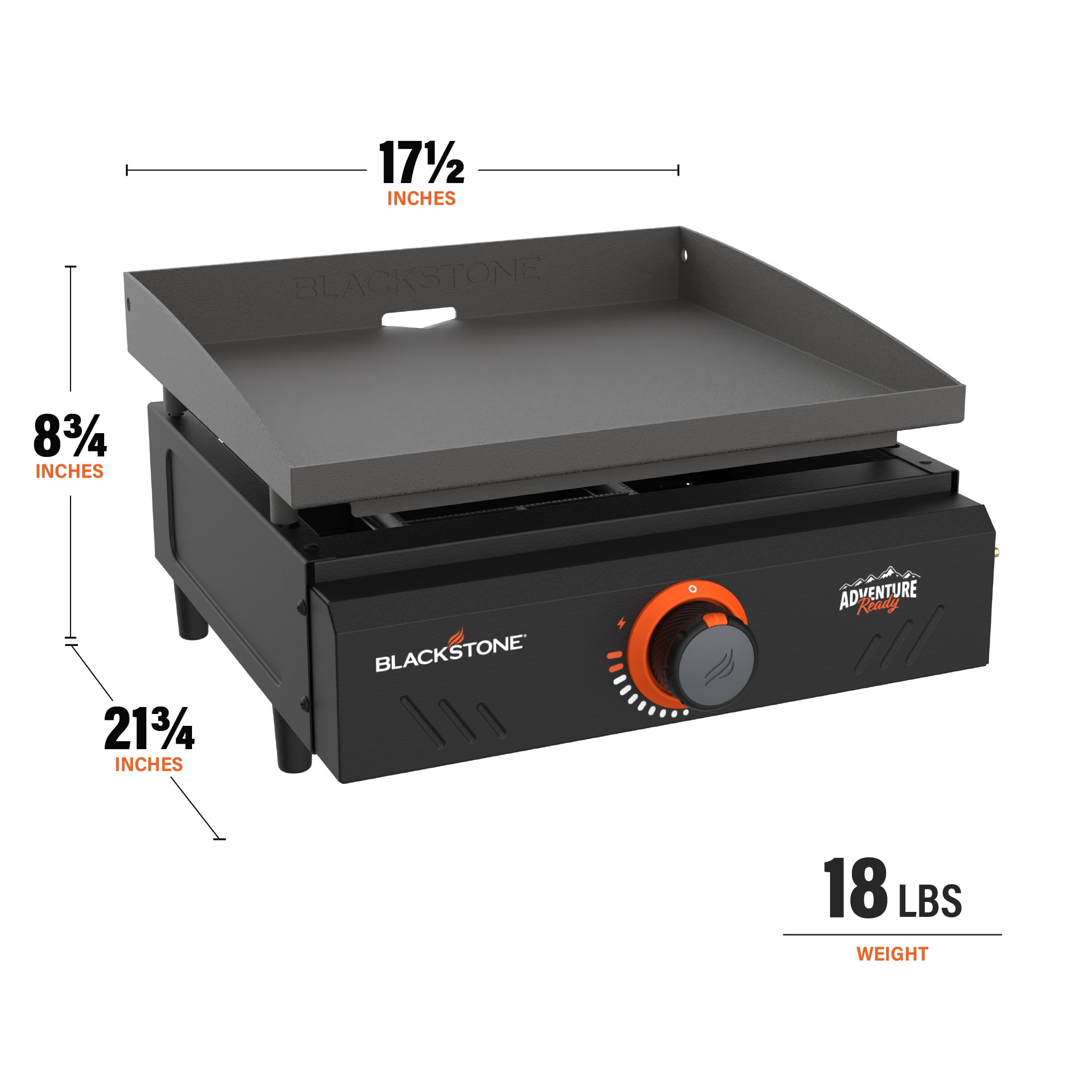 Hurry to your next camping destination with this Blackstone Adventure Ready Single Burner 17” Tabletop Griddle. Fast heating and quick and easy clean-up make this griddle perfect for on-the-go adventures. With a 267 sq. in. cooking area powered by 12,500 BTUs, this griddle is great for cooking for a group while being compact enough for easy storage and transportation. The Blackstone-patented rear grease management system included on this griddle prevents grease from dripping down the front of the griddle and makes cleaning off the griddle so much easier. Additional features, including non-slip, screw-in feet and push-and-turn Piezo ignition, make for easier assembly and start up so you can focus on enjoying the outdoors.