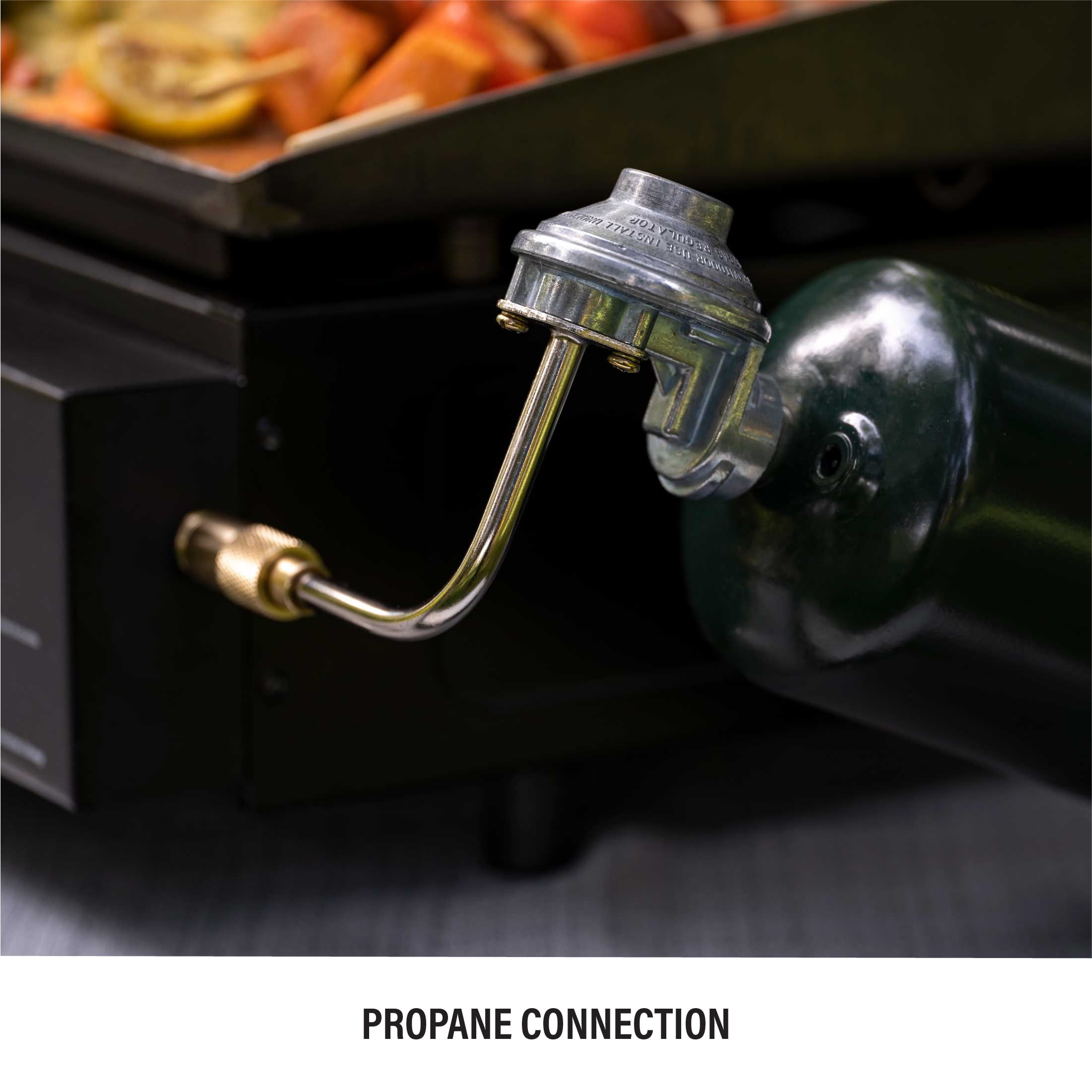 Blackstone Adventure Ready Single Burner 17” Tabletop Griddle with Piezo Ignition Heavy duty rolled steel griddle plate with 267 sq. in. cooking area Stainless steel, H-style burner with 12,500 BTUs for even heating and cooking Push and turn Piezo ignition with adjustable heat control Compact design for easy storage and transportation Blackstone-patented rear grease management system for easy grease control Fueled by propane with integrated 1 lb propane tank connector (propane tank not included) Non-slip screw in feet to keep griddle in place 1-Year Limited Warranty Customer Service: +1 (435) 252-3030 Ext. 1 Model # 2127