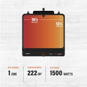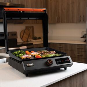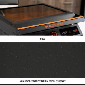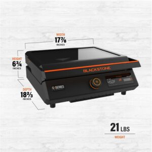 Introducing the Blackstone E-series 17″ Electric Tabletop Griddle with Hood. This 17″ E-Series Griddle is a brand new style from Blackstone and is perfect for any occasion, whether it be indoor or outdoor. The 238-sq-in griddle plate is machine cast with a durable and elegant ceramic-titanium coating. It has a clean-catch, low profile, rear grease management system. The entire grease cup is dishwasher safe making cleanup simple. You can rotate and remove the E-Series hood for ease of use. Control the temperature with the EZ-Touch control dial and the large LCD Display. If you are new to Blackstone cooking or in the market for an indoor griddle with outdoor performance, this is the griddle for you.