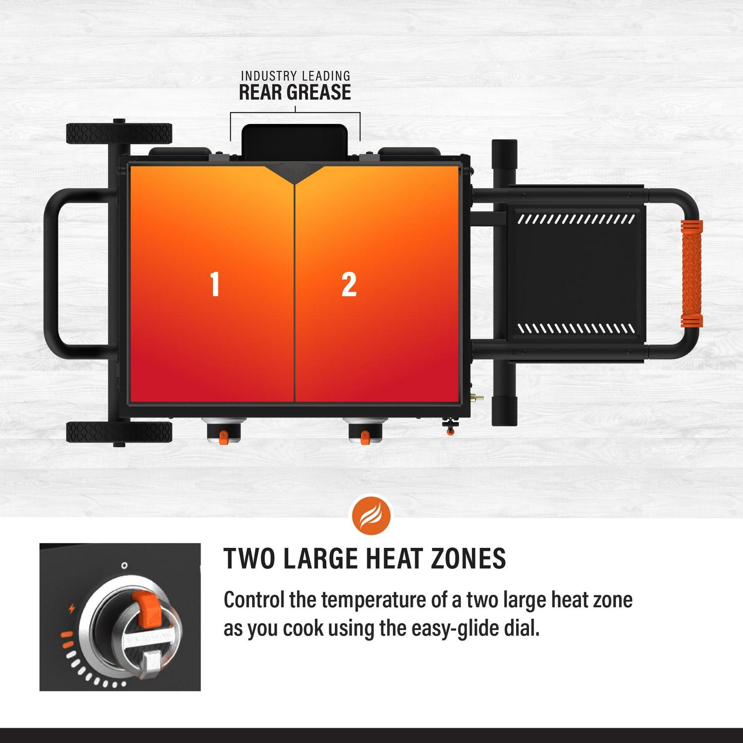 - Blackstone 22″ grilling surface (361 square inch cooktop surface) with 2 independent cooking zones