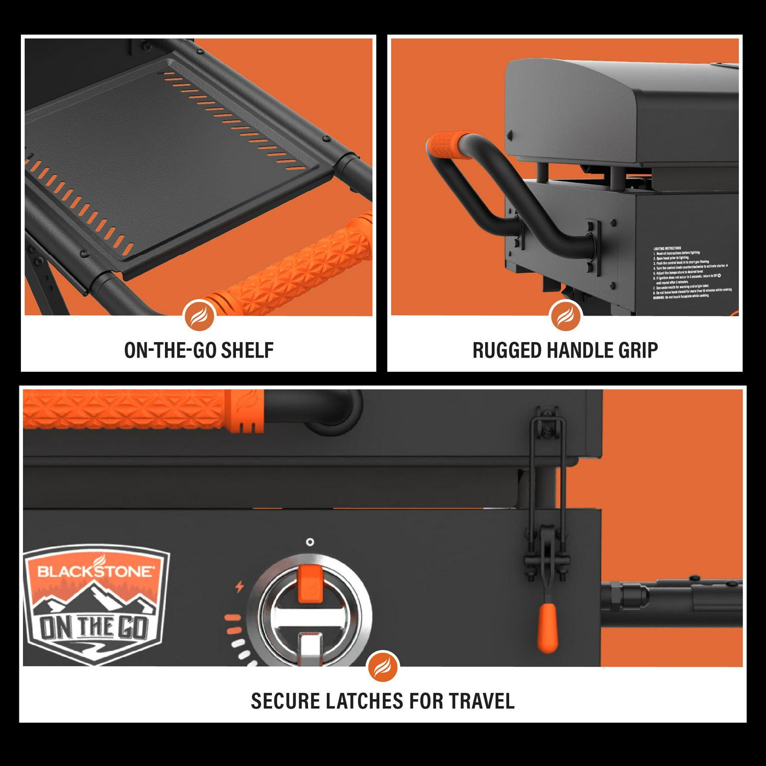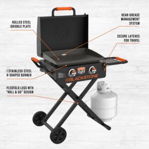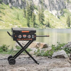The Blackstone On the Go 22″ Propane Griddle with Scissor Legs is the portable griddle that makes it easy to cook top-notch meals outdoors. “Roll & Go” scissor leg design allows easy transportation of the griddle to the beach, park, campground, tailgate, or any other outdoor location. When you are done cooking, the BBQ griddle collapses for easy storage and carrying. The classically styled painted hood, an orange On The Go handle grip, updated national control knobs and a Piezo ignition makes the Blackstone On The Go outdoor griddle a must-have for any outdoor cooking enthusiast.