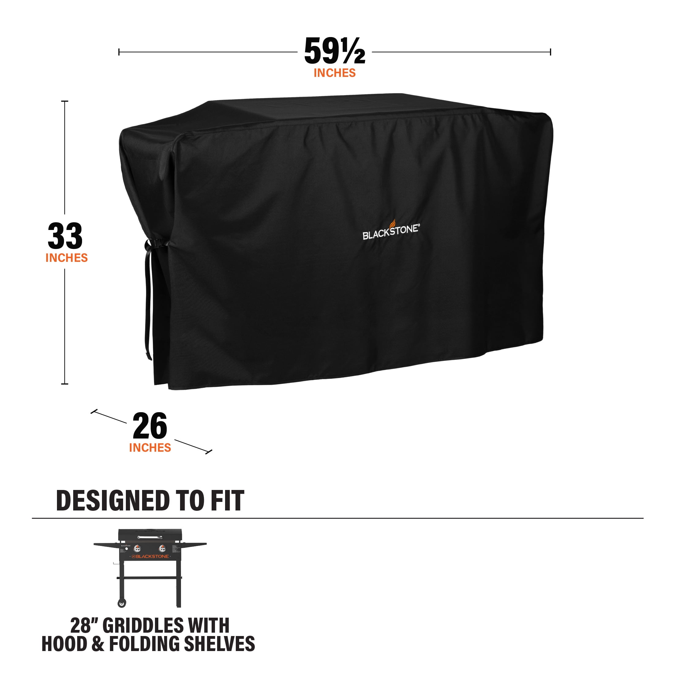 Blackstone Original 28” Griddle Cover (Model 5483) – 59.5” L x 26” W x 33” H Fits Blackstone 28” griddles with a hood and side shelves 600 D polyester canvas construction Weather-resistant and UV treated material to protect your griddle from the elements Built to last with reinforced stitching that adds strength to the corners and seams High impact side buckles that can be cinched for a secure fit Approximate dimensions: 59.5” L x 26” W x 33” H (fabric can conform to fit items with similar dimensions) Model #5483