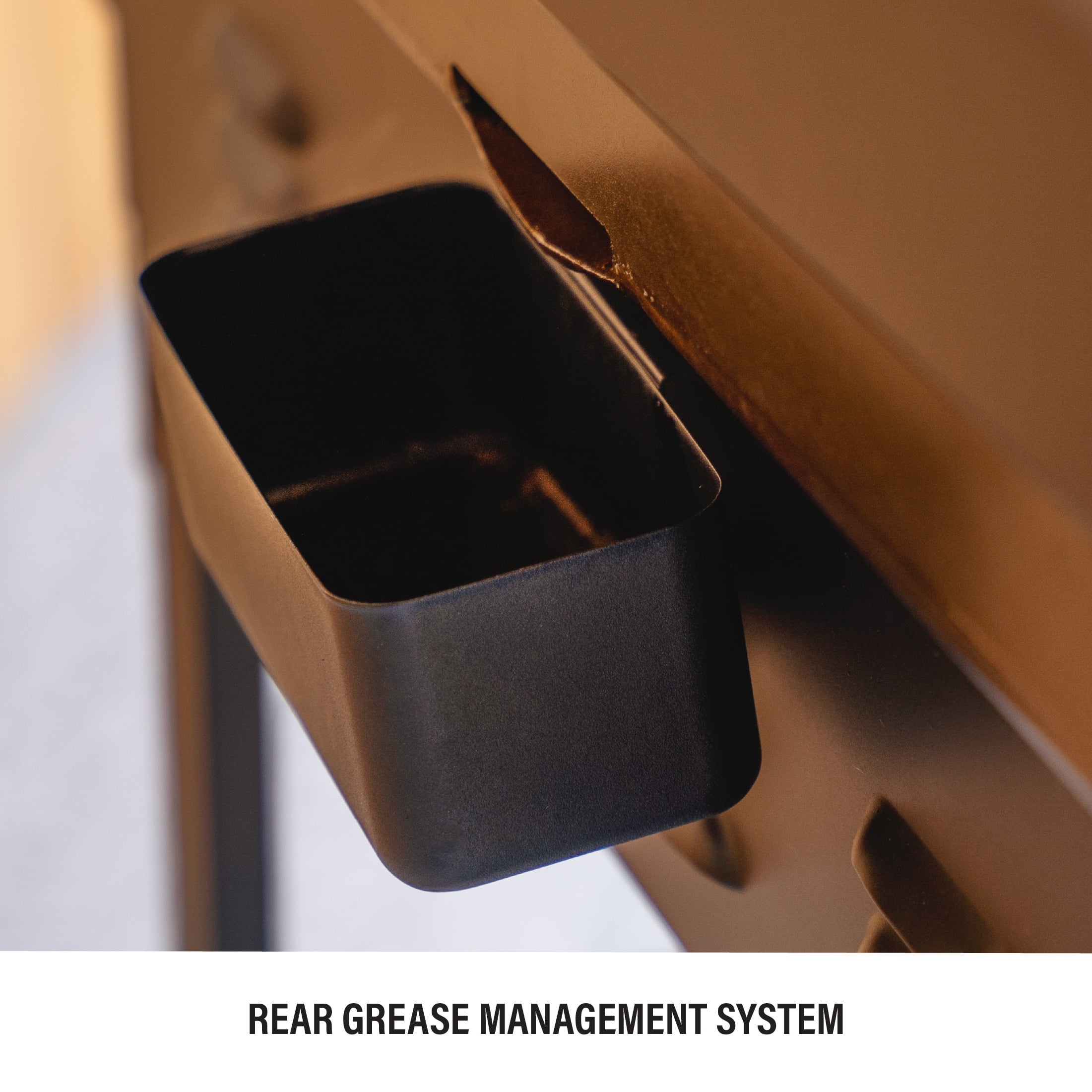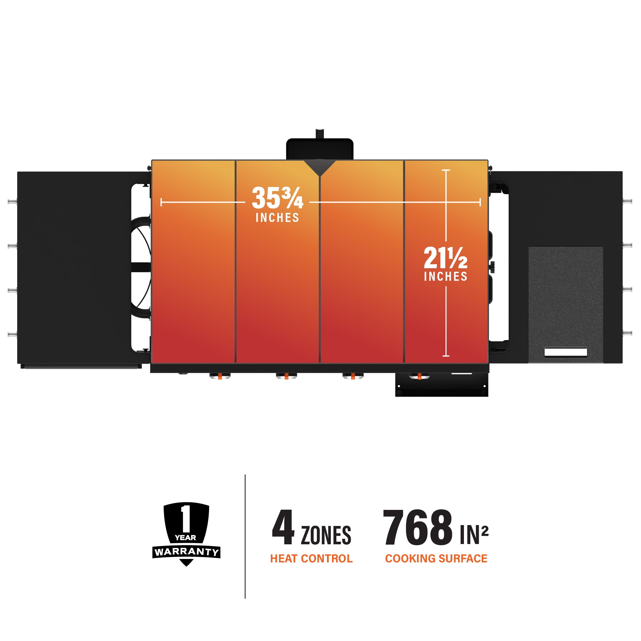 Amp up your outdoor cooking with the Blackstone Original 4-Burner 36” Propane Griddle with Hood and Omnivore Griddle Plate. Built with Blackstone-patented Omnivore griddle plate technology, this griddle is designed to heat up quickly and evenly, prevent warping, and use less fuel so you can enjoy more predictable cooking. 768 square inches of cooking area and 4 independently heated zones give you enough room to cook all your favorites with precision. Storage bin rails and an accessory bin provide additional storage for items needed throughout the cooking process. The addition of a side shelf cutting board, paper towel holder, and side shelf tool hooks keep all your prep tools in one place, making food prep more efficient. Fun additions such as a bottle opener, magnetic tool bar, and a hood with a non-slip handle make cooking delicious meals on the griddle that much easier.
