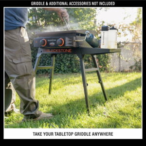 The Blackstone Griddle Accessory Table is perfectly designed to fit Blackstone 22″ and 17″ table-top griddles. The extra-large frame gives you more room to place a 1 lb. tank and still have plenty of prep space on the side shelf. With independently adjustable height for each leg, this table is easy to use on any terrain. The table is completely portable with foldable legs and a removable shelf. Made from durable metals, this stand is ideal for any outdoor adventure.