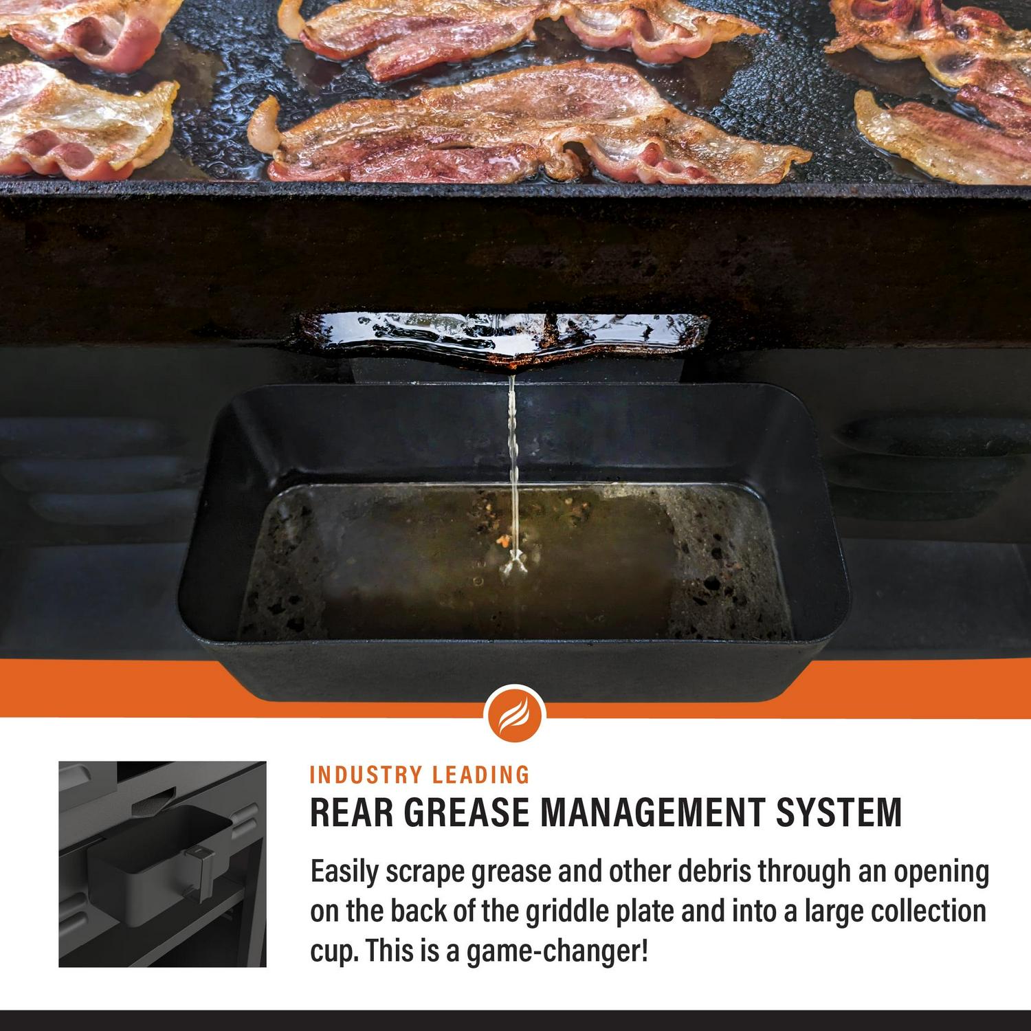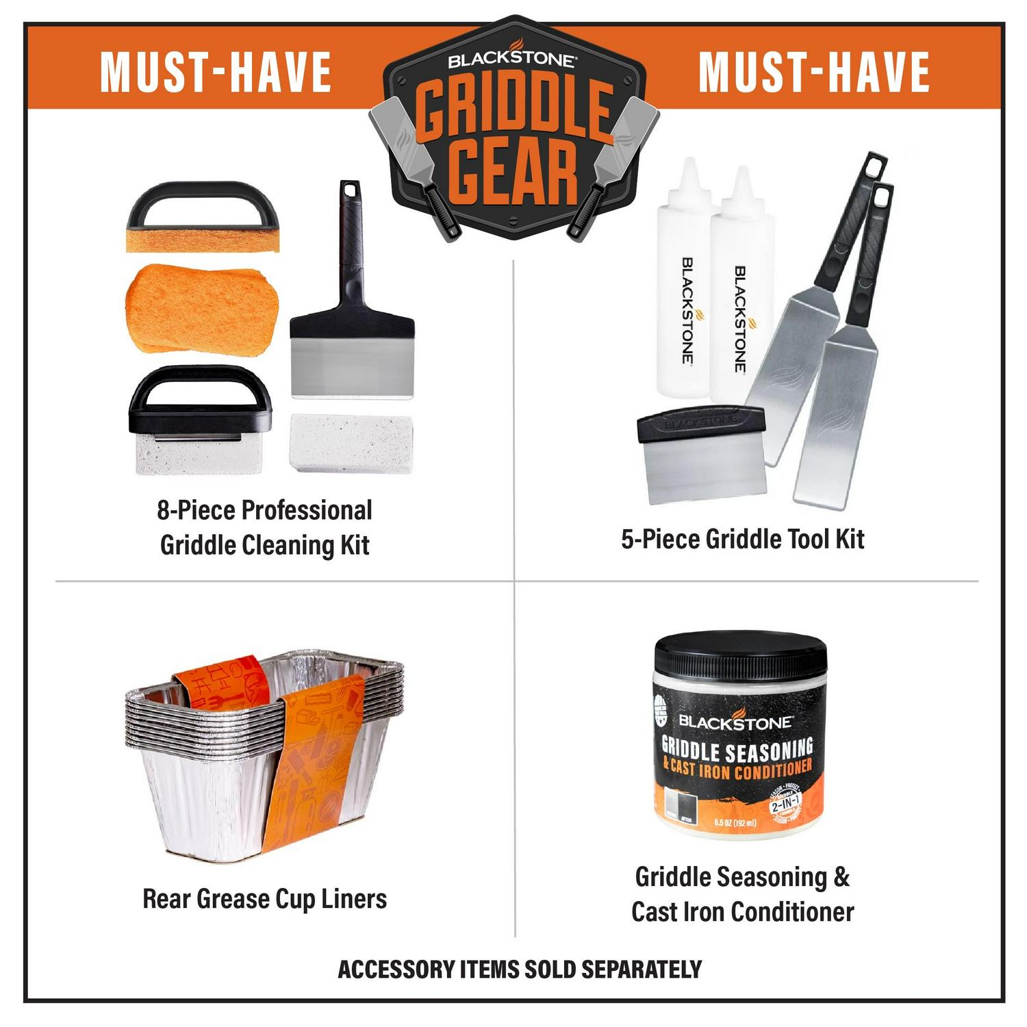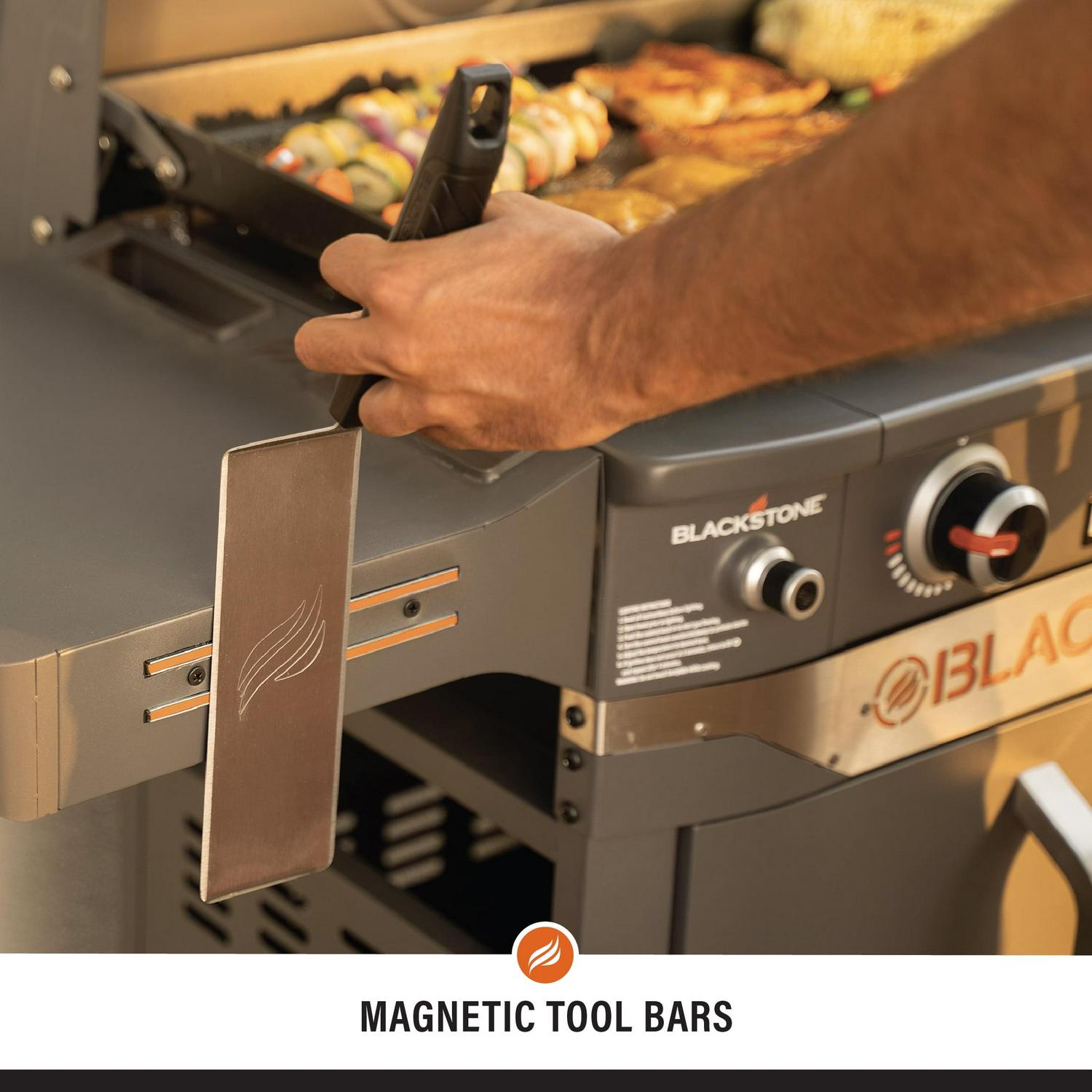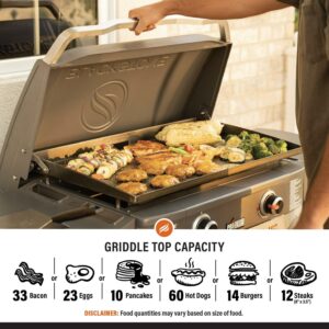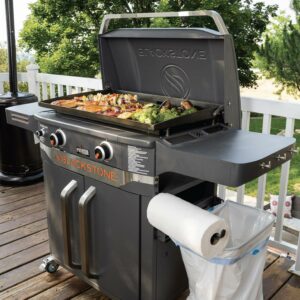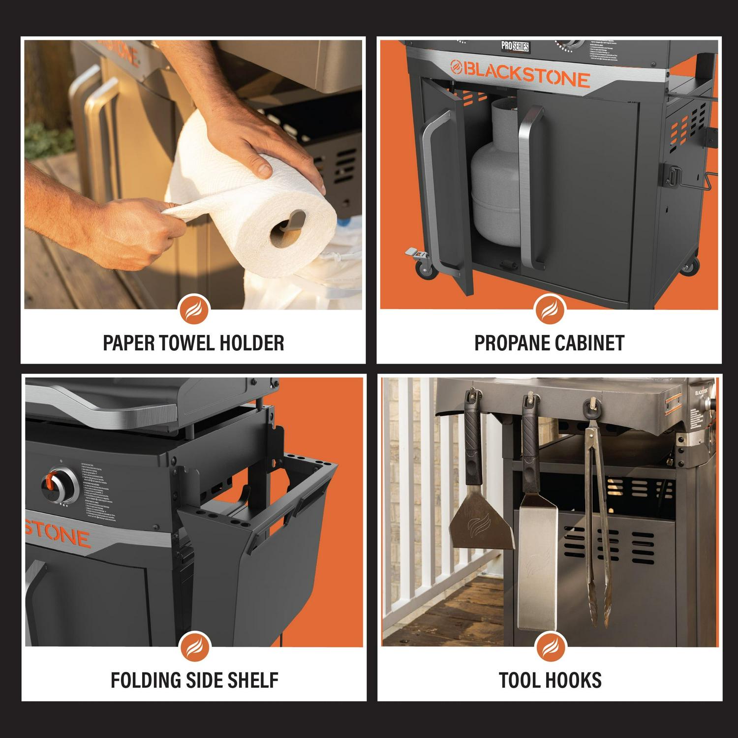 Griddle up a feast like a pro with the Blackstone ProSeries 2 Burner 28″ Propane Griddle with Cabinet and Hood. With a 524 sq in cooking surface and 34,000 BTU’s, you’ll have plenty of power and grill space for your next outdoor barbecue party. Have everything you need at a single cooking station to save trips back and forth from the kitchen or car. Hang your grilling tools on one side shelf with hooks and a magnetic bar, while using the opposite side to hold paper towels and a waste bag. Store a gas tank and other safe items under the griddle in an enclosed area. Pair this griddle with other pieces from the Blackstone ProSeries collection or any professional Blackstone griddling tools to enhance your griddling experience.